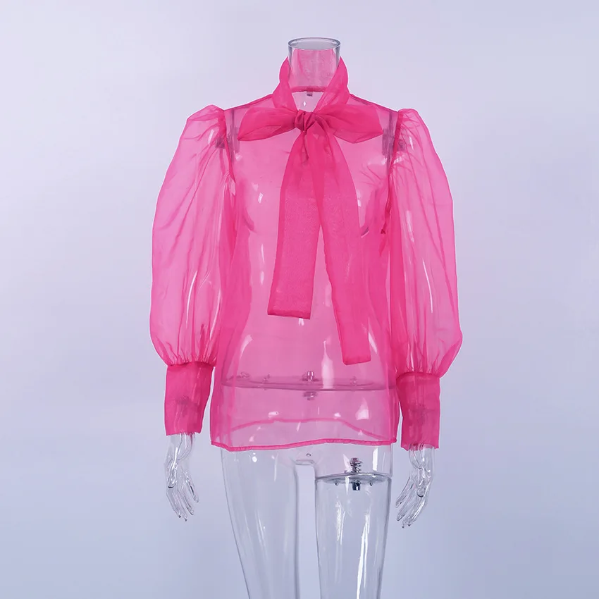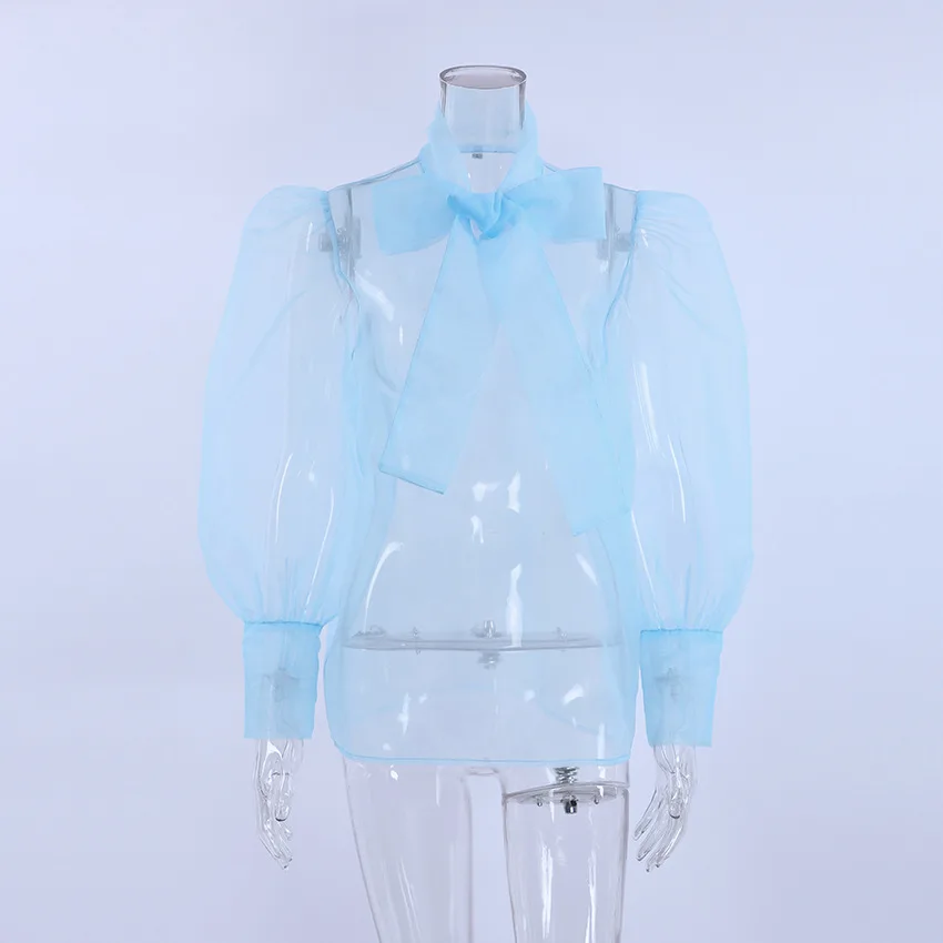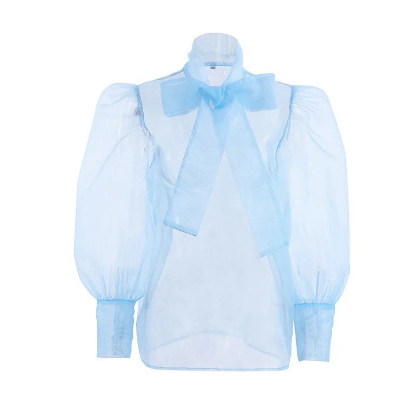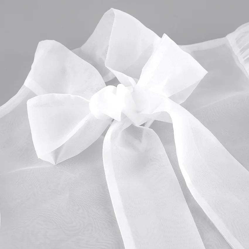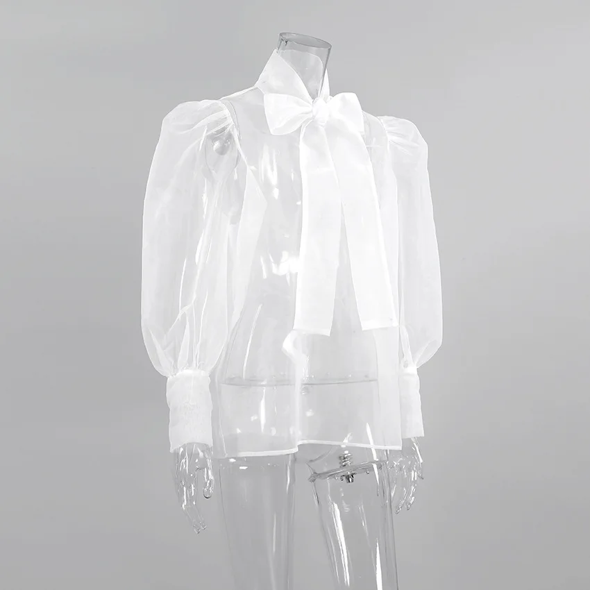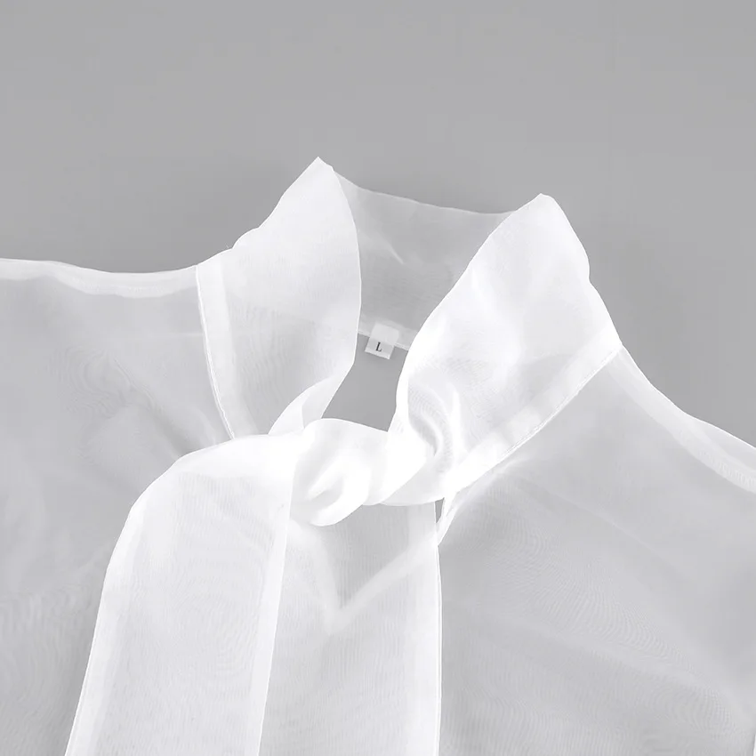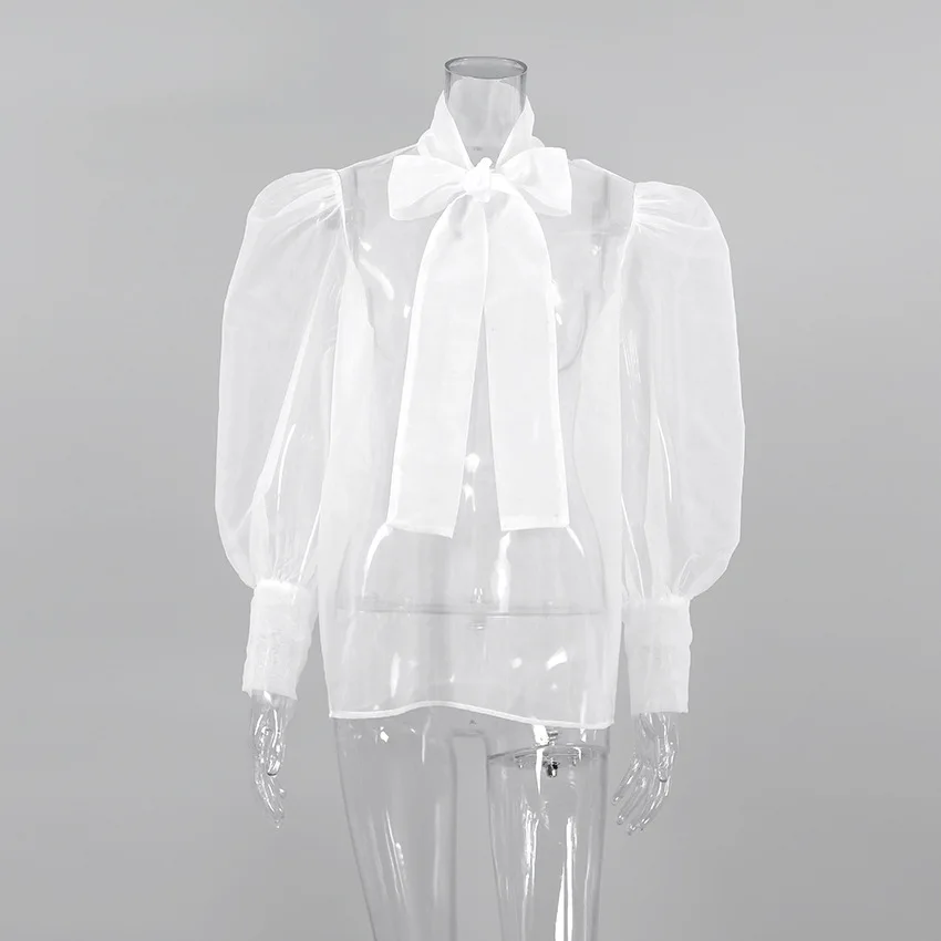 Yipinpay White Chiffon Top Shirts For Women Elegant Long Lantern Sleeve Mesh T-shirt See-Through Blouse Bow Sheer Ladies Shirts