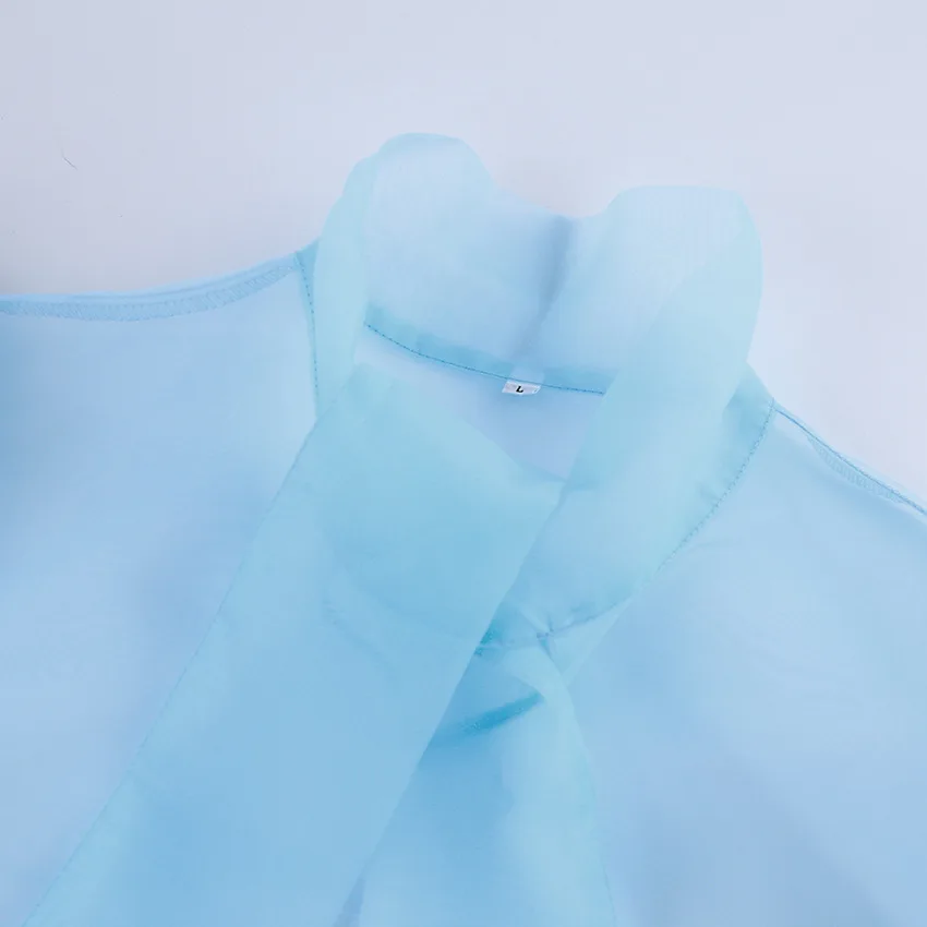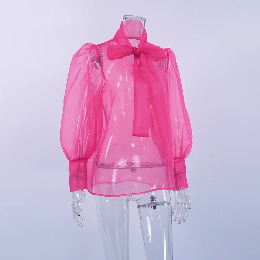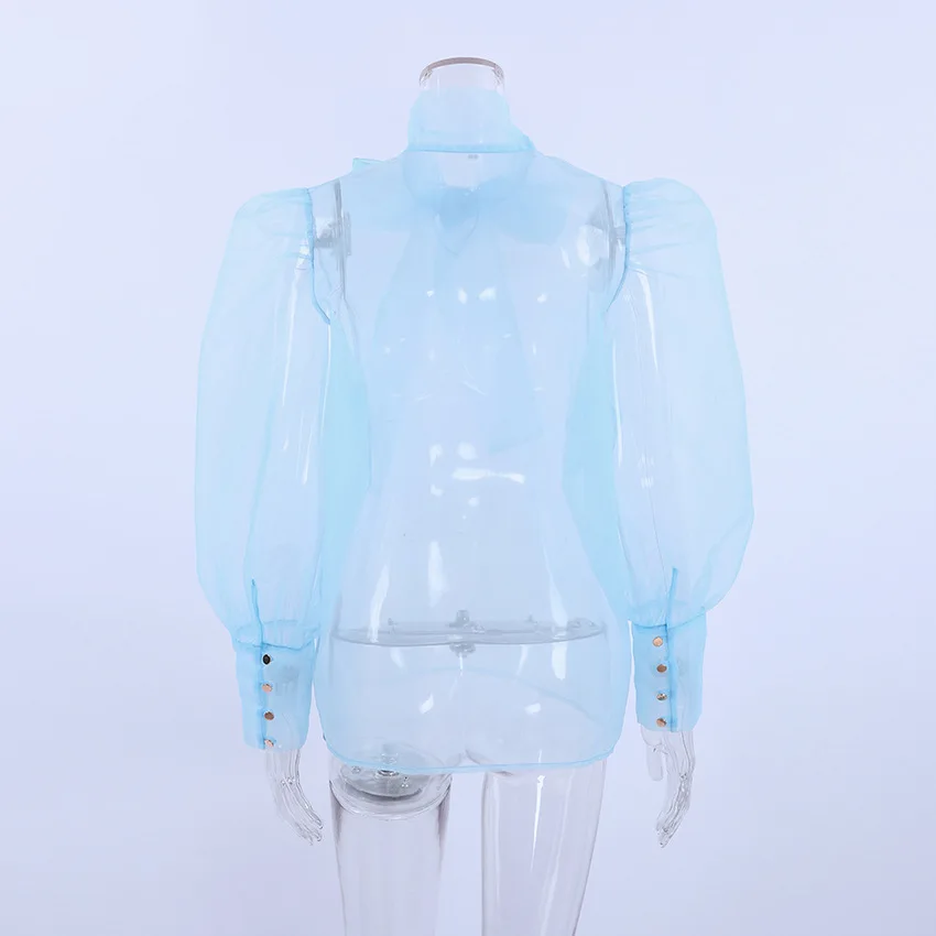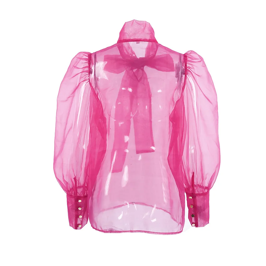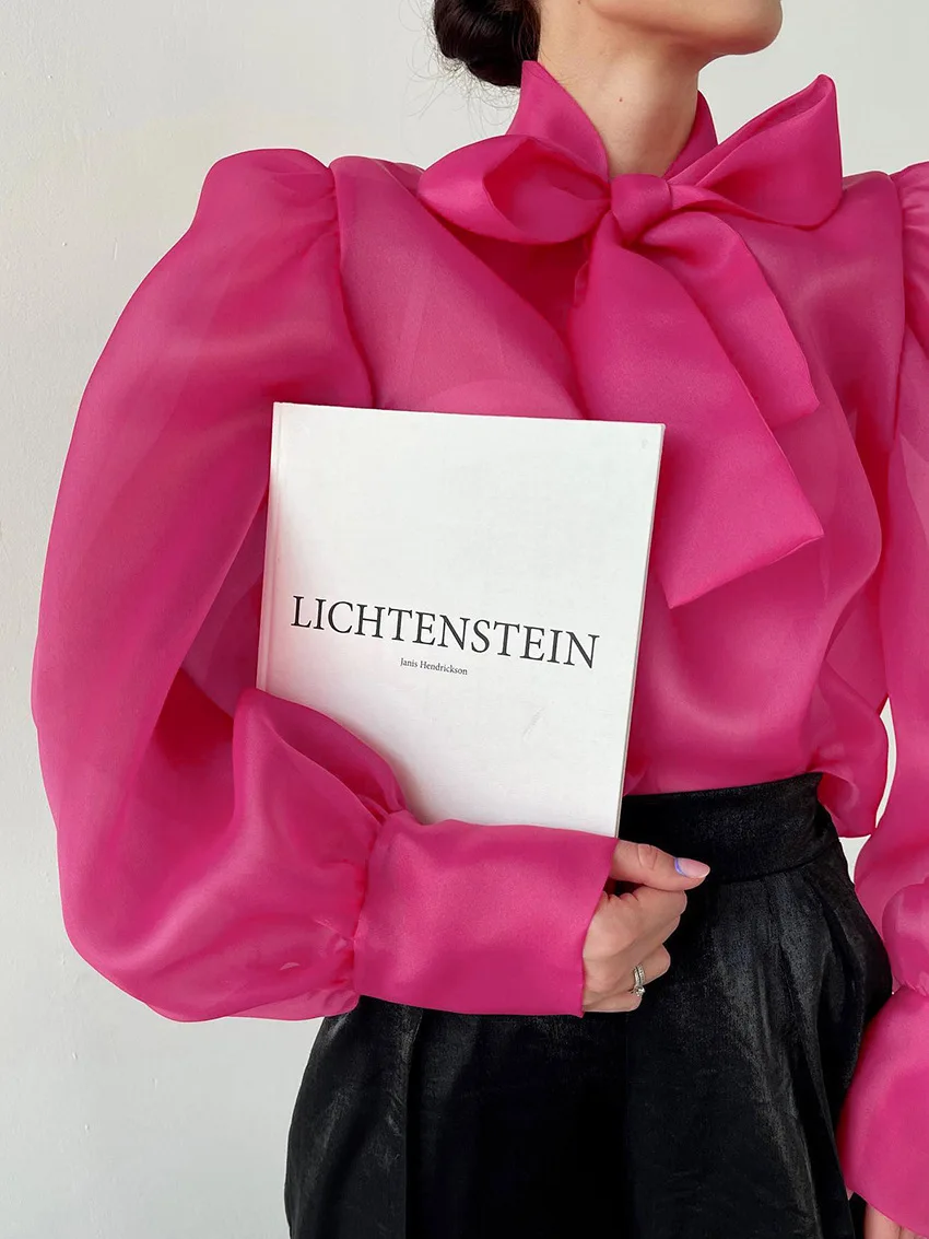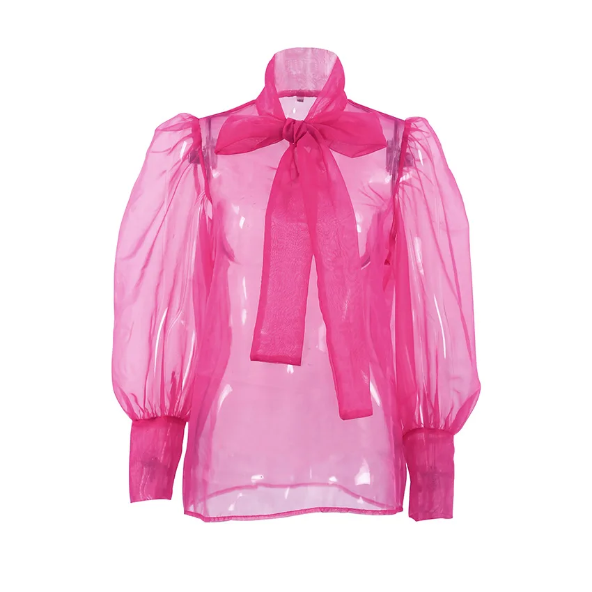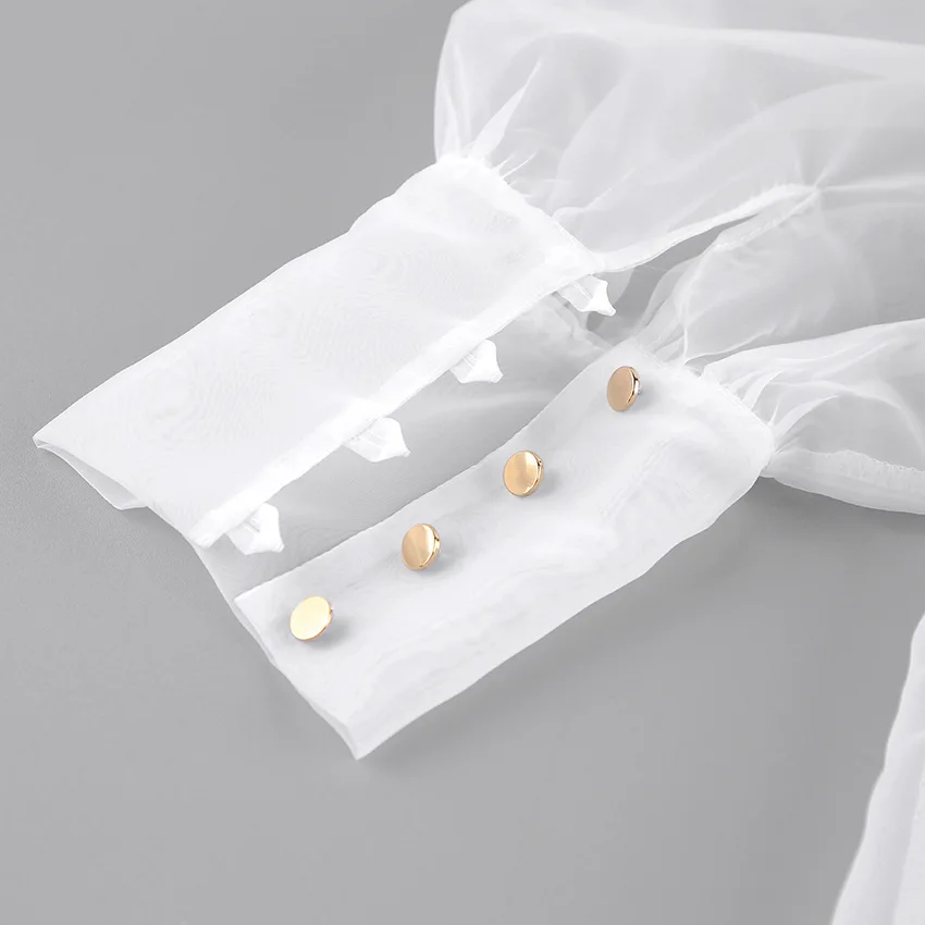 Yipinpay White Chiffon Top Shirts For Women Elegant Long Lantern Sleeve Mesh T-shirt See-Through Blouse Bow Sheer Ladies Shirts