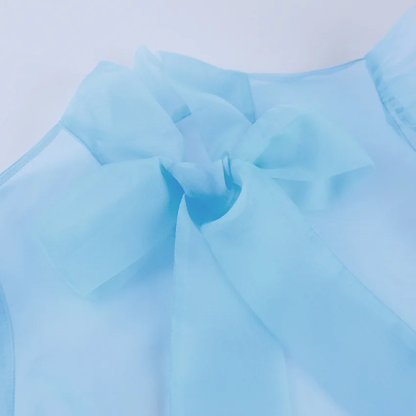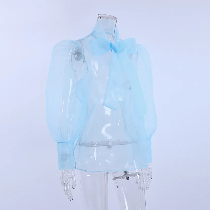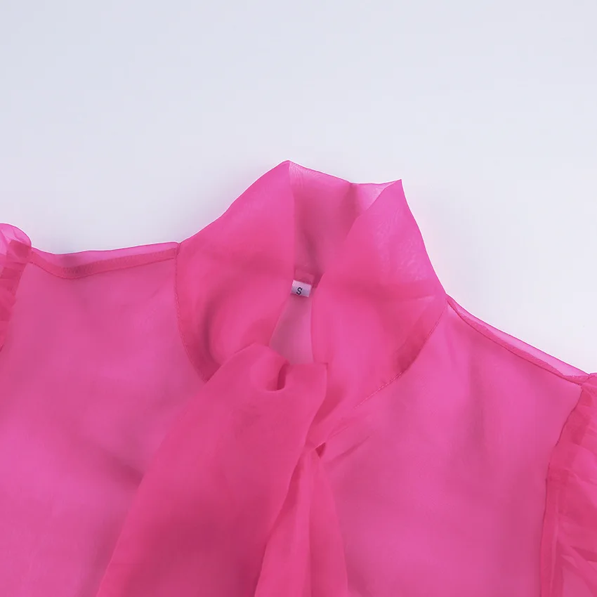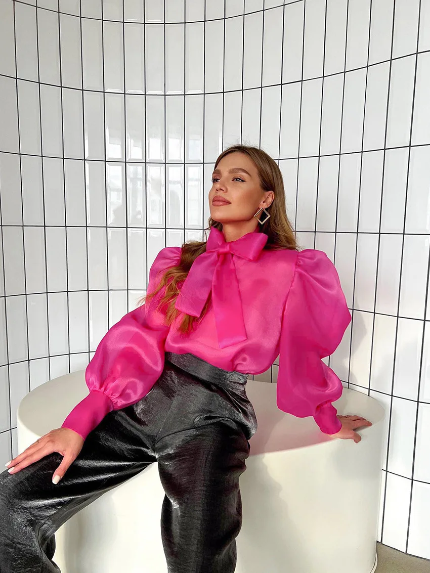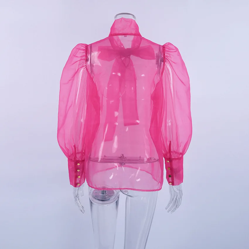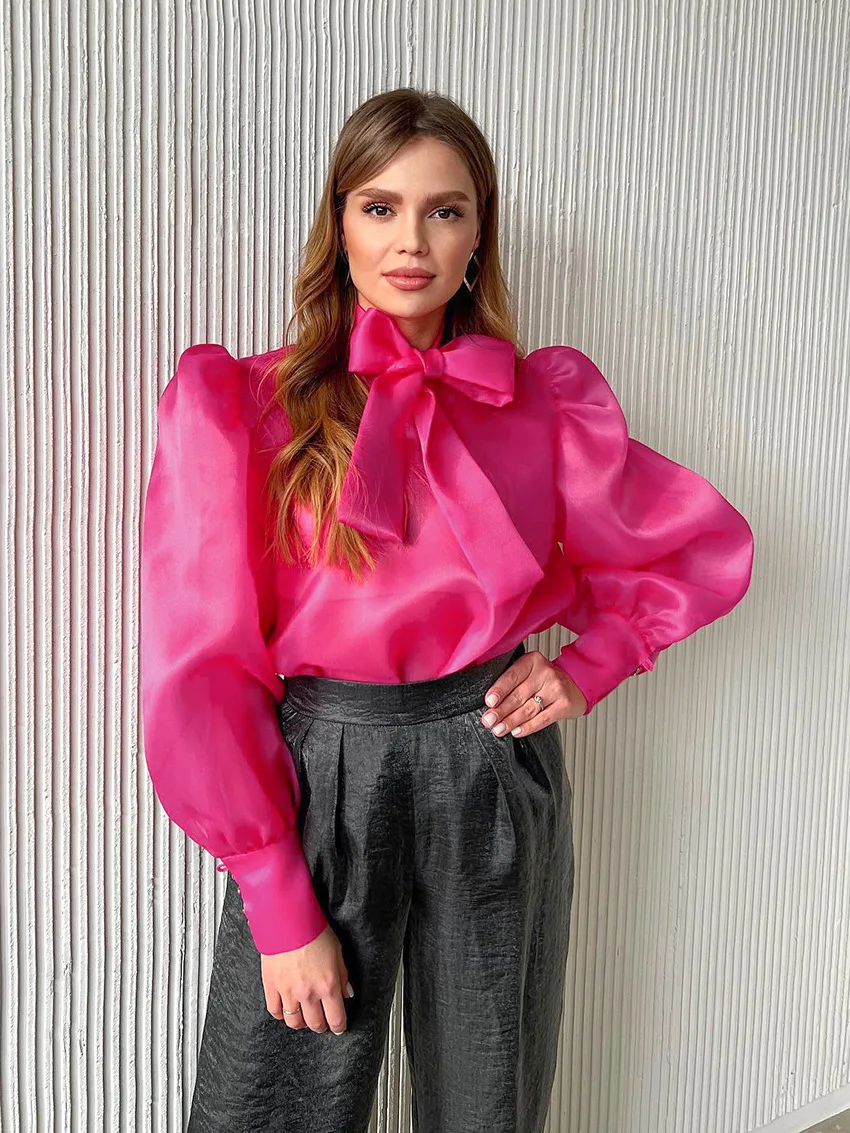 Yipinpay White Chiffon Top Shirts For Women Elegant Long Lantern Sleeve Mesh T-shirt See-Through Blouse Bow Sheer Ladies Shirts