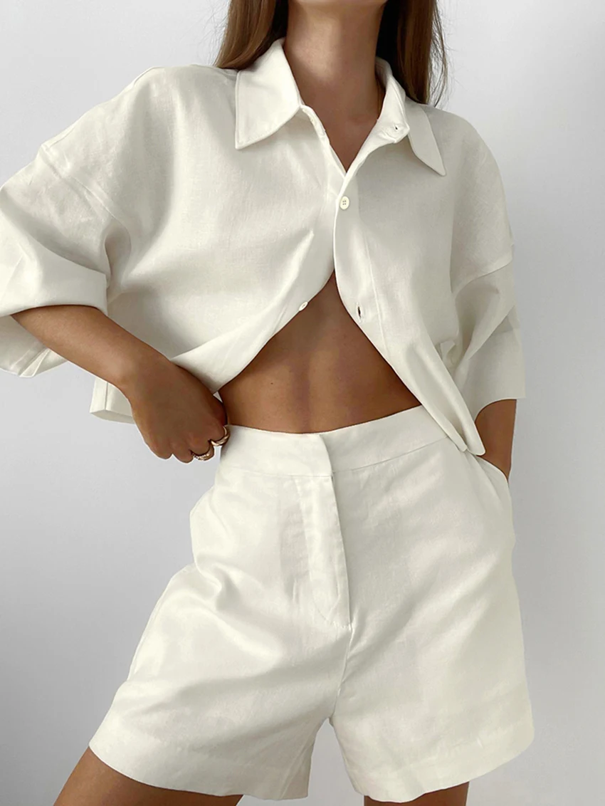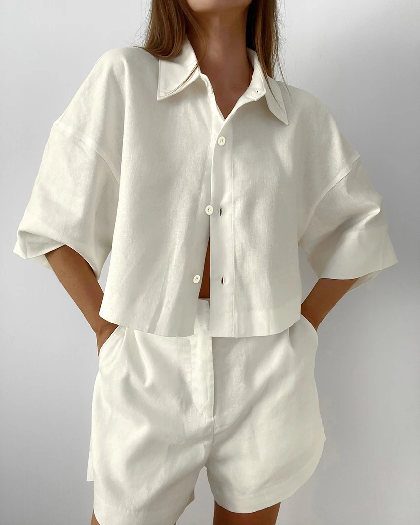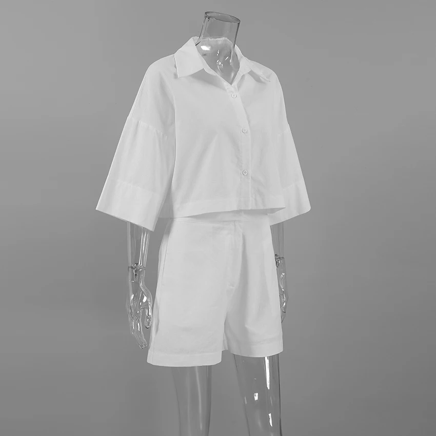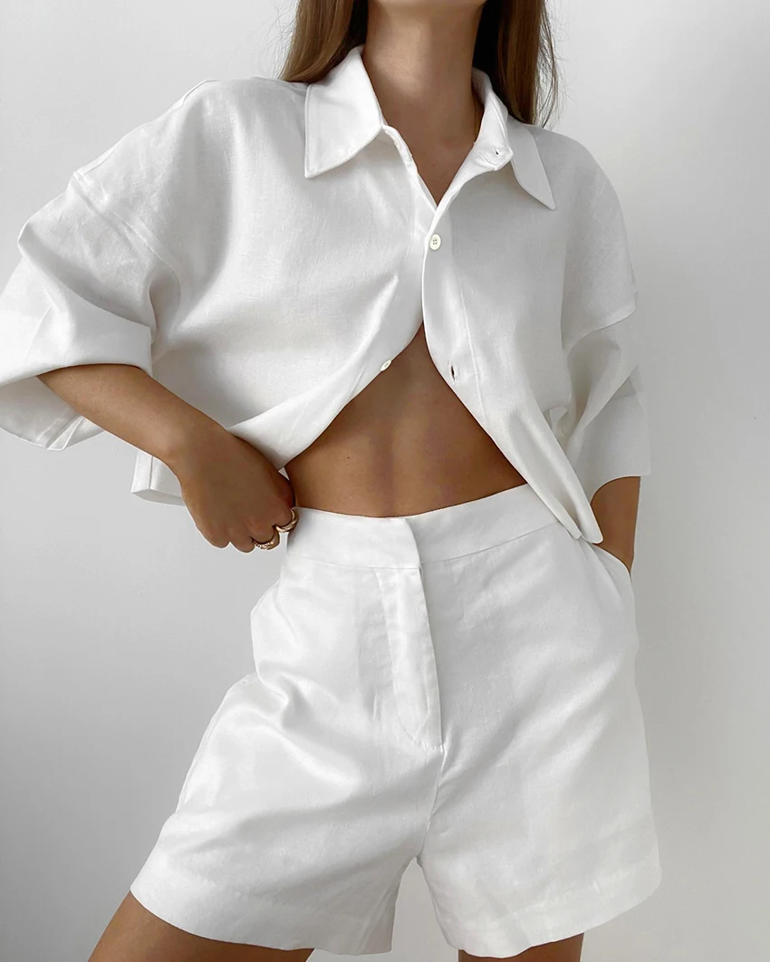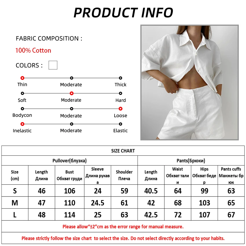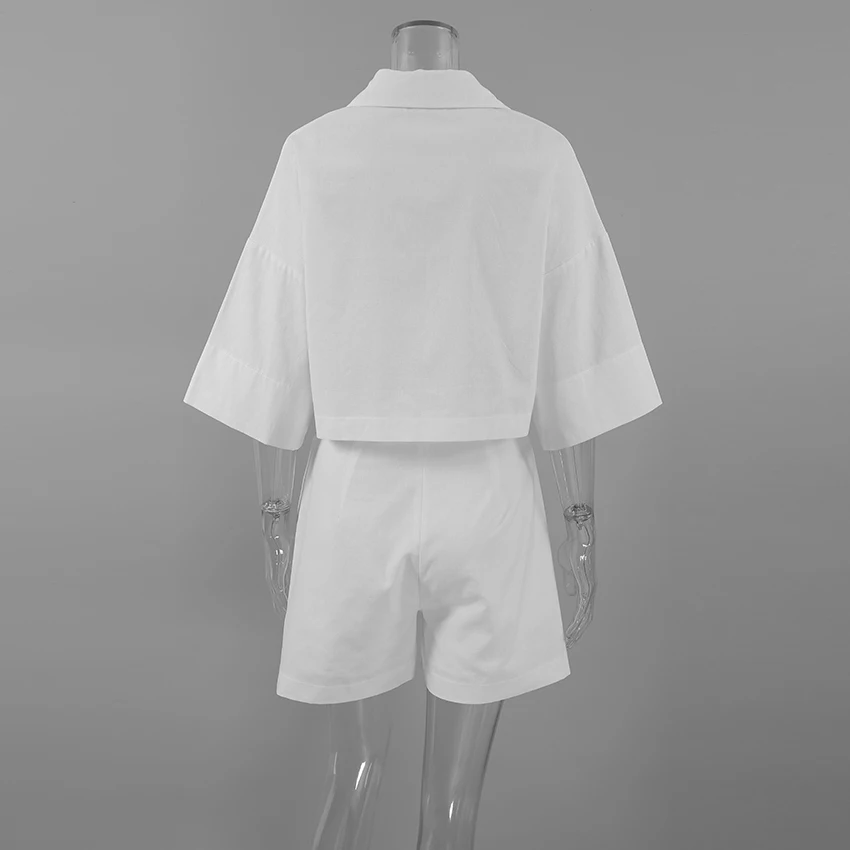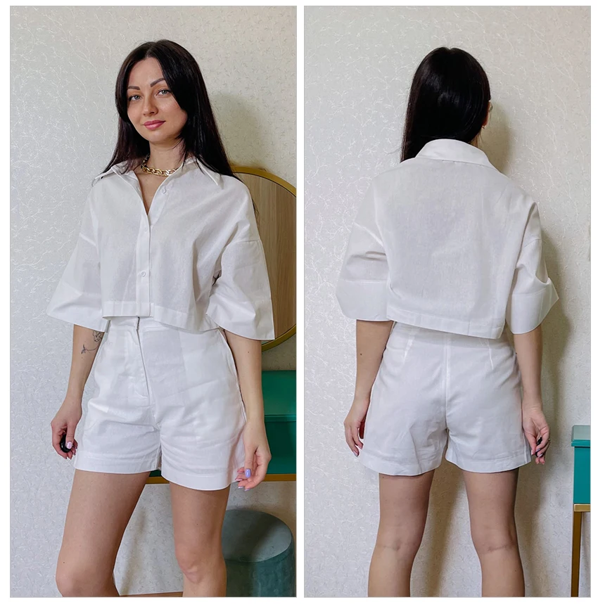 Yipinpay White Cotton Linen Shorts Sets 2-Piece Street Outfits Short Sleeve Shirt And Wide Leg Shorts Summer 2023 Ladies Suit