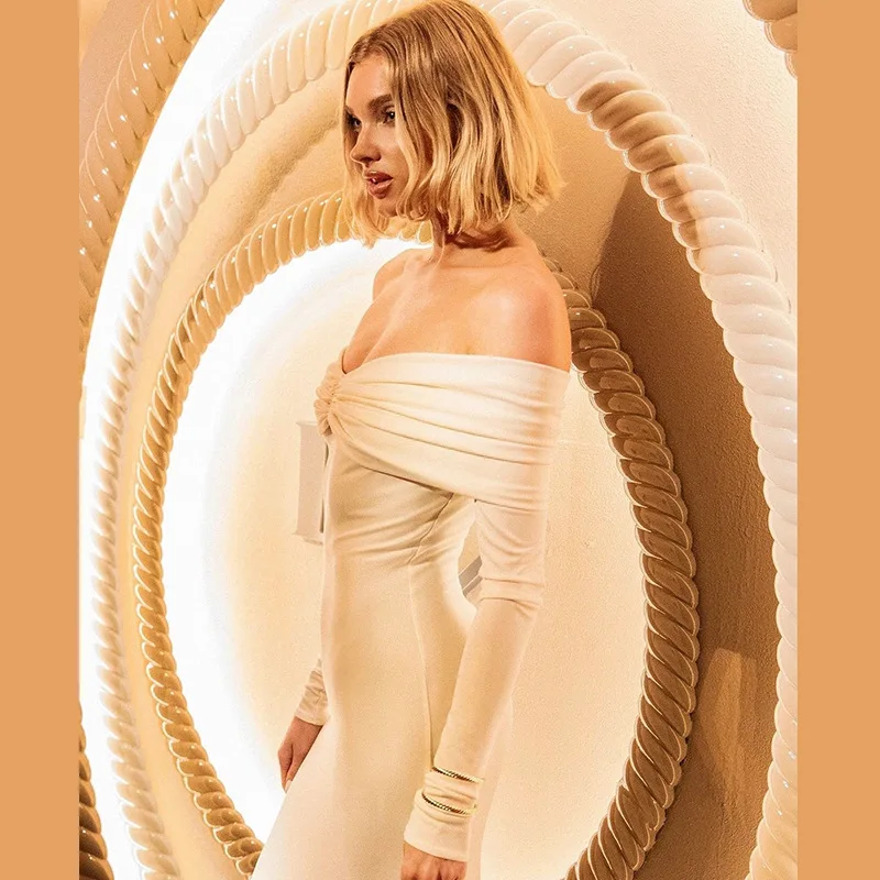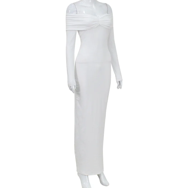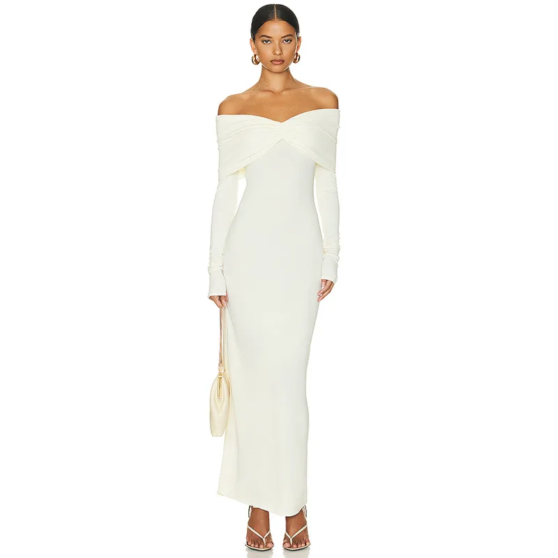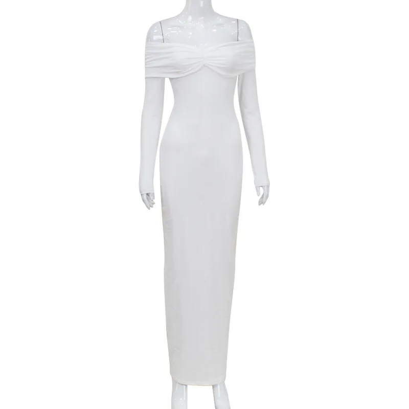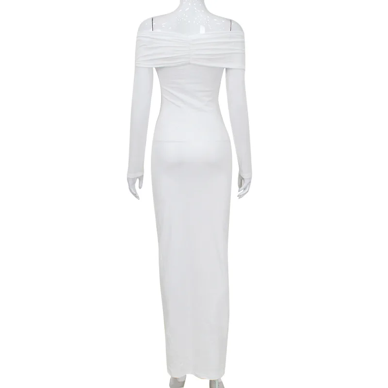 Yipinpay White Pleated Slim Maxi Dress Elegant For Women Patchwork Off-Shoulder Fashion High Waist Dress Ladies Solid Party Dress