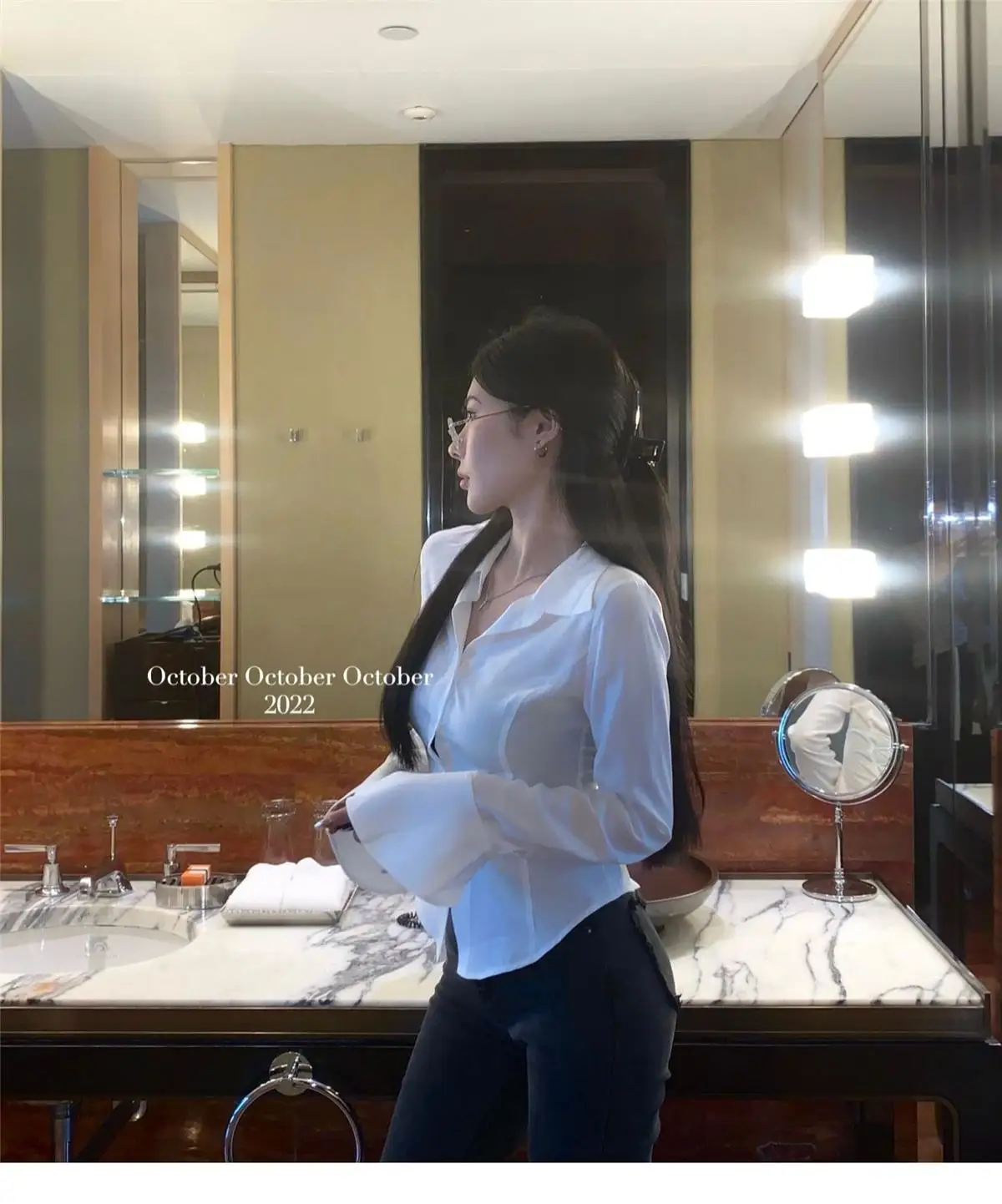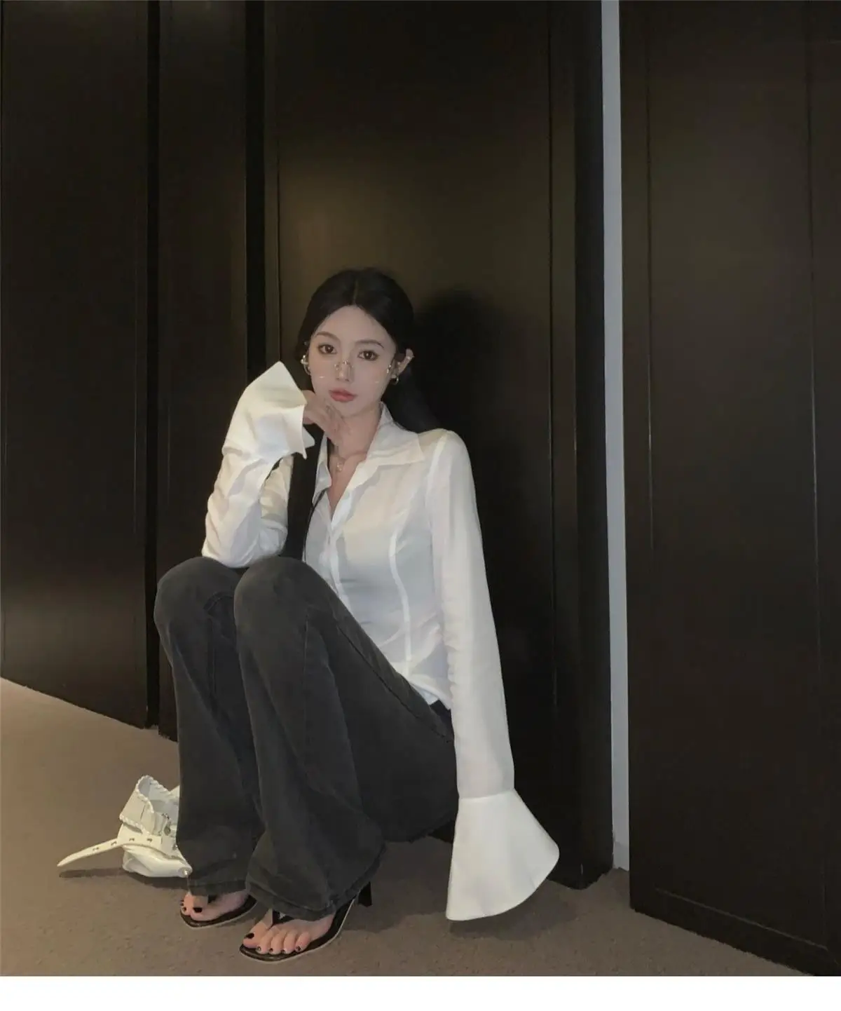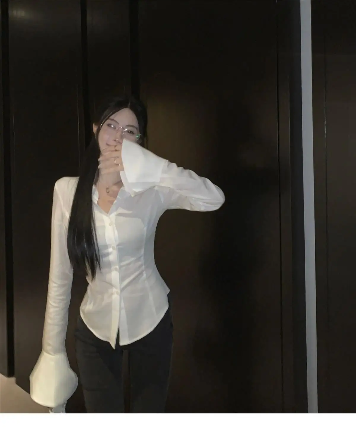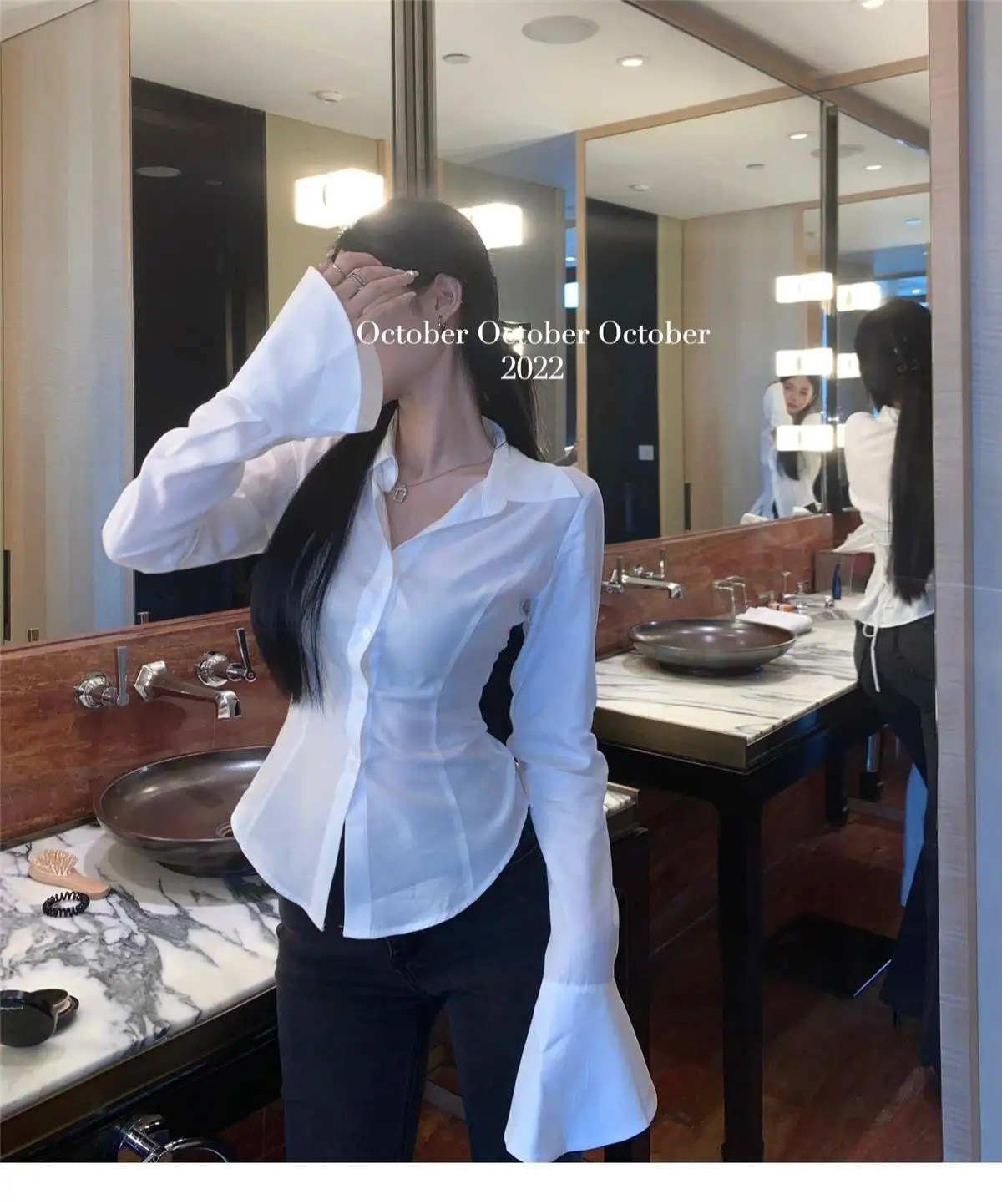Yipinpay White Shirt Women Slim Waist Flare Sleeve Tops Blusas Mujer Spring Sexy Y2k Airycore Aesthetics Blouse 2023 Black Shirts