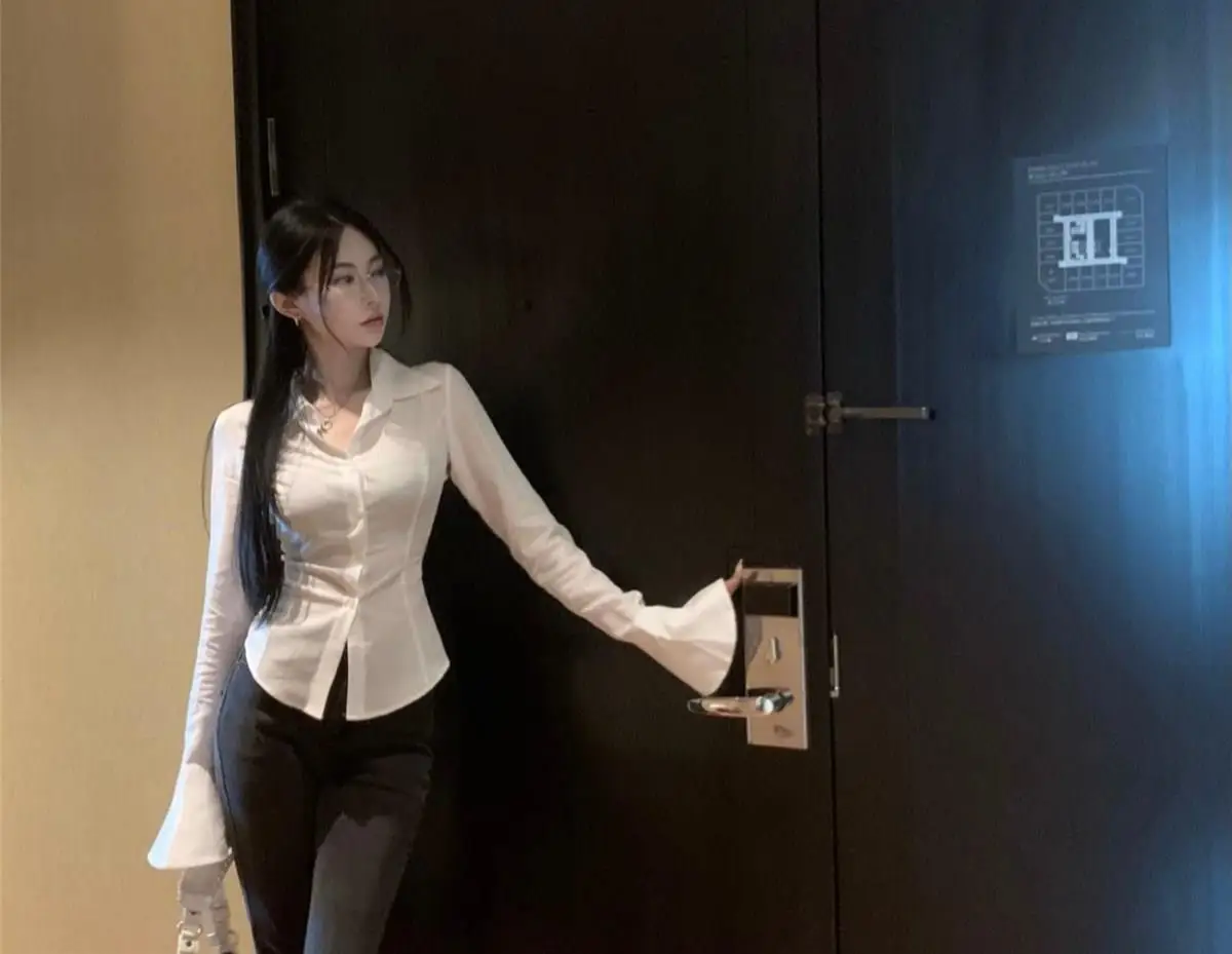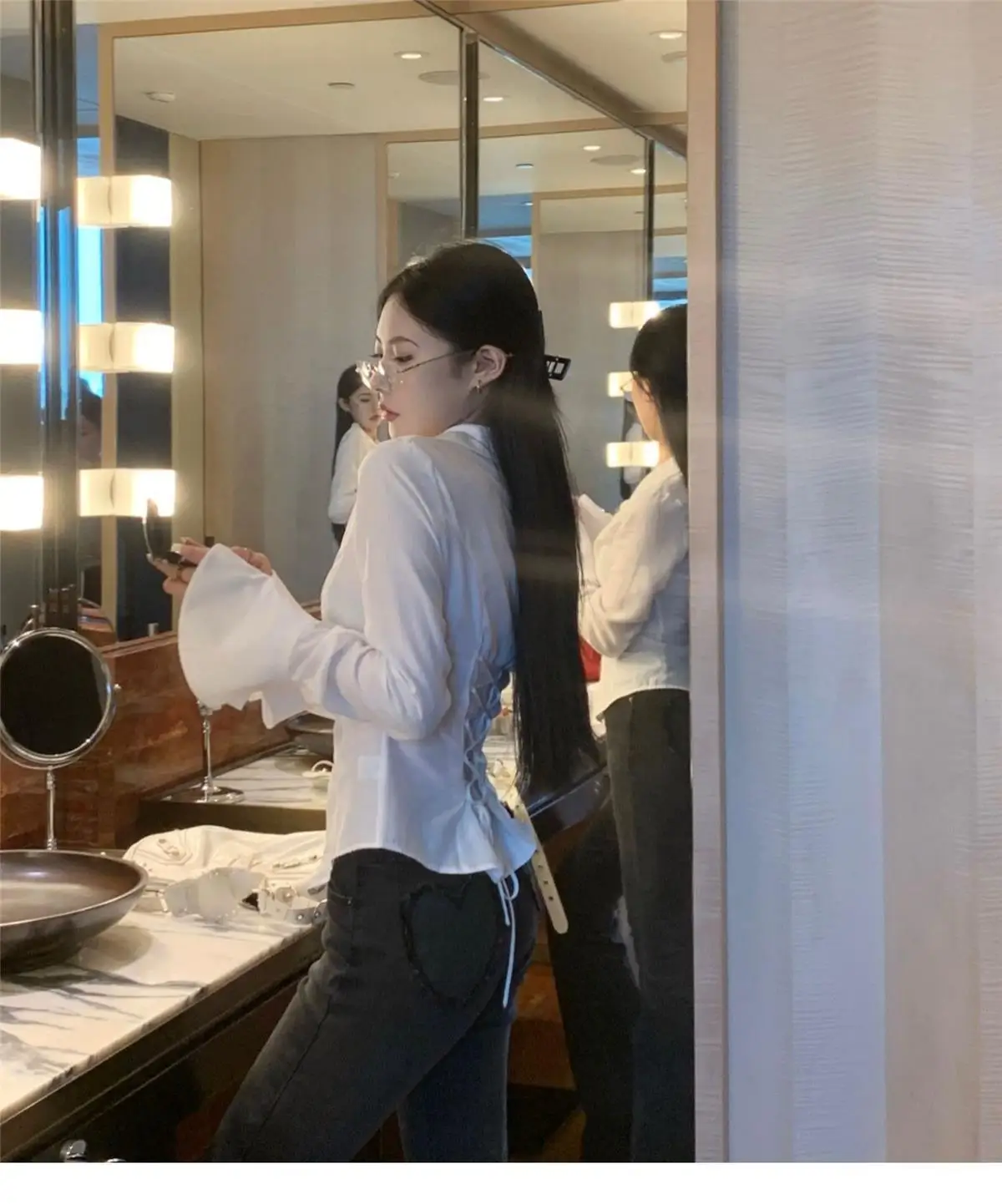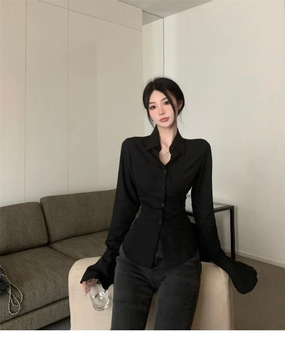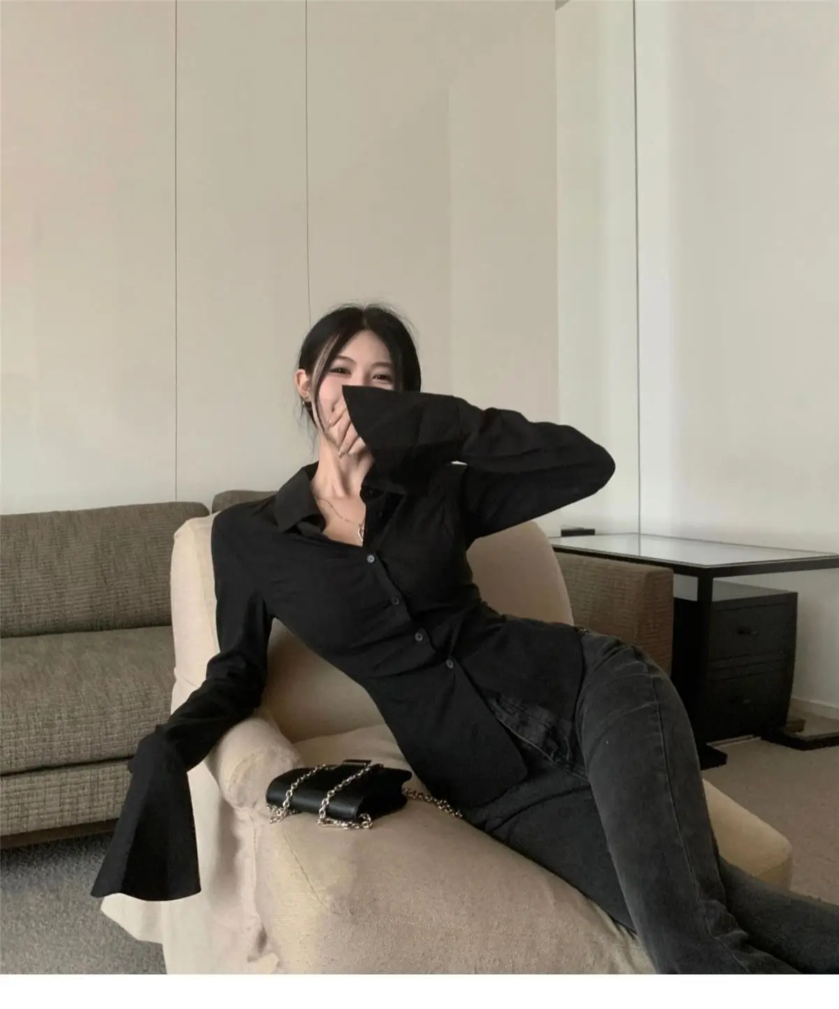 Yipinpay White Shirt Women Slim Waist Flare Sleeve Tops Blusas Mujer Spring Sexy Y2k Airycore Aesthetics Blouse 2023 Black Shirts