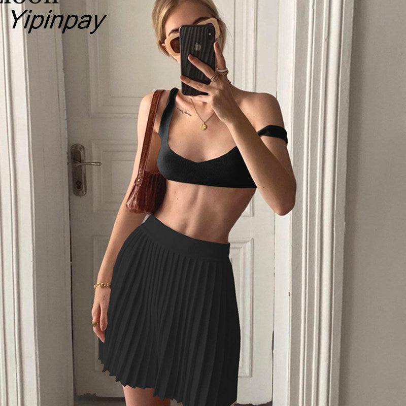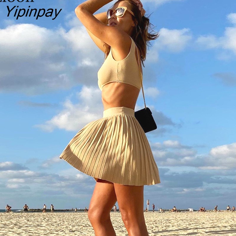Yipinpay White Two Piece Set For Women Summer 2023 Camisole Tops and Pleated Skirts Sleeveless Backless Outfits Knitted Skirt Sets