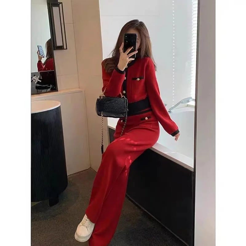 Yipinpay White Wide Leg Pants Suits Vintage Fall O Neck Red Cardigan Knitwear Sweaters Korean Fashion Two Piece Sets Coat