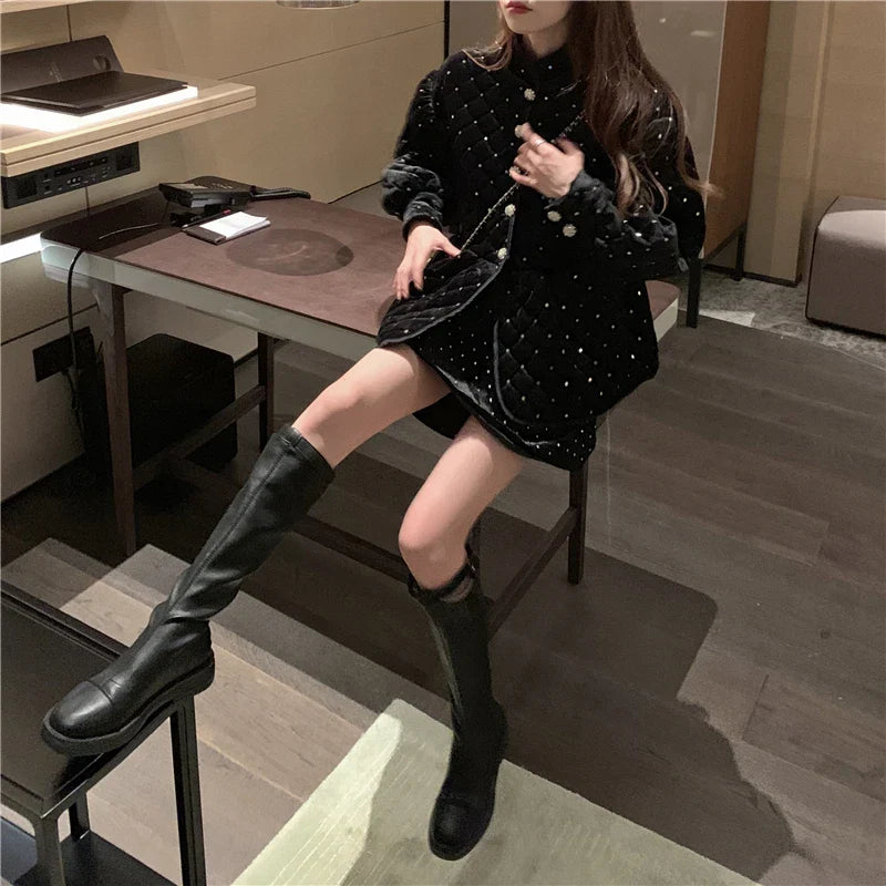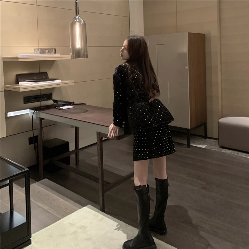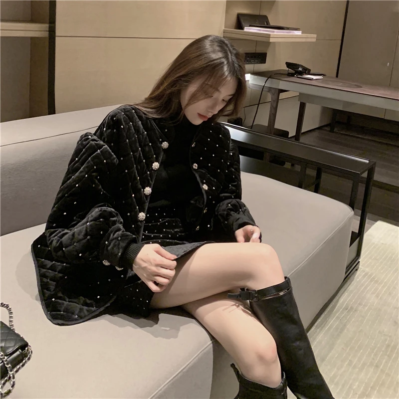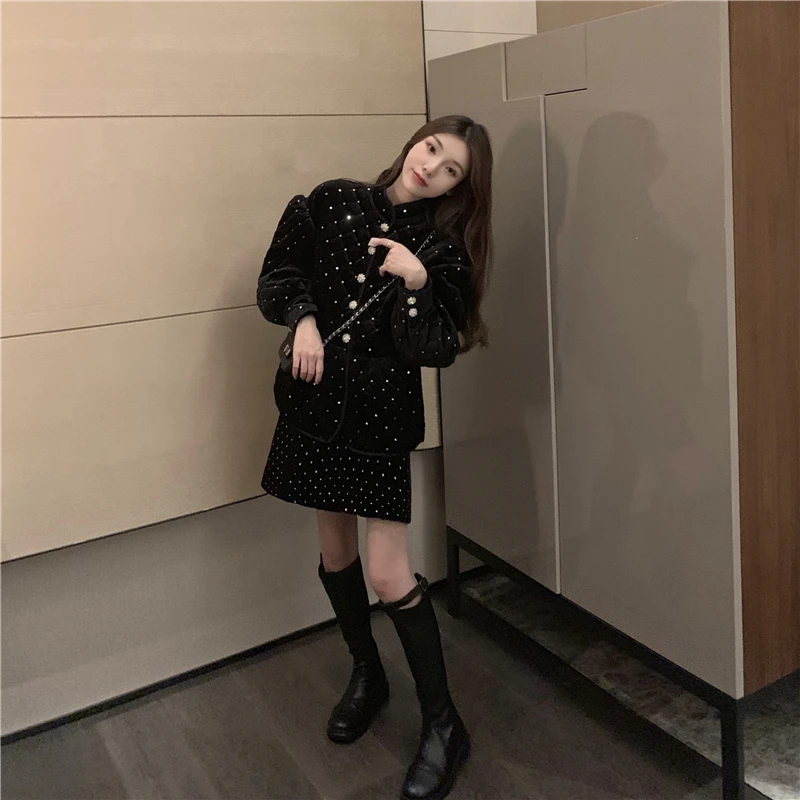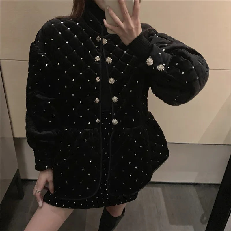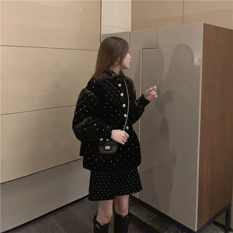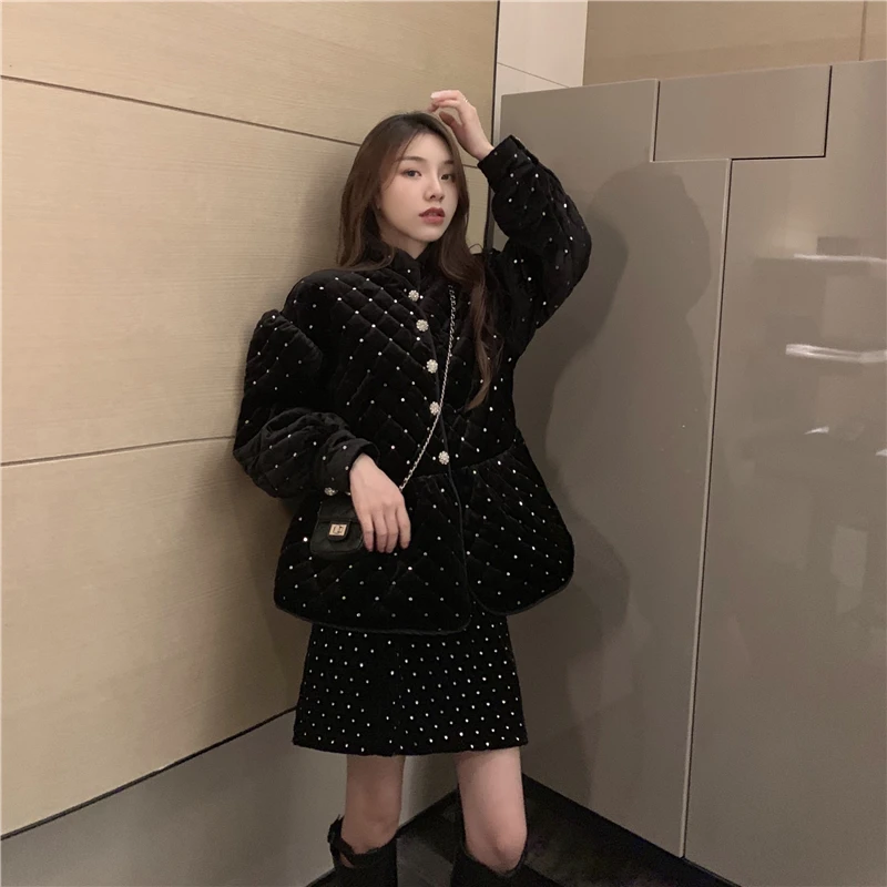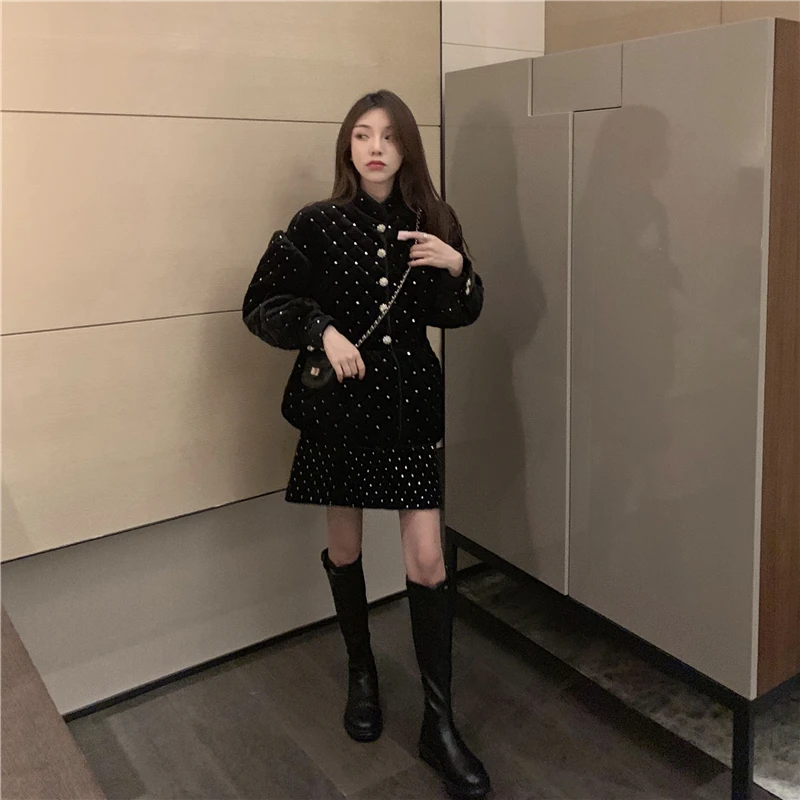 Yipinpay Winter Black Parkas Thick Velvet Jacket Fashion Coat Mini Polka Dot Skirts Sequins Quilted Cotton 2 Piece Sets Chic