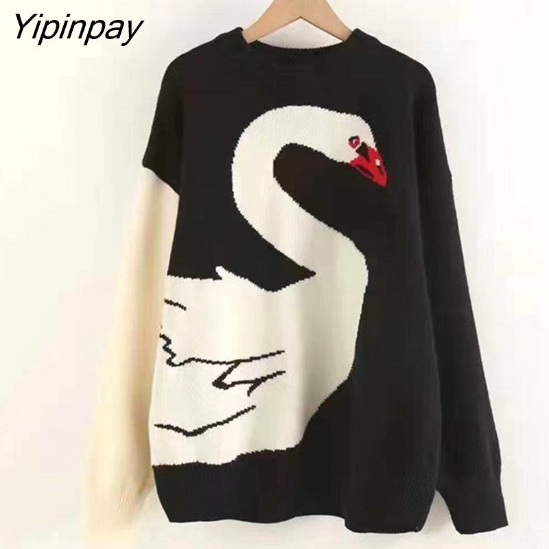 Yipinpay Winter Casual Black Swan Embroidery Women Loose Sweater Y2K Long Sleeve O Neck Patchowrk Knit Ladies Pullovers Fashion Tops