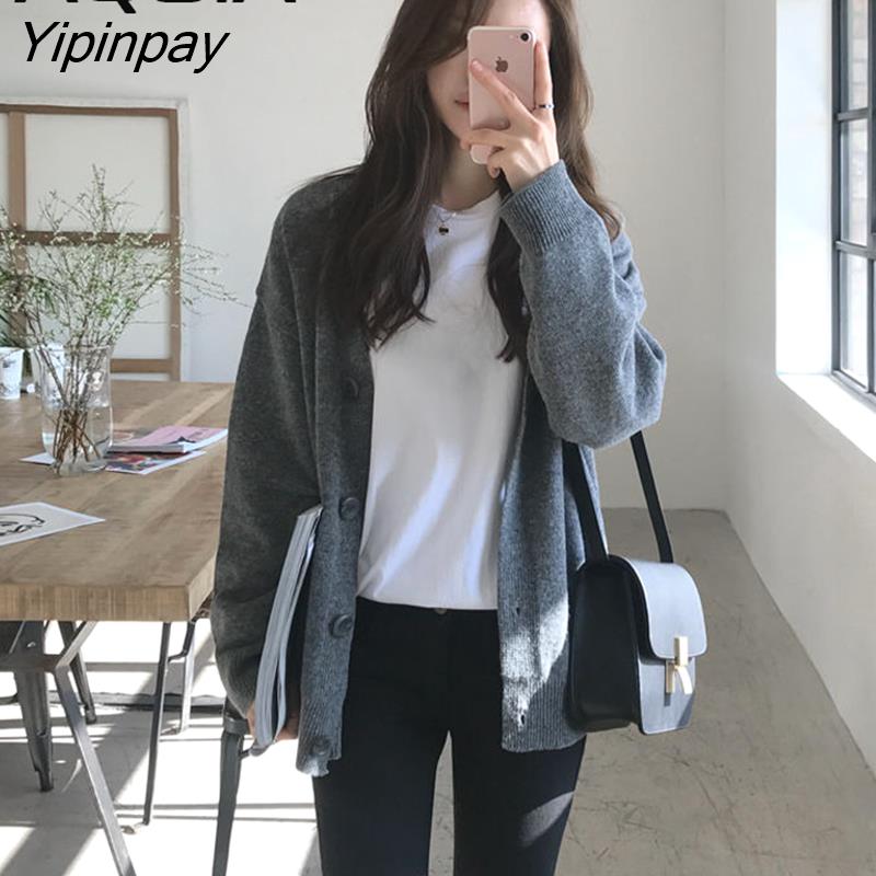 Yipinpay winter Korean style Solid Color Women Knitted Sweaters Cardigans Long Sleeve Button Up Loose Plus Size Female Sweater