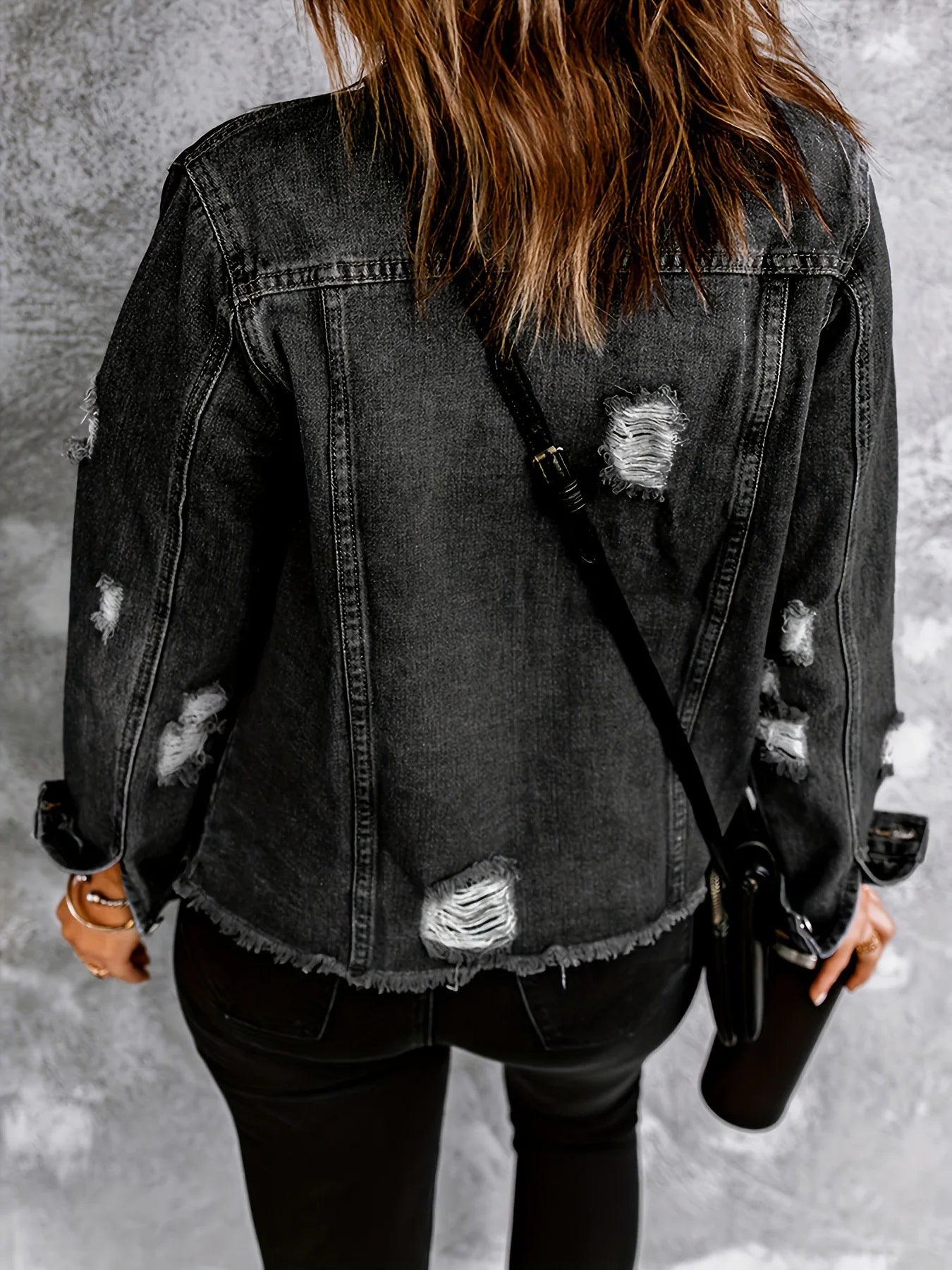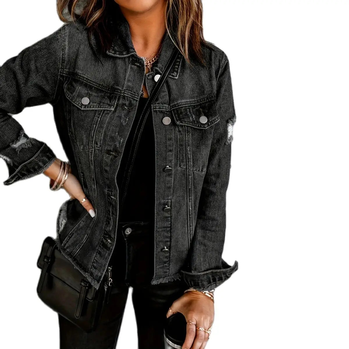 Yipinpay Winter New Women's Black Ripped Denim Jacket Fashion Long Sleeve Slim Raw Edge Jeans Coat Casual Women's Clothing XS-L