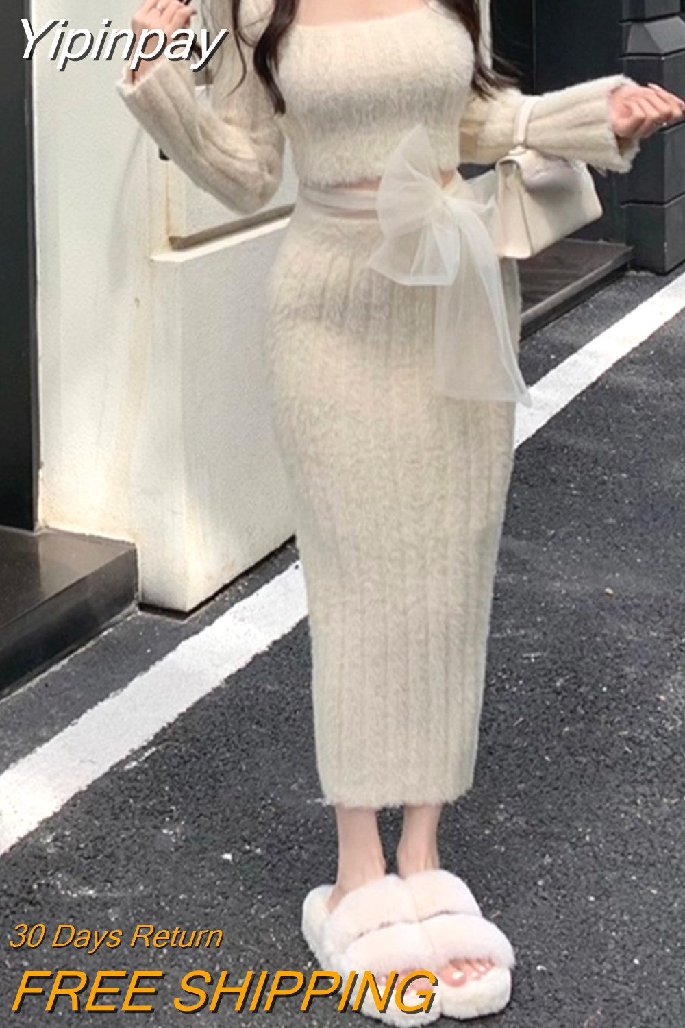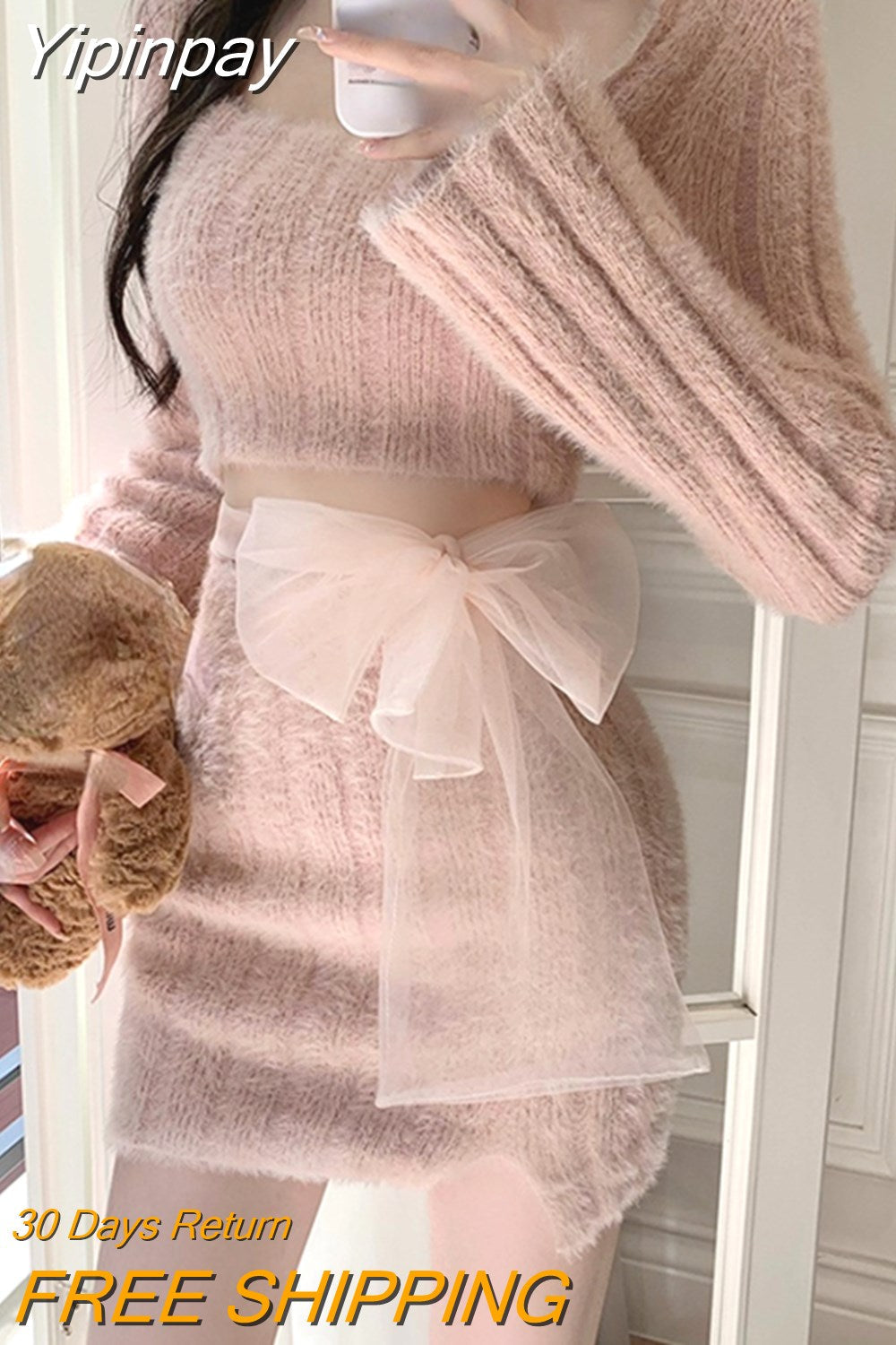 Yipinpay Winter Pink Kawaii Y2k Mini Dress Faux Fur Slim Sexy Bodycon Knitted Dress Woman Elegant One Piece Dress Korean Fashion