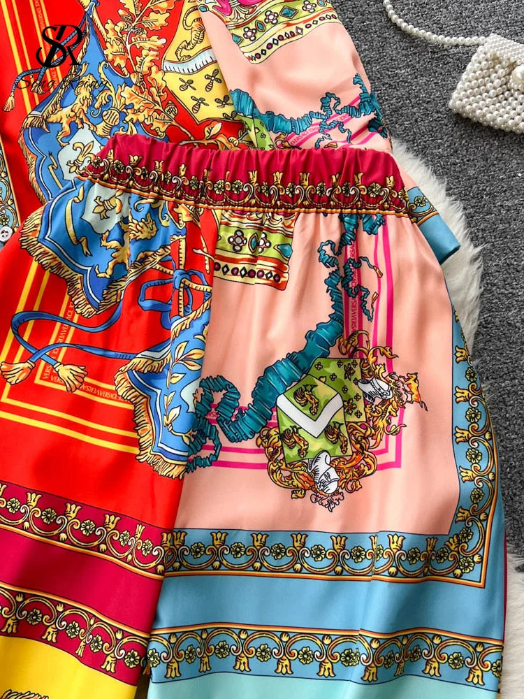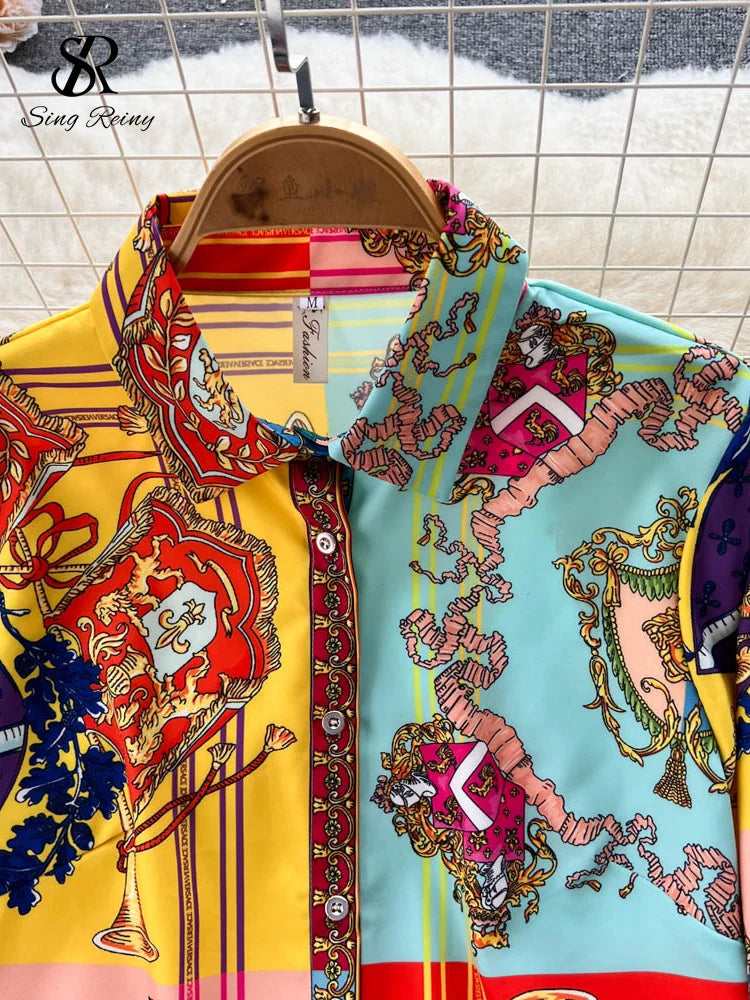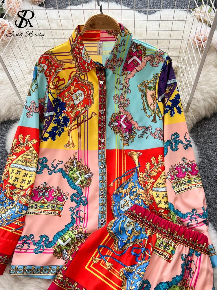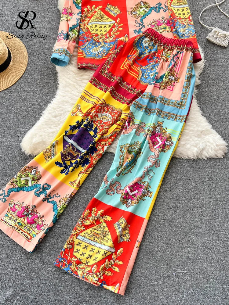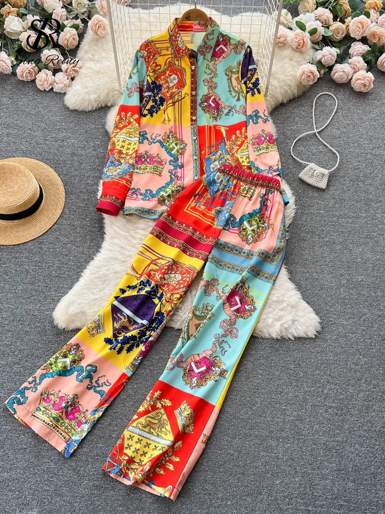 Yipinpay Winter Vintage Print Two Pieces Suits Lapel Long Sleeve Shirt Top+Wide Leg Casual Long Pant 2024 Female Fashion Sets