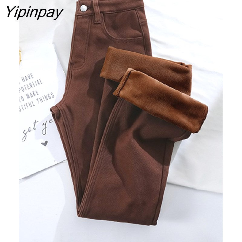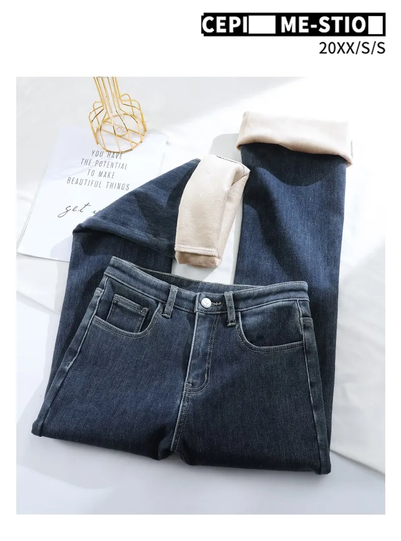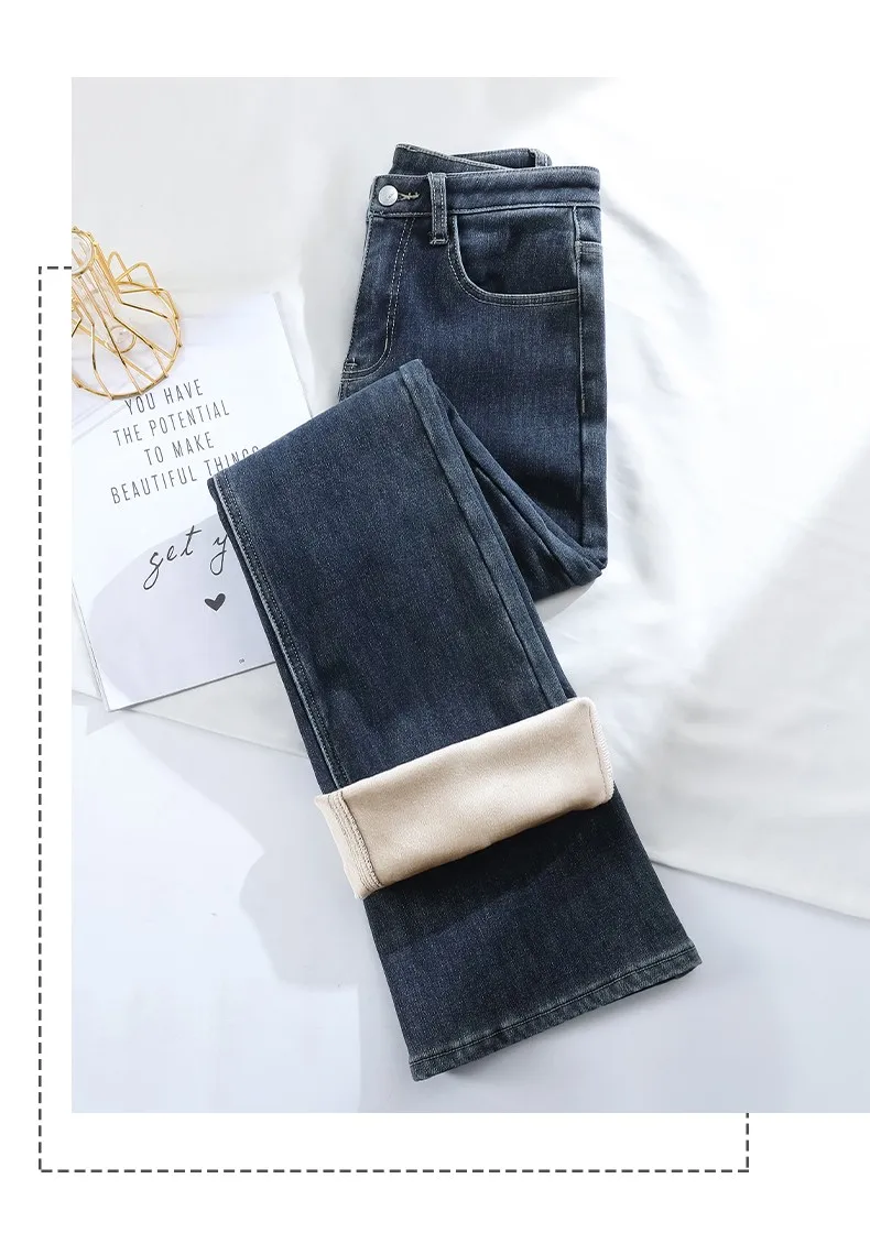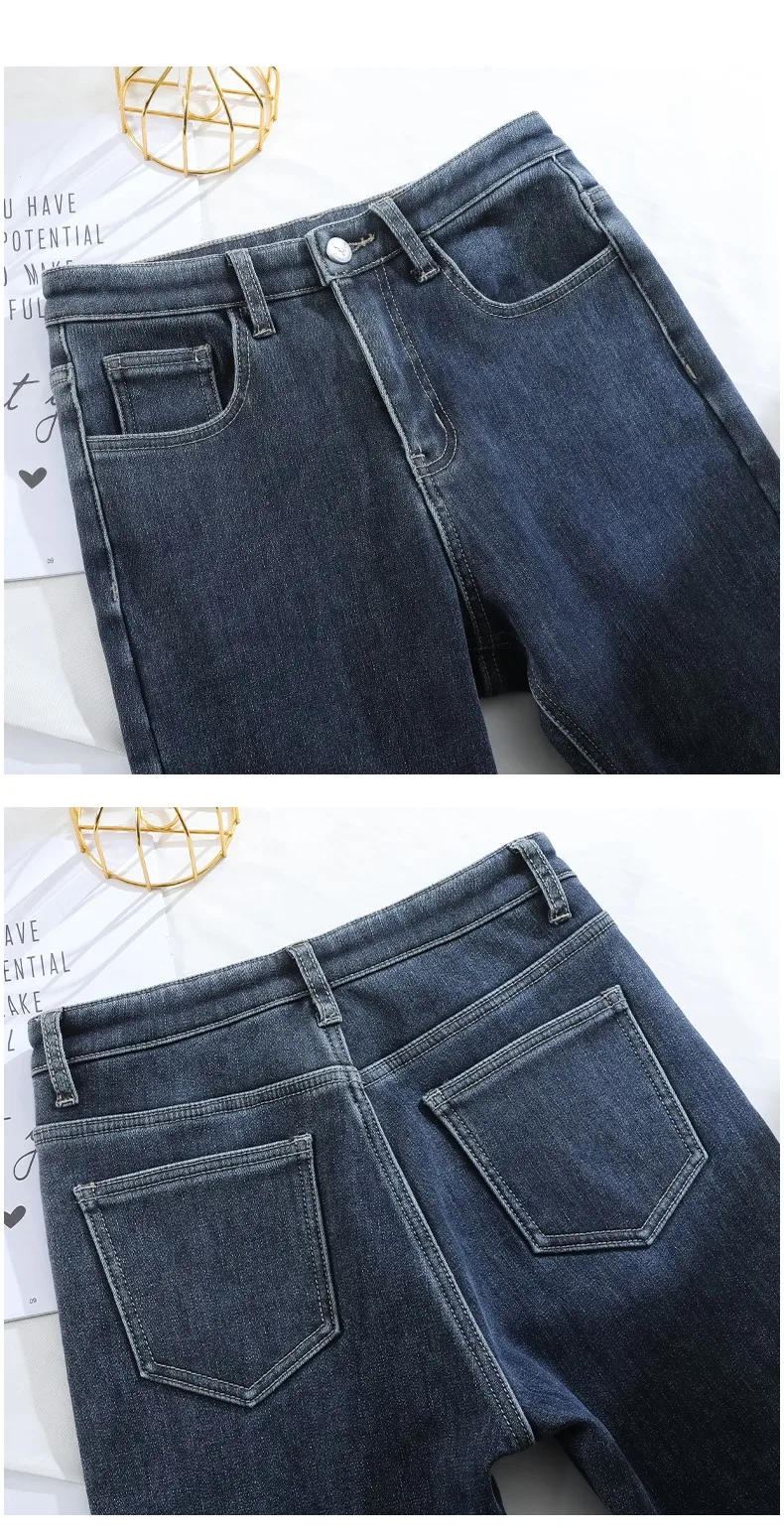 Yipinpay Winter Warm High Waist High Elastic Thickened Mini Flare Jeans Woman Lengthened Plus Velvet