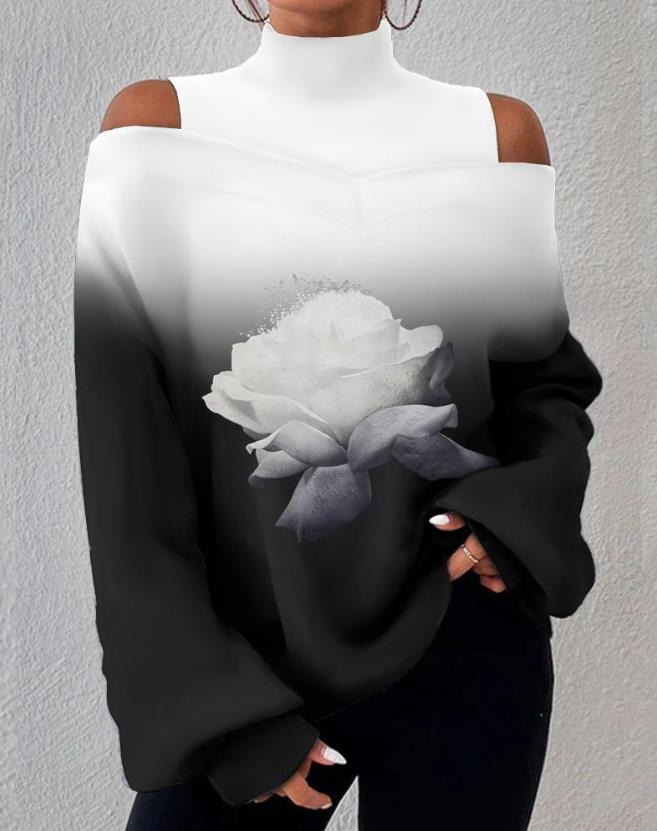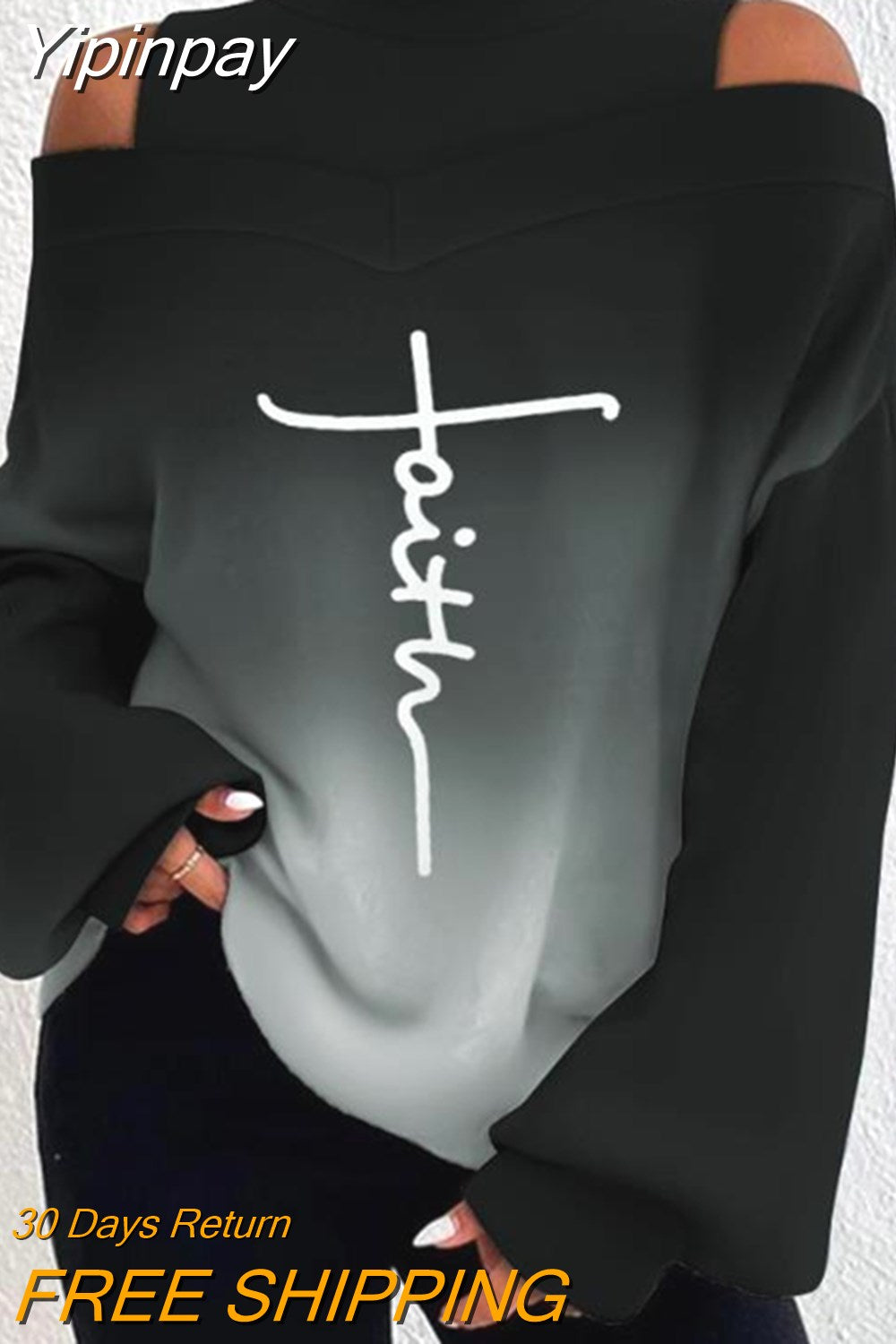 Yipinpay Woman Blouses Shirt Letter Ombre Print Cold Shoulder Lantern Sleeve Pullover Top Autumn Winter New Female Casual