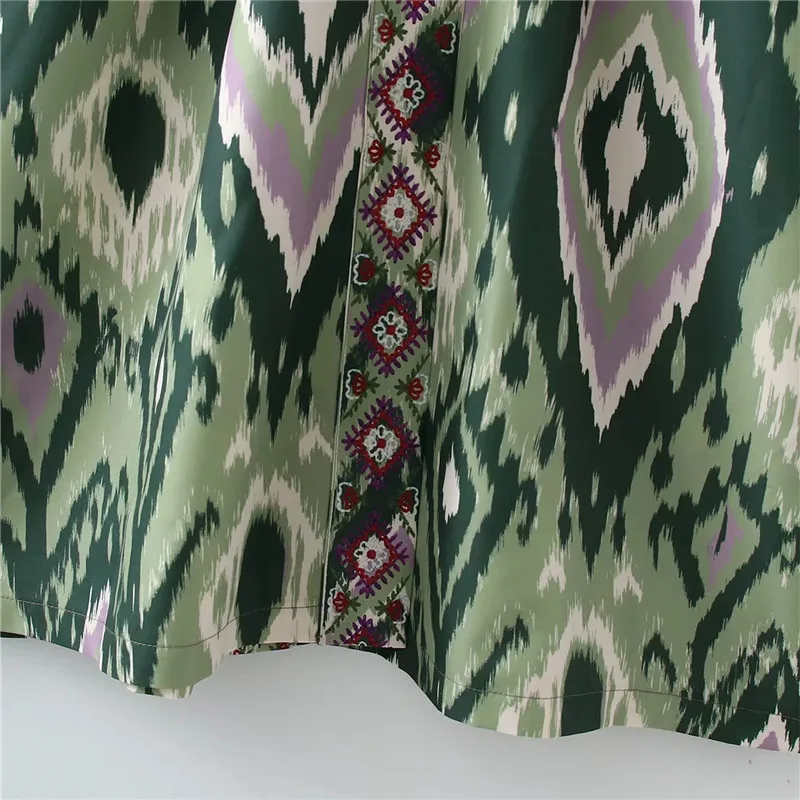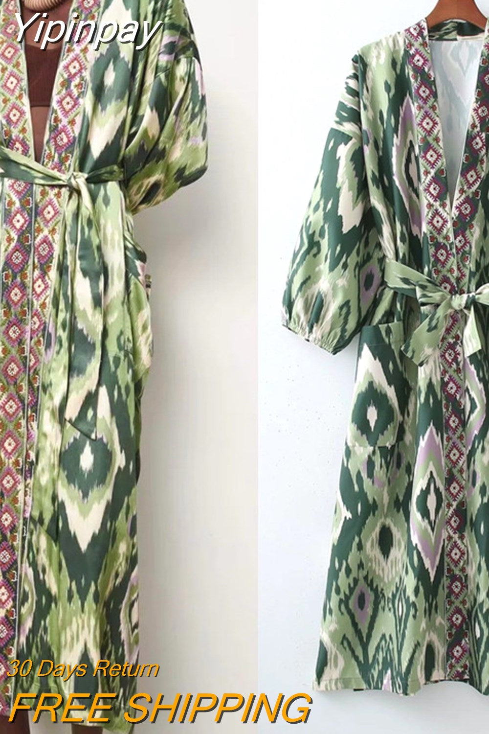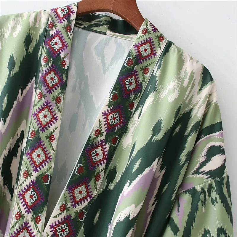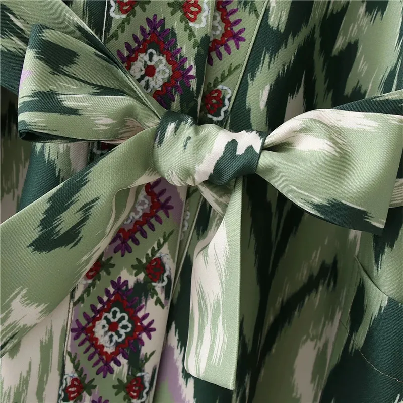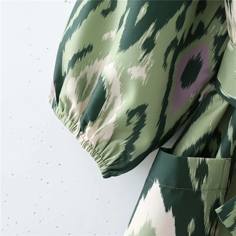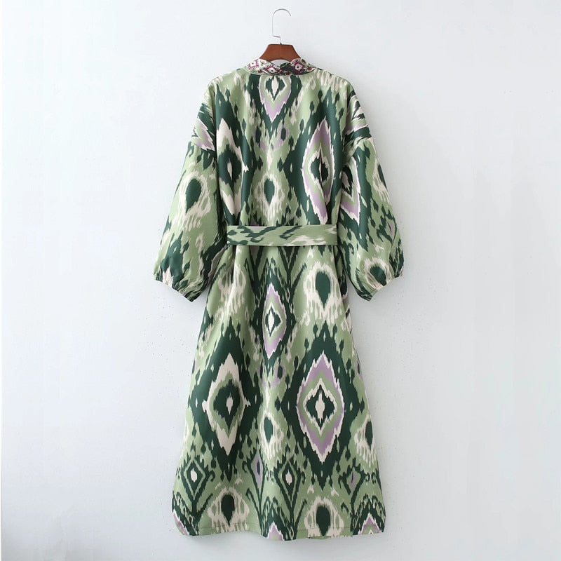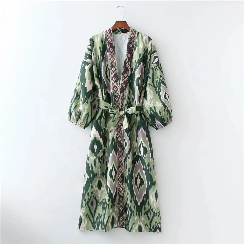 Yipinpay Woman Dress Green Print Midi Kimono Dress Women Summer 2023 Belt Long Puff Sleeve Japanese Style Wrap Long Dresses
