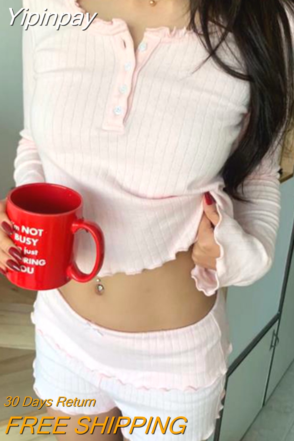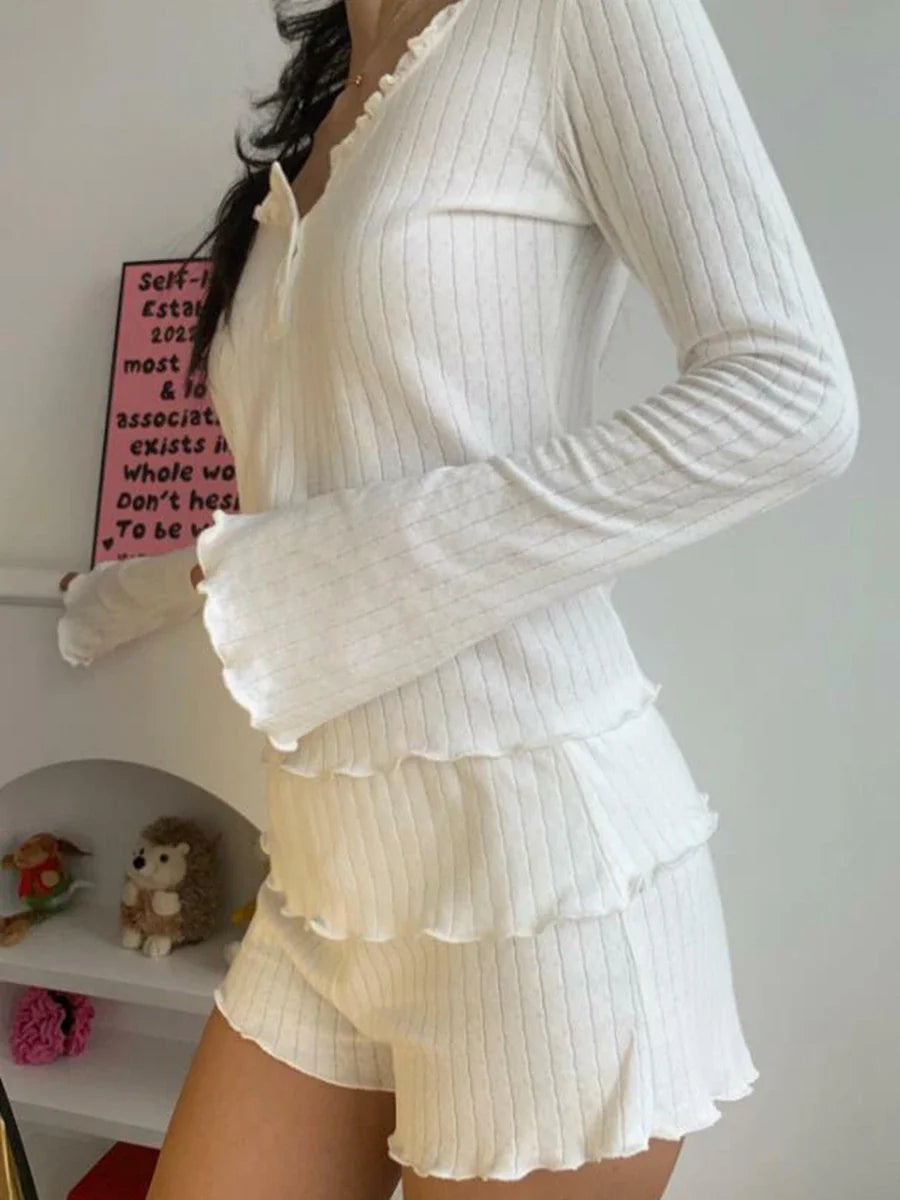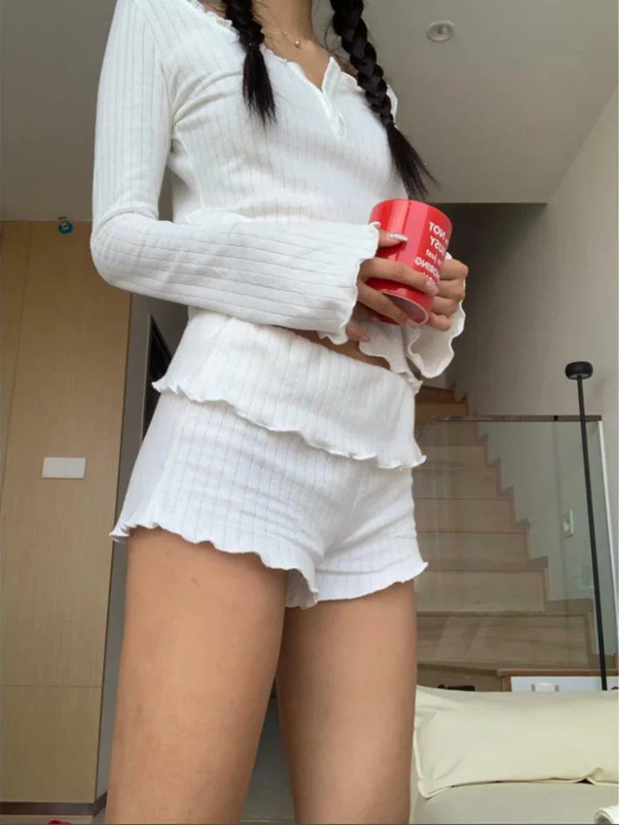 Yipinpay Women 2 Pieces Summer Y2K Outfits Solid Color Fairy Lettuce Trim Long Sleeves Tops and Elastic Shorts Club Streetwear