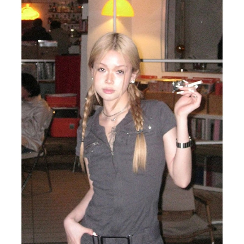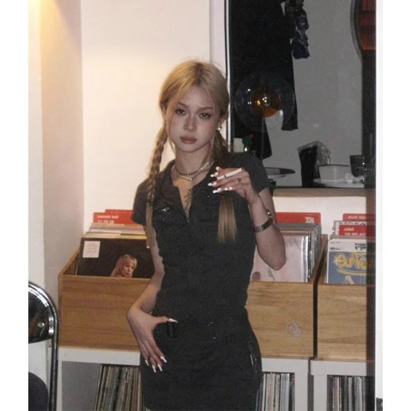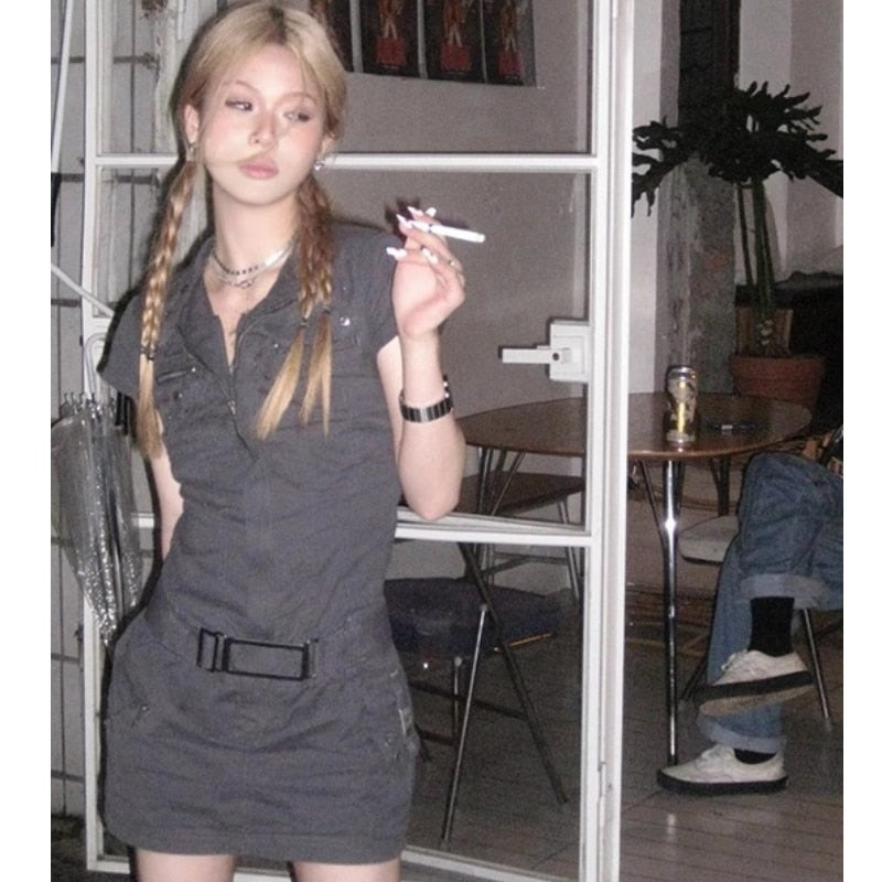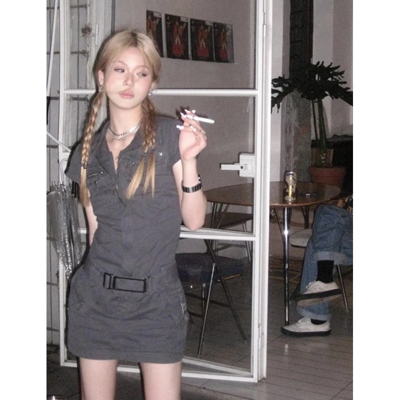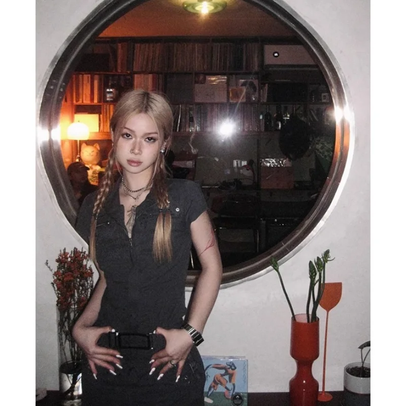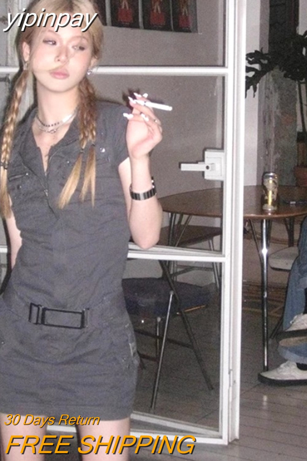 yipinpay Women's Grey Dress Europe and America Self Cultivation Zipper Skirt Temperament Summer 2023 NEW Female Clothing Short Skirt