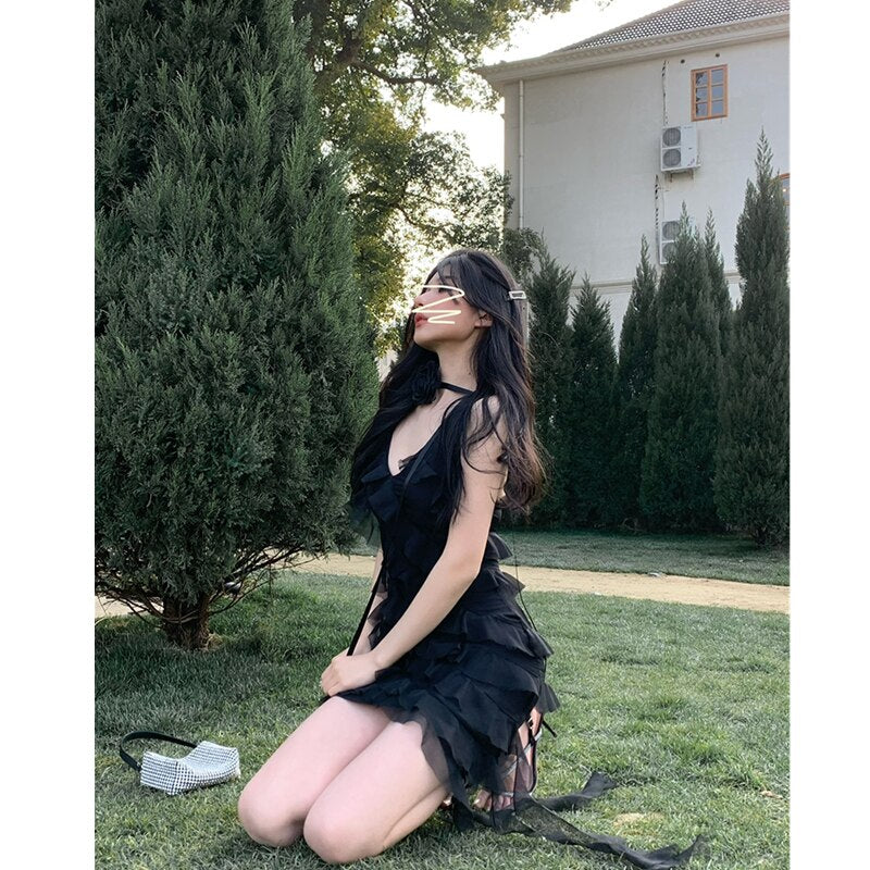 yipinpay Women's Suspender Dress Sleeveless Holiday Romantic Sexy Style Korean Fashion Irregular Black Chiffon Short Skirt Dress