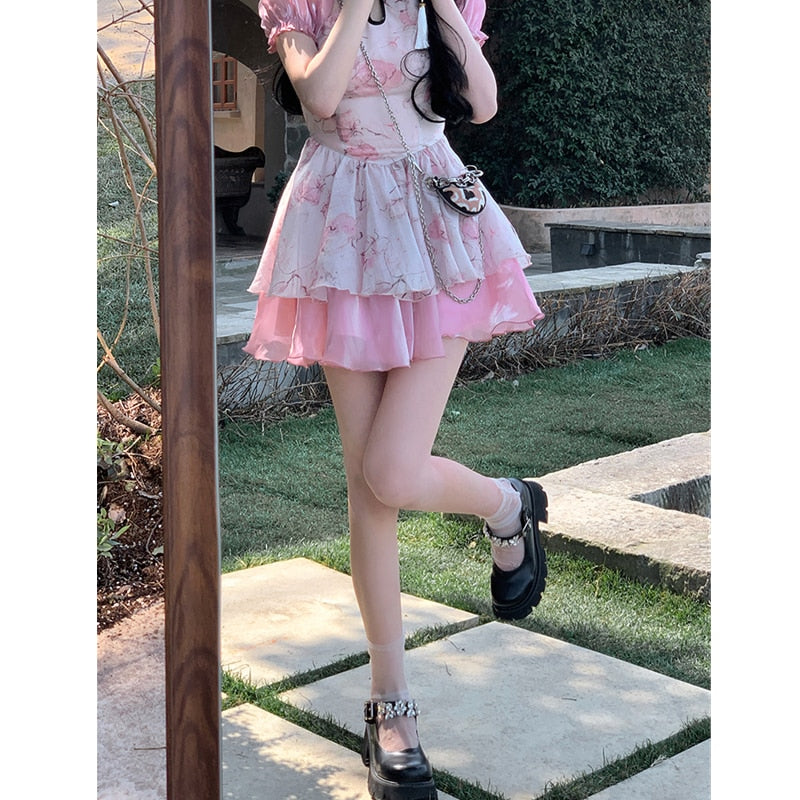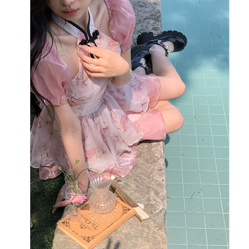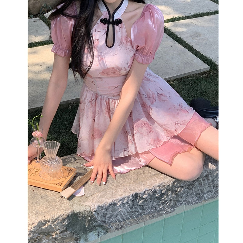 yipinpay Women's Wear Dress Summer Cheongsam Skirt Puff Short Sleeves Short Skirt Pink Fashion Chinese Style Design Fishbone Skirt Dress