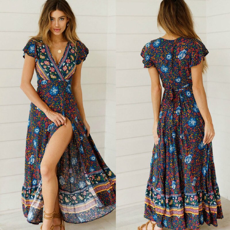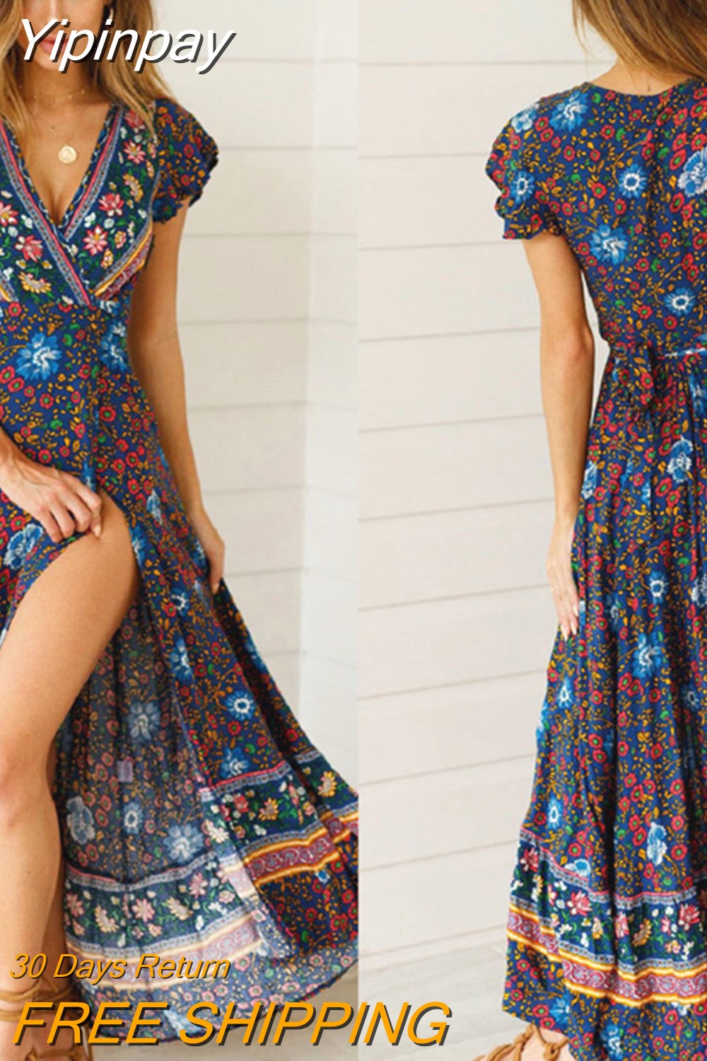 Yipinpay Women Boho V Neck Slim Waist arrival Sexy Long Maxi Dress Summer Beach Hot Party Floral Printed Sundress 2023