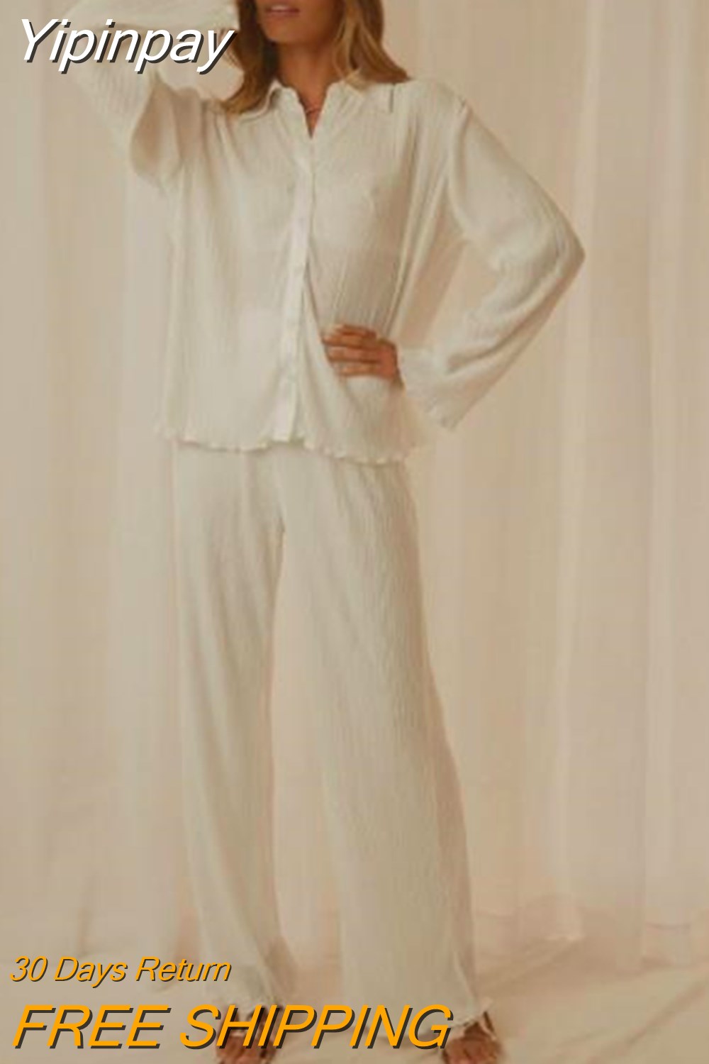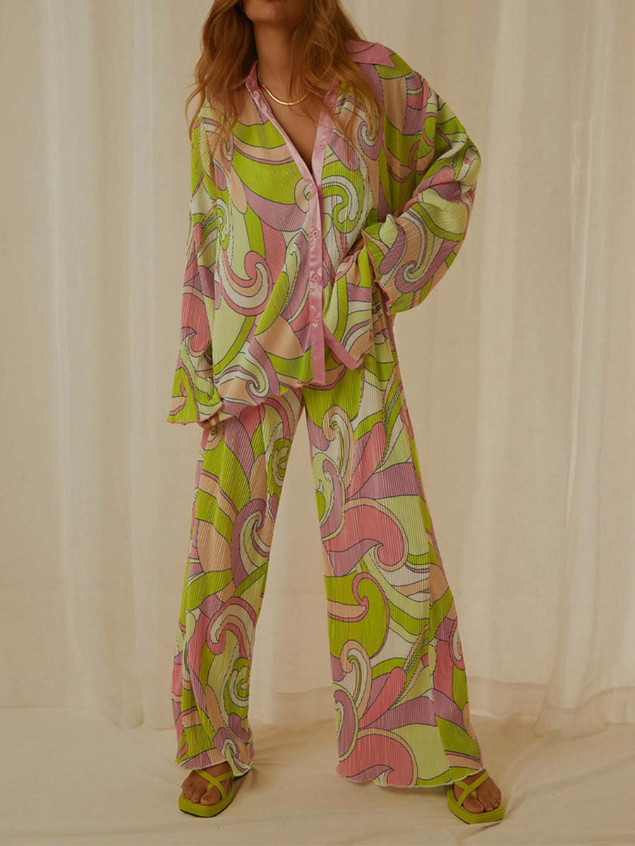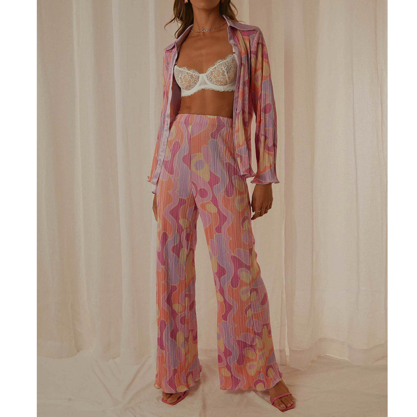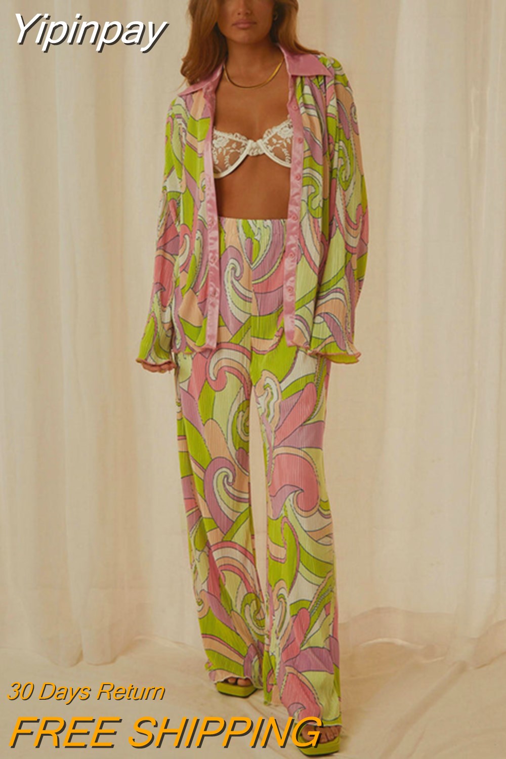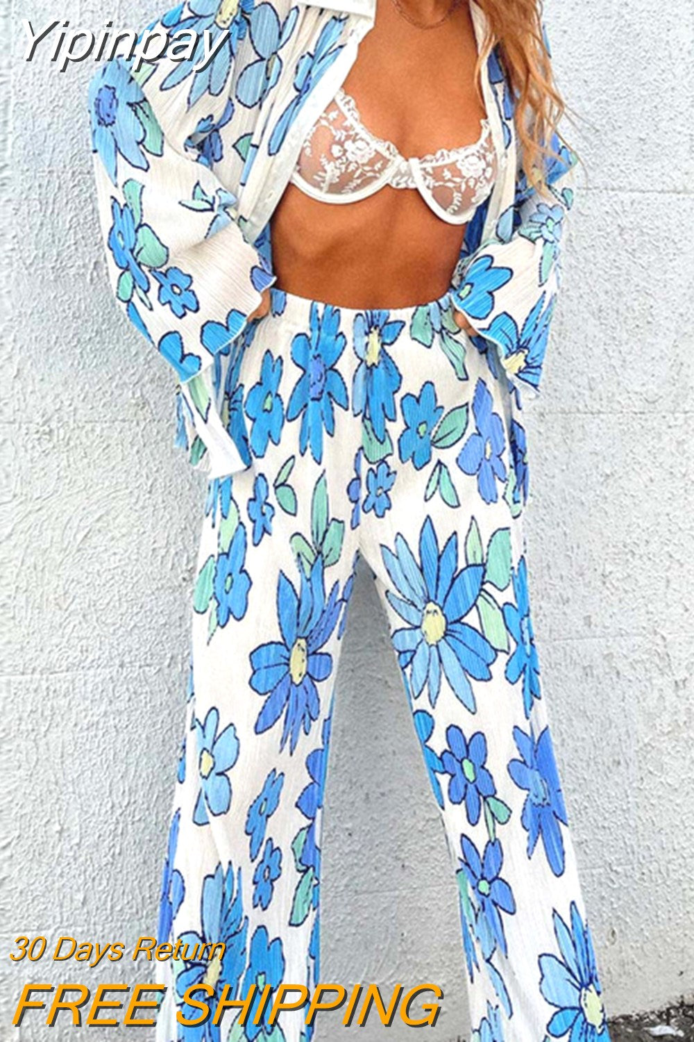Yipinpay Women Casual 2 Pcs Clothes Set Flower Abstract Pattern Print Lapel Buttons Long Sleeve Shirts Tops With Loose Long Pants New