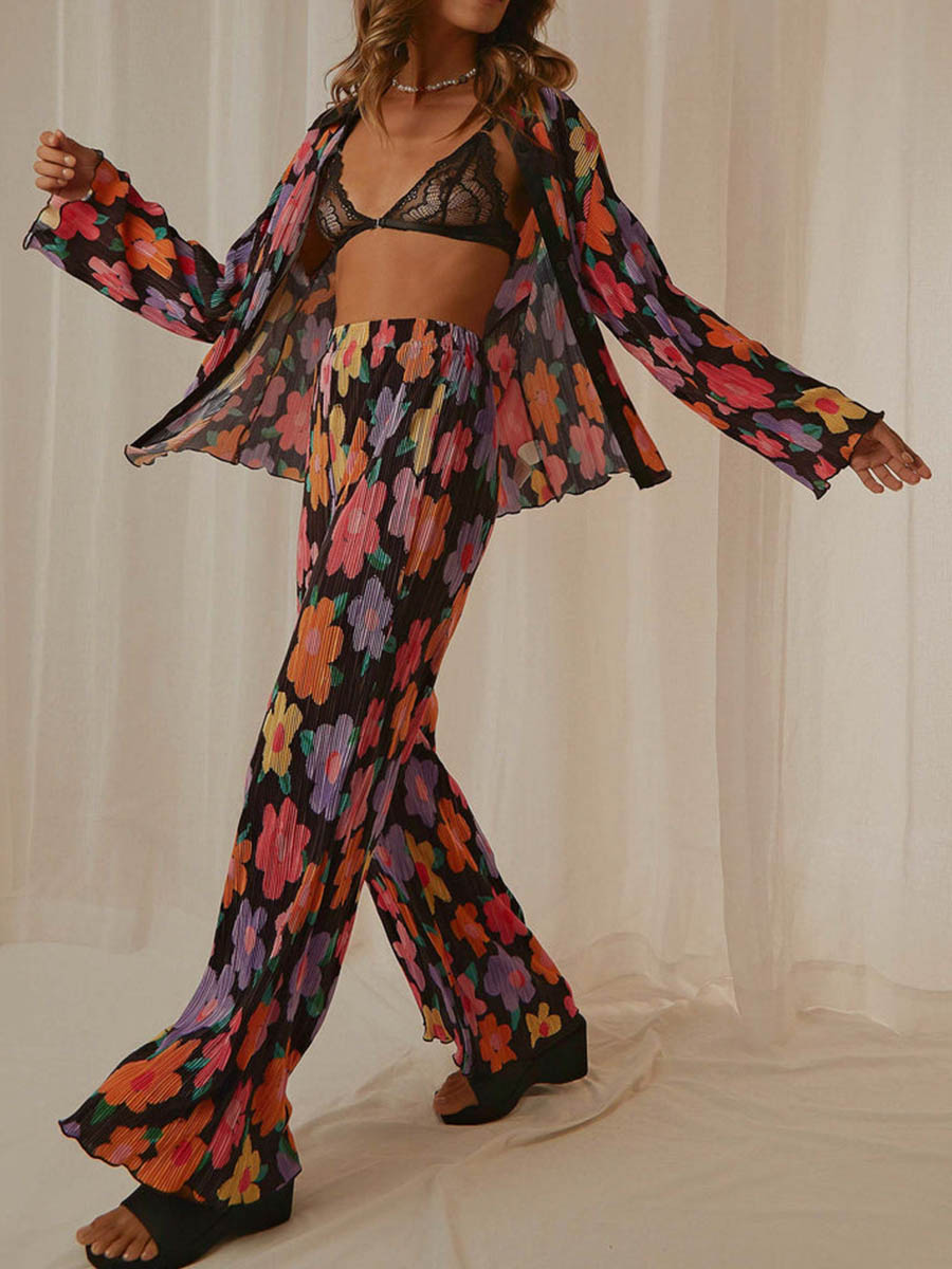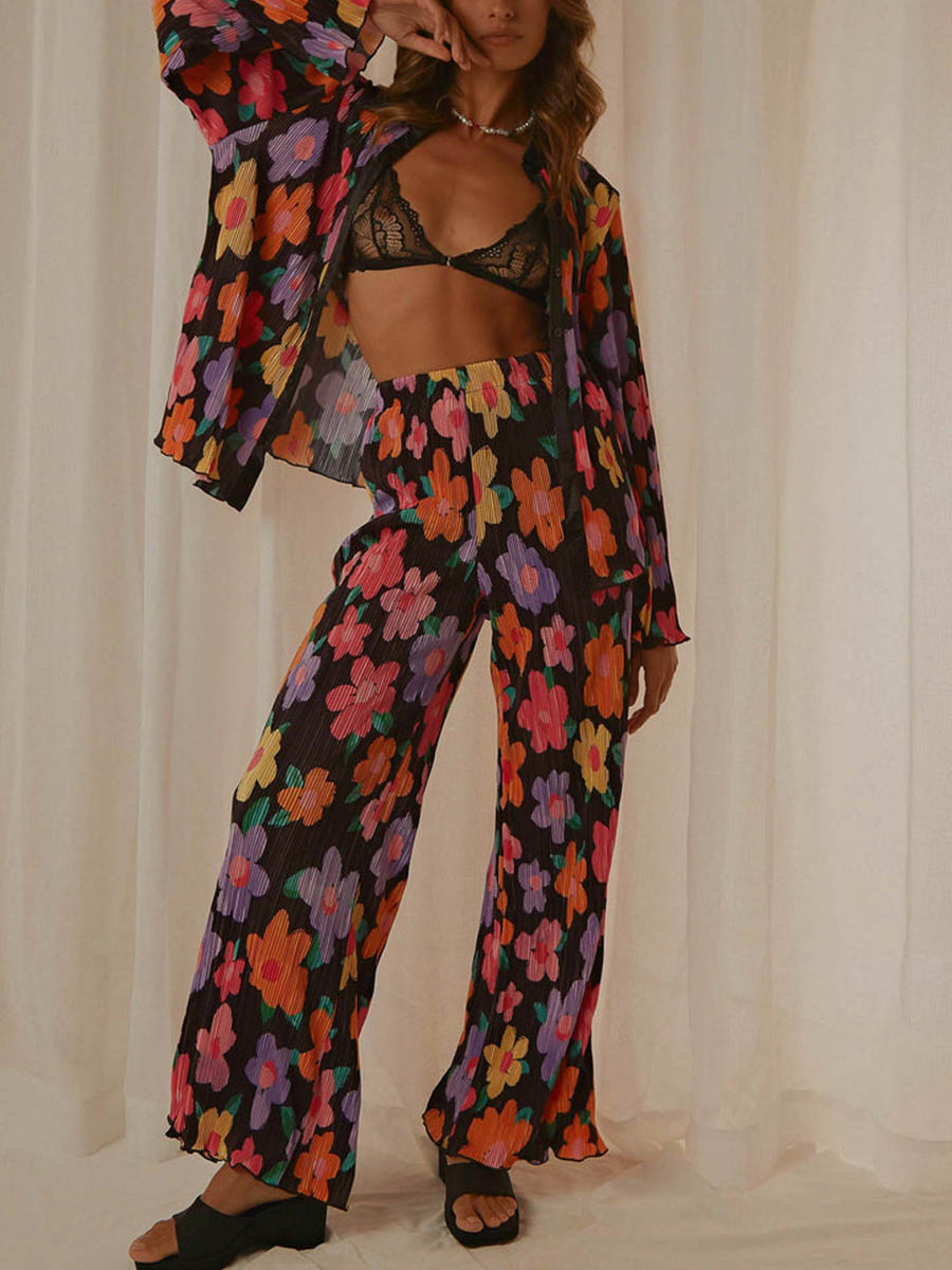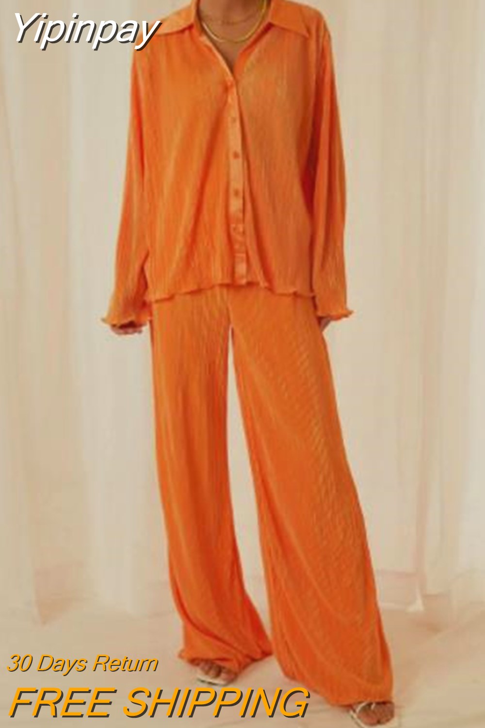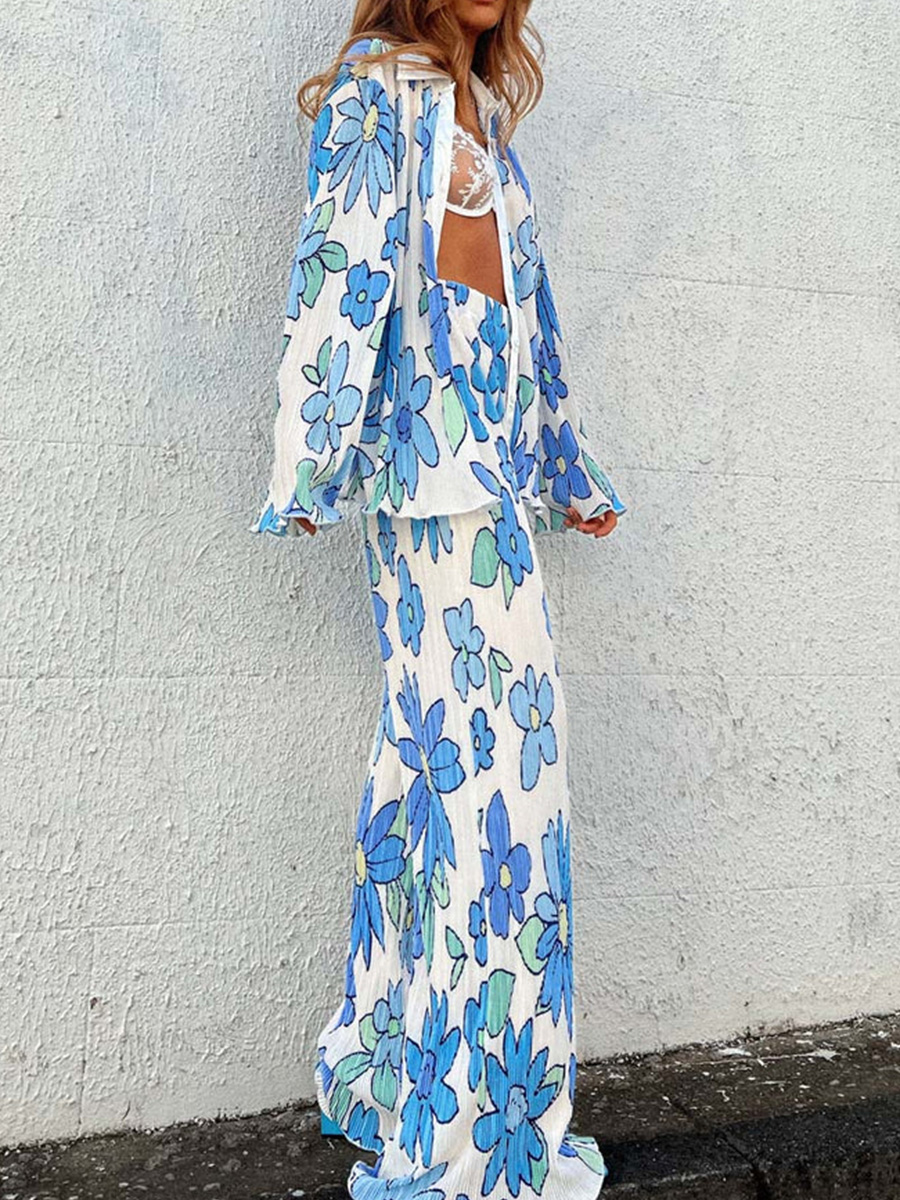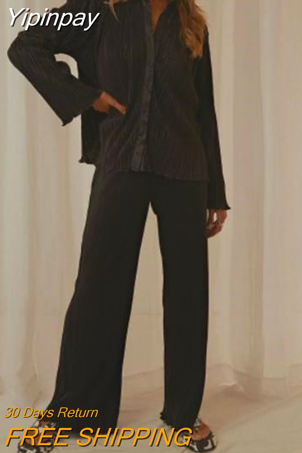 Yipinpay Women Casual 2 Pcs Clothes Set Flower Abstract Pattern Print Lapel Buttons Long Sleeve Shirts Tops With Loose Long Pants New