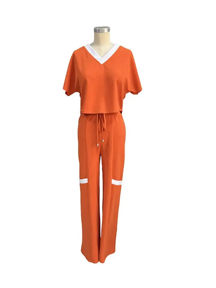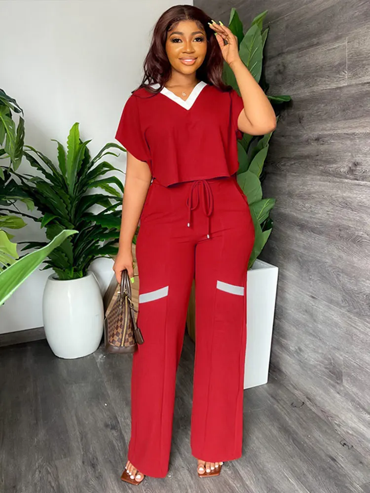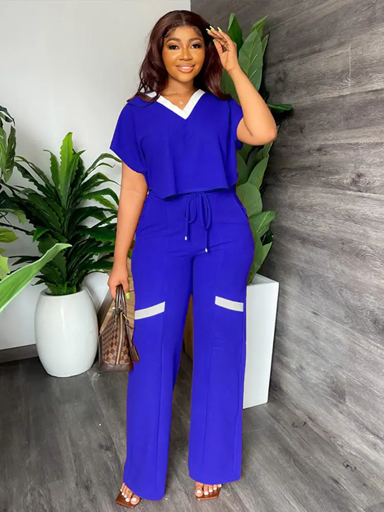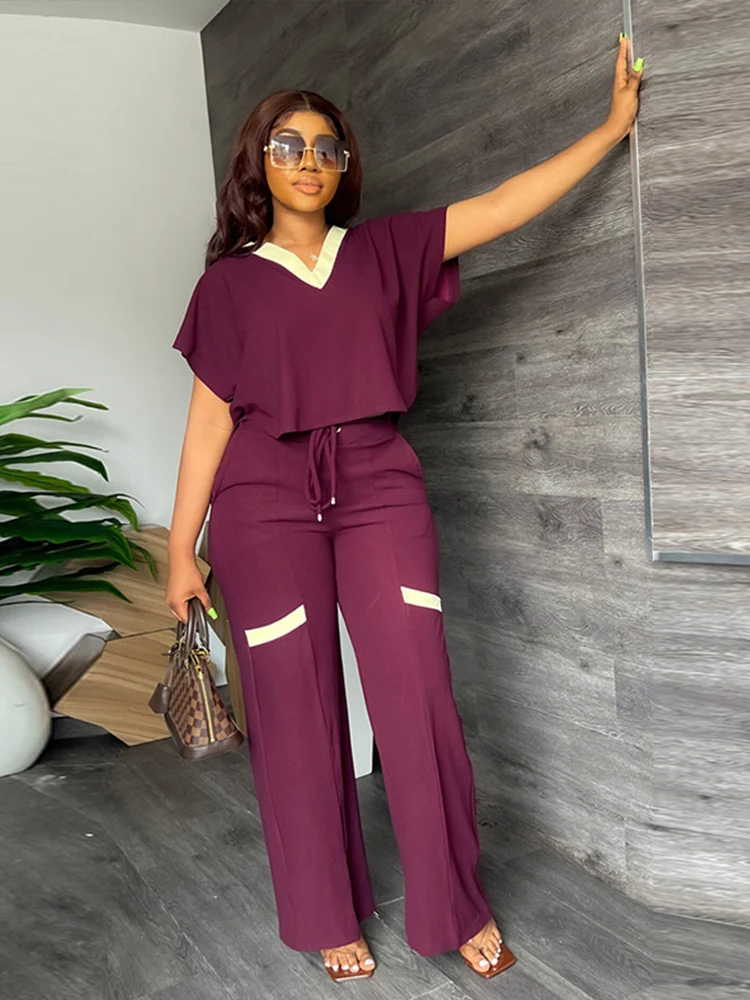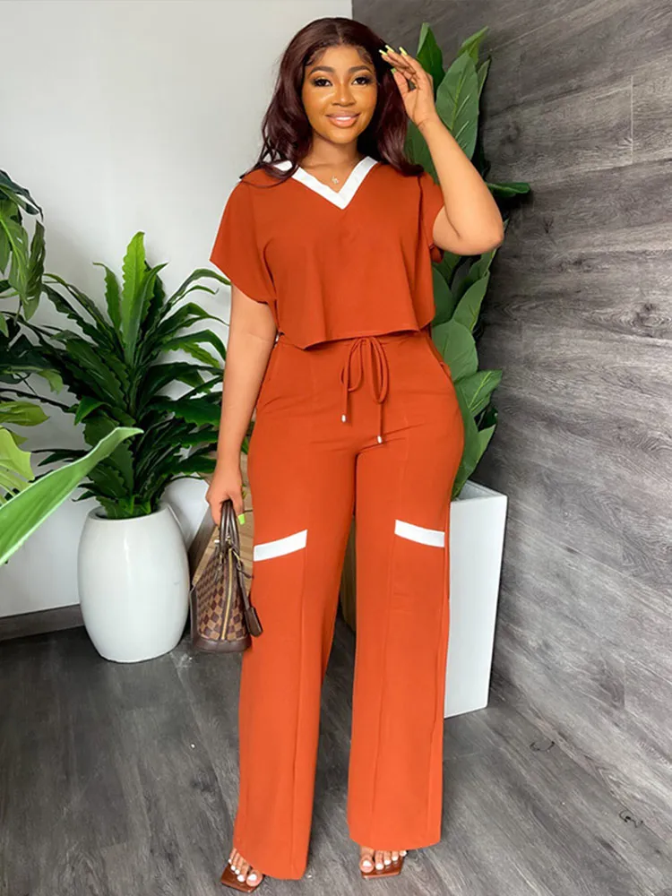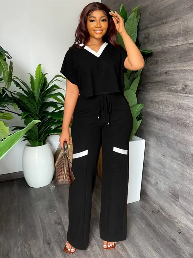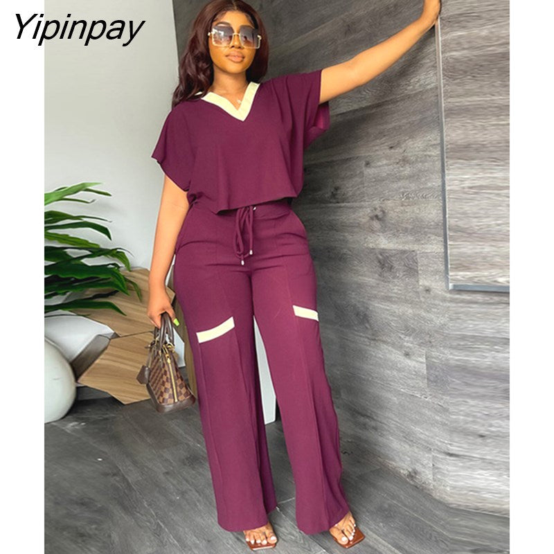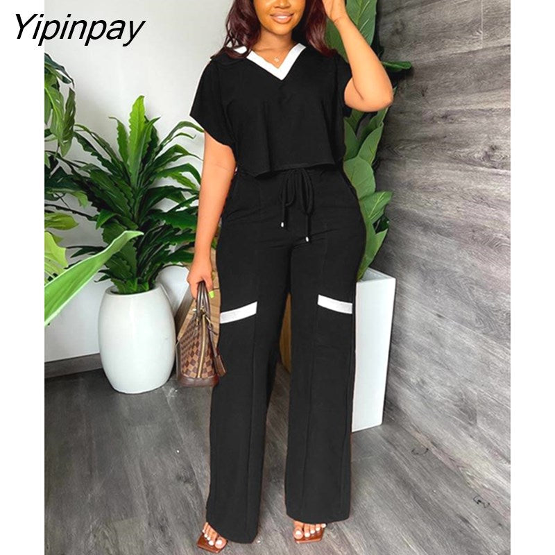 Yipinpay Women Casual Contrasting Drawstring Trousers Suit Female V Neck Blouse Straight Pants Two Piece Set 2023 Fashion Sports Outfit