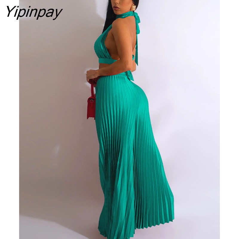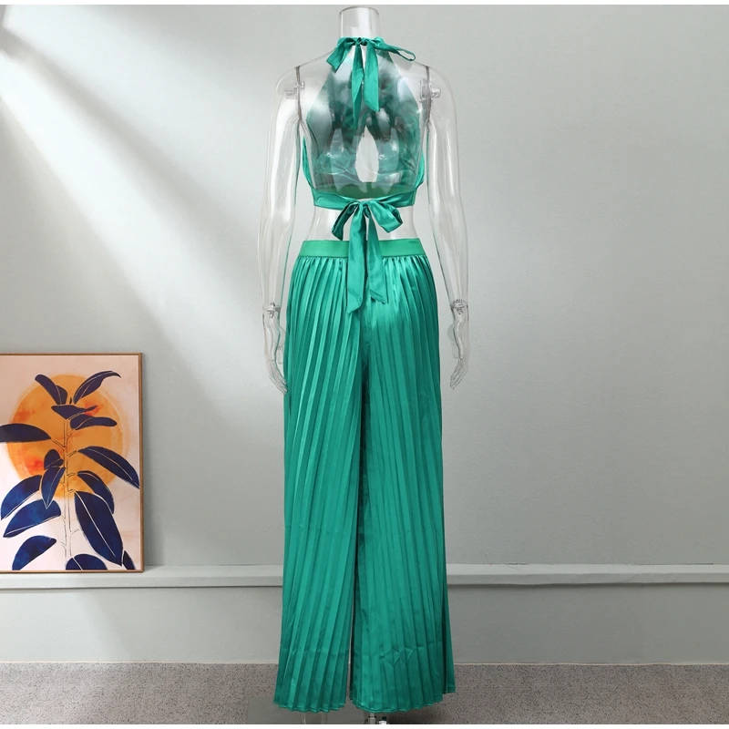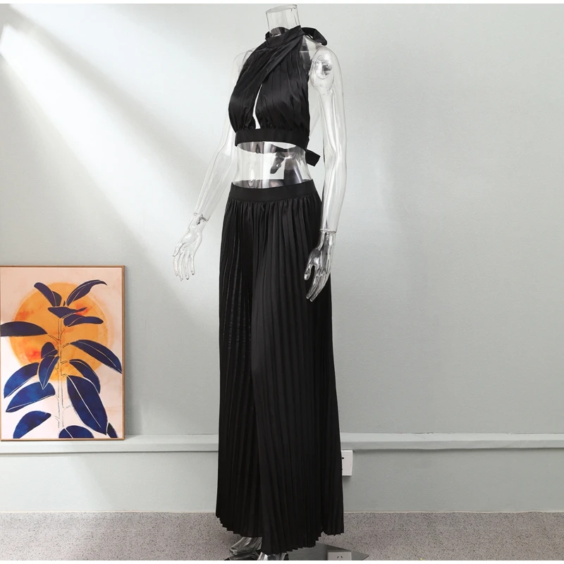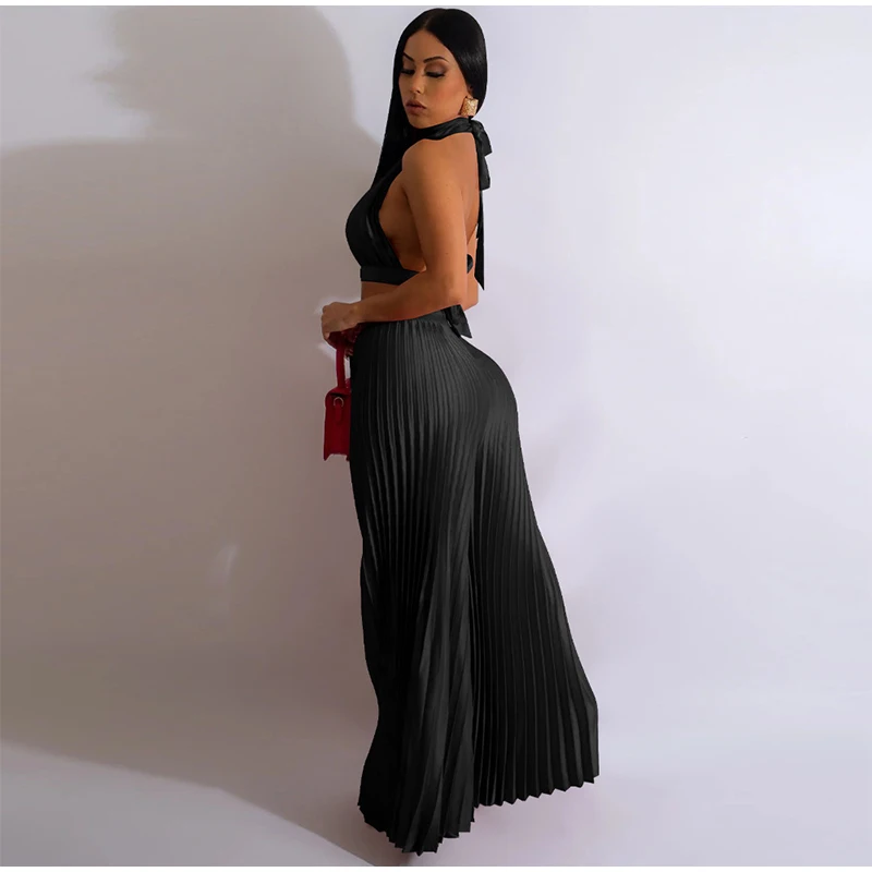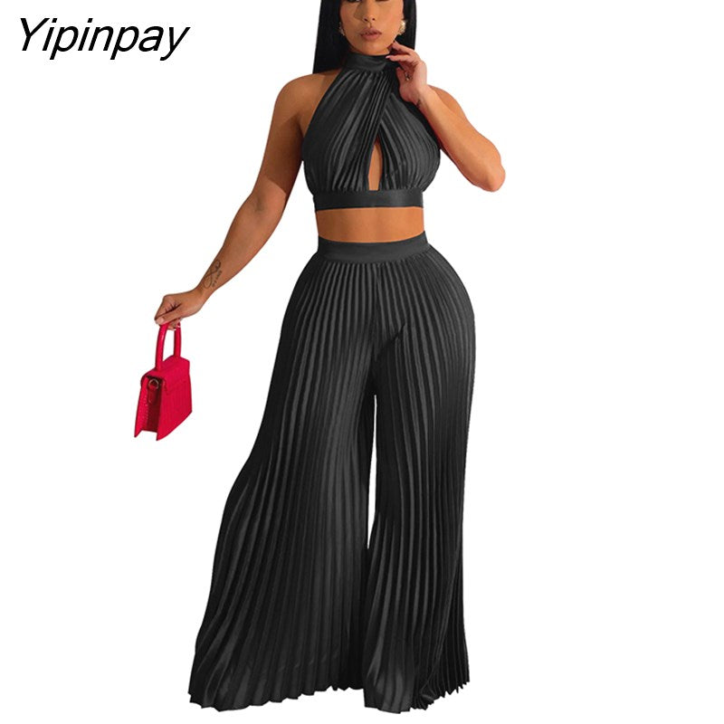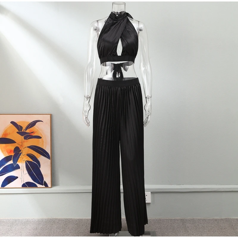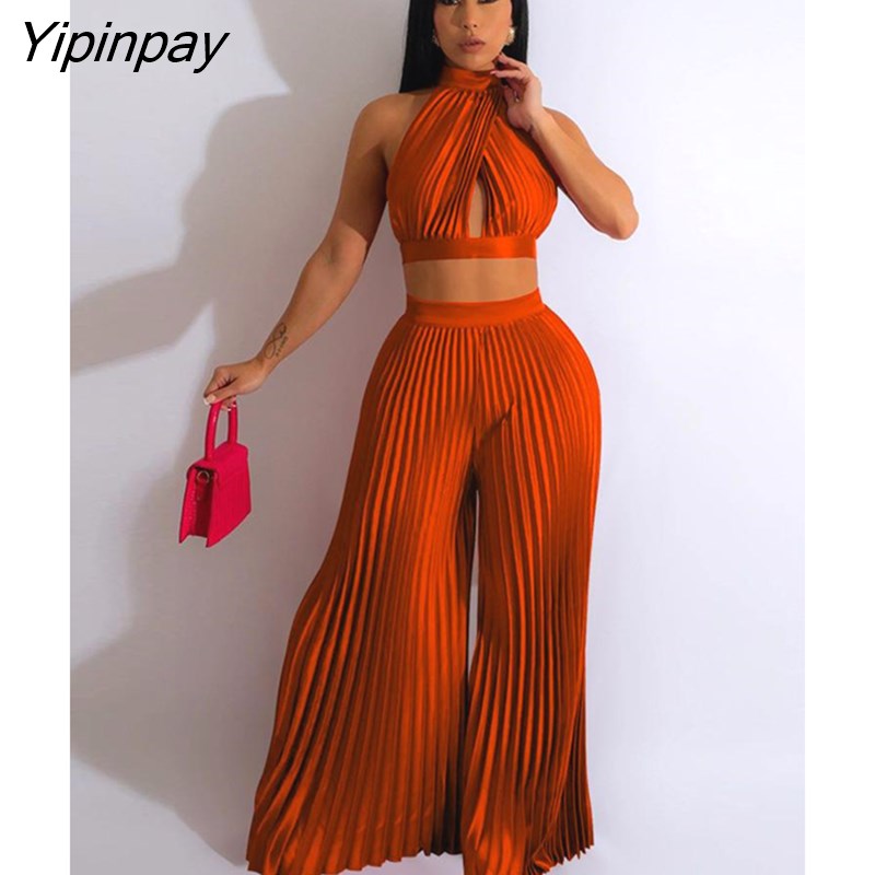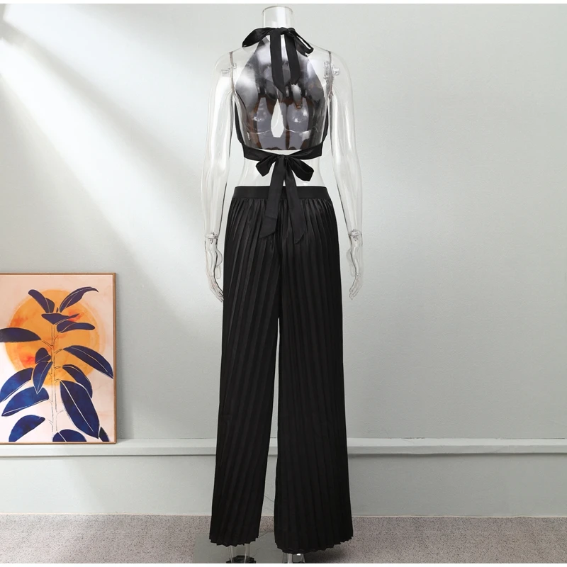 Yipinpay Women Casual Solid Pleated 2 Piece Set Sexy Halter Bra And Wide Leg Pants Suits 2023 Spring Cropped Lace Up Vest Trousers Outfit