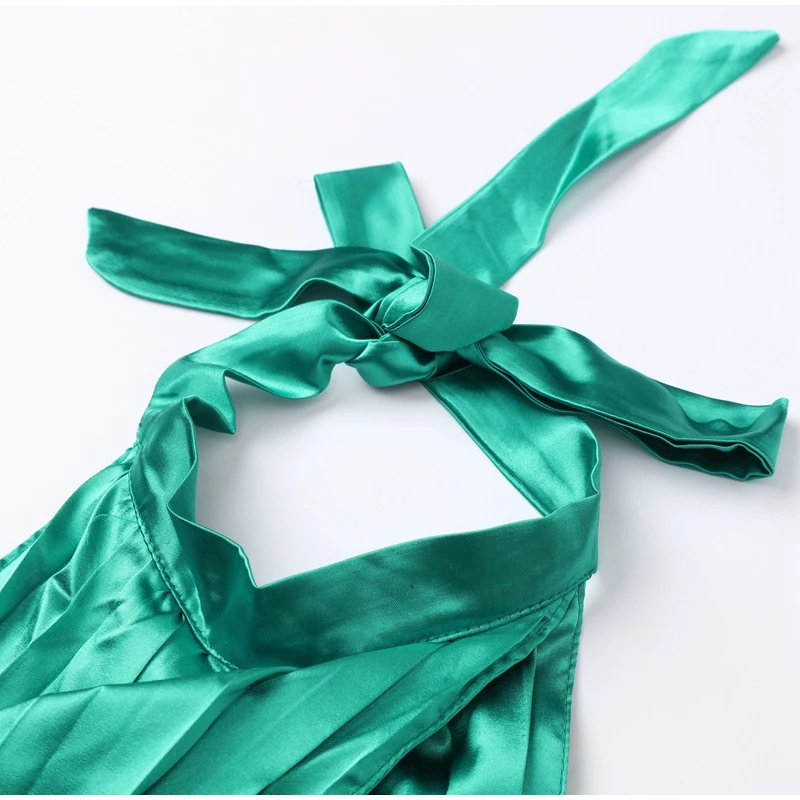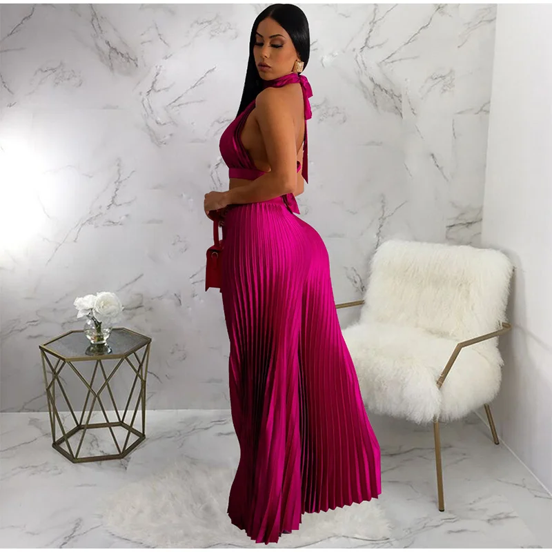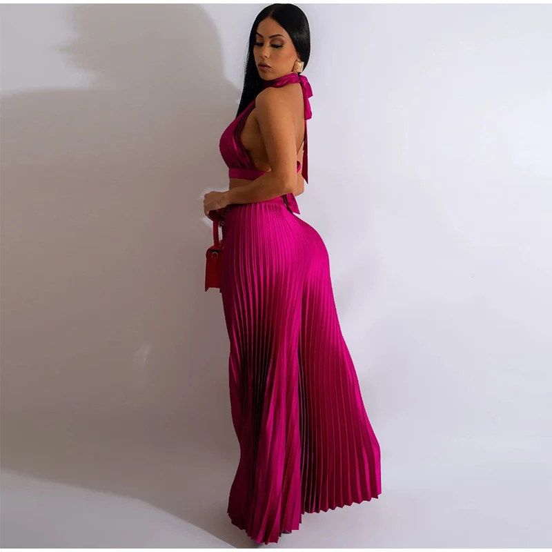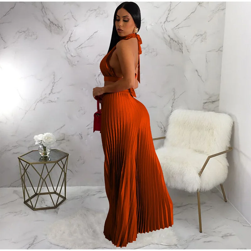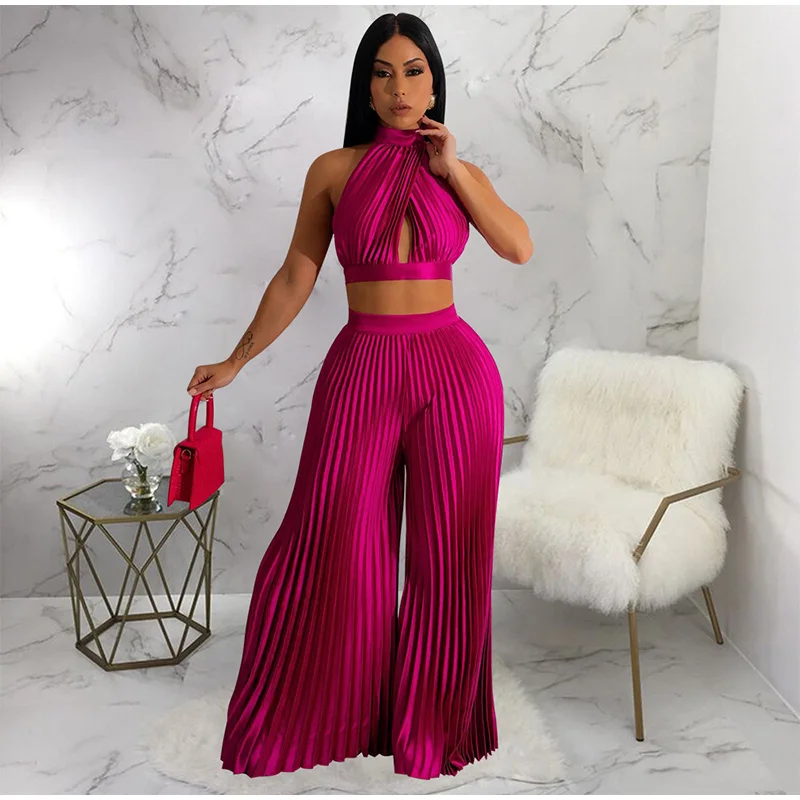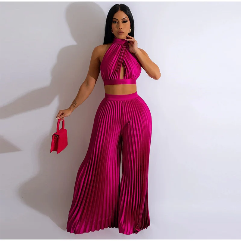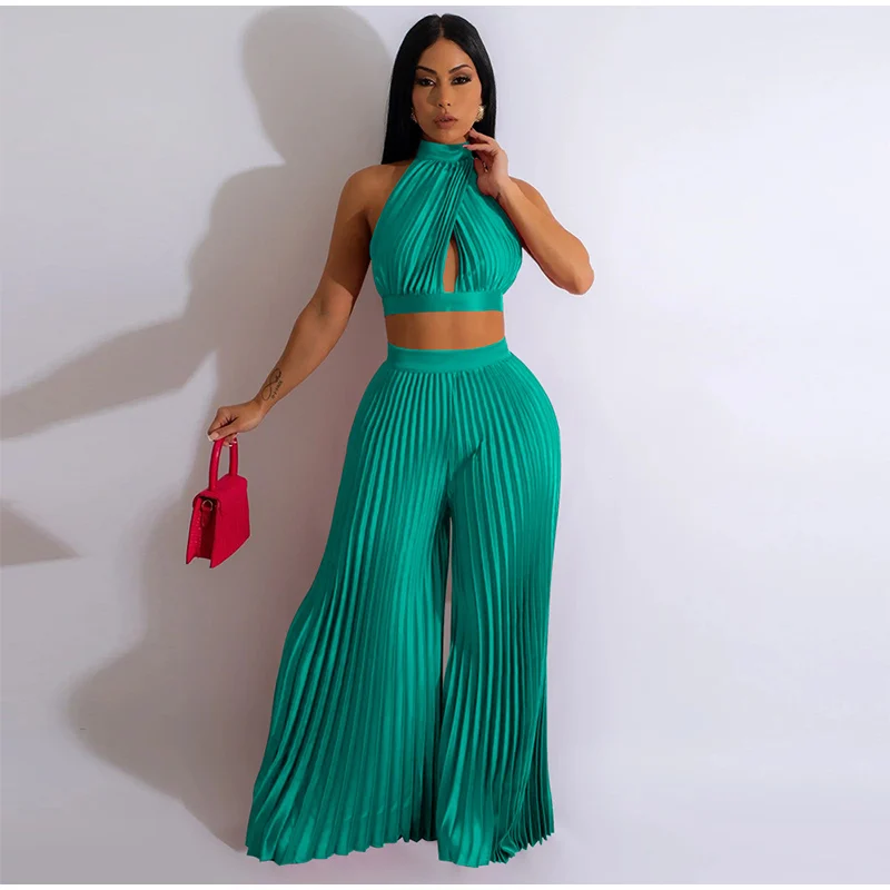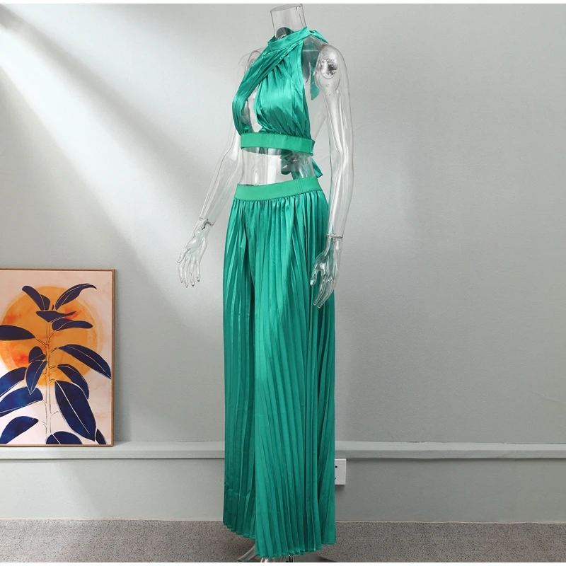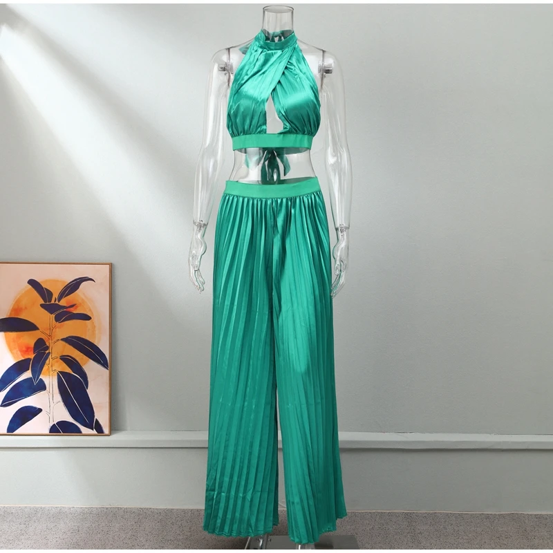 Yipinpay Women Casual Solid Pleated 2 Piece Set Sexy Halter Bra And Wide Leg Pants Suits 2023 Spring Cropped Lace Up Vest Trousers Outfit