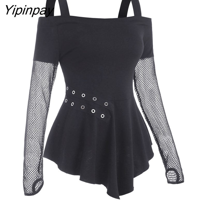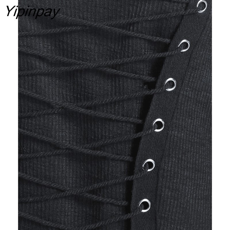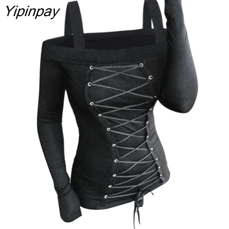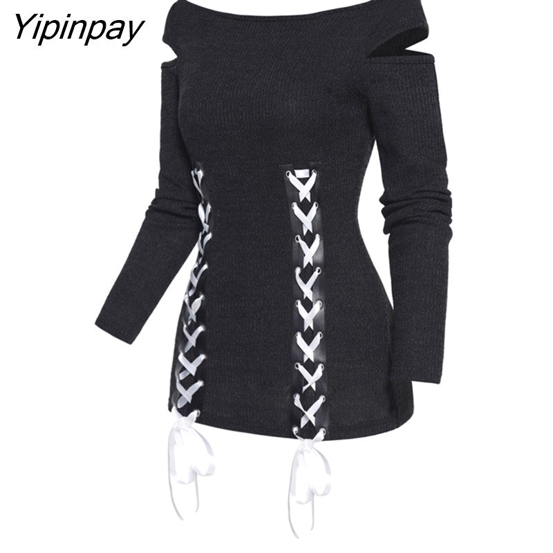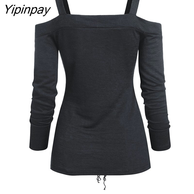 Yipinpay Women Casual T Shirts Cold Shoulder Lace-Up Front Ribbed T-Shirt Solid Color Long Sleeve Female Fashion Tops Tee
