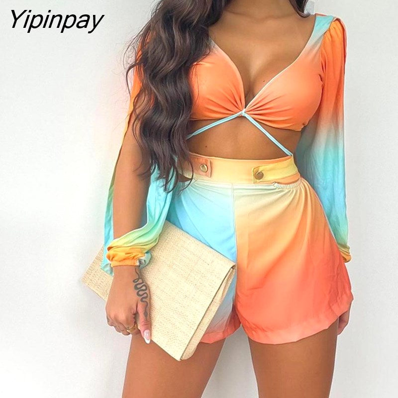 Yipinpay Women Chic Crop Top Gradient Colour Lace Up Long Asymmetrical Sleeves Mini Sexy Sweat Short Sets
