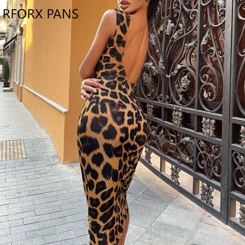 Yipinpay Women Chic Skinny Leopard Tank Bodycon Dress Midi Party Sexy Dress 920
