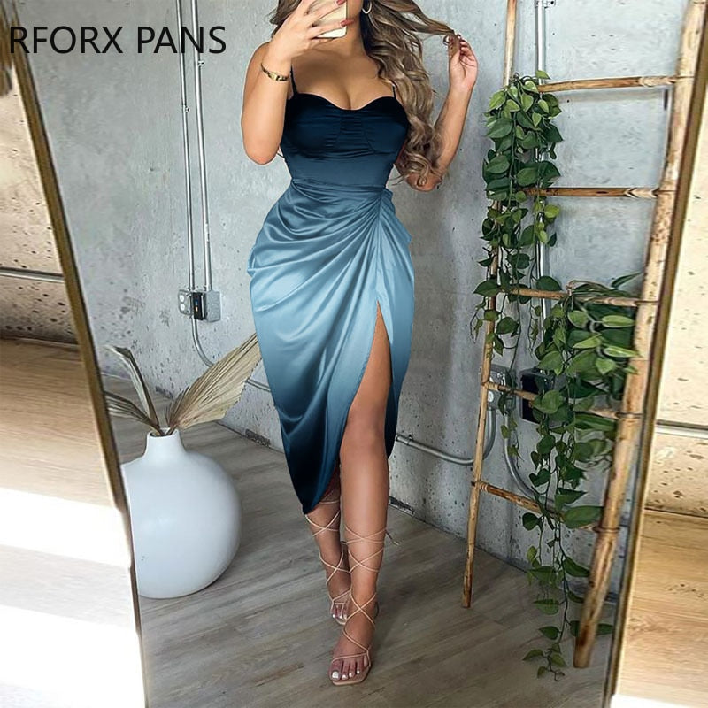 Yipinpay Women Chic Sleeveless Bodycon Spaghetti Strap Fade Color Shirring Midi Party Silt Sexy Dress