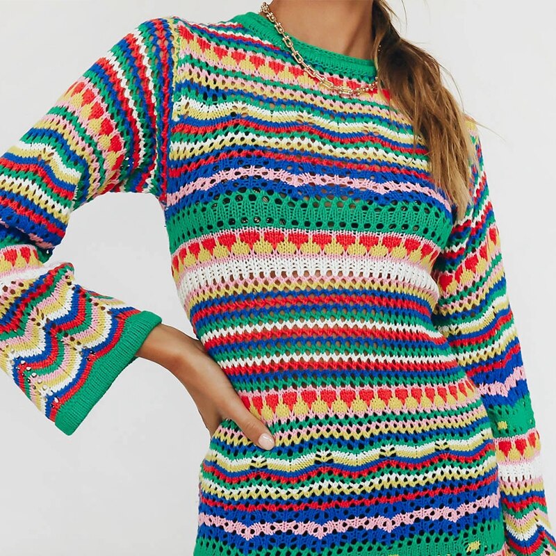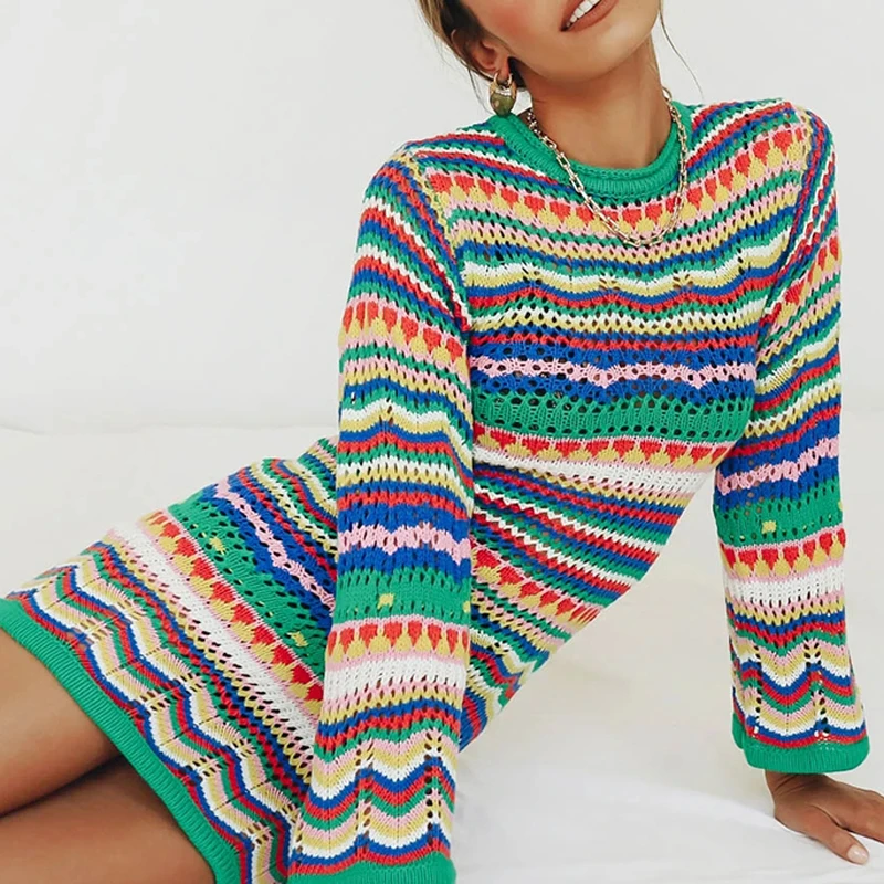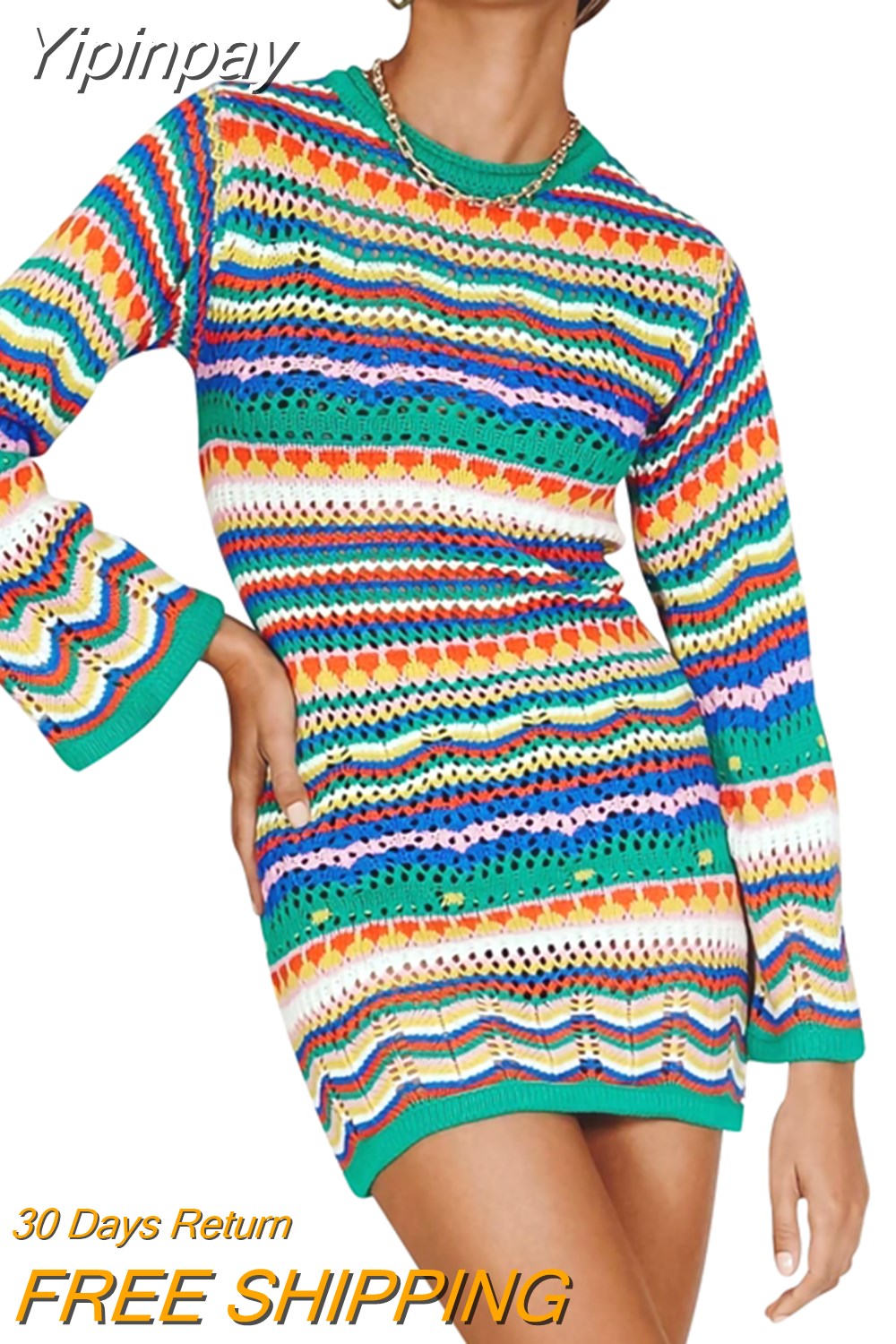 Yipinpay Women Colorful Knitted Dress Women's Sexy Bodycon Mini Dress Bohemian Long Sleeve Crew Neck Hollow Out Dress