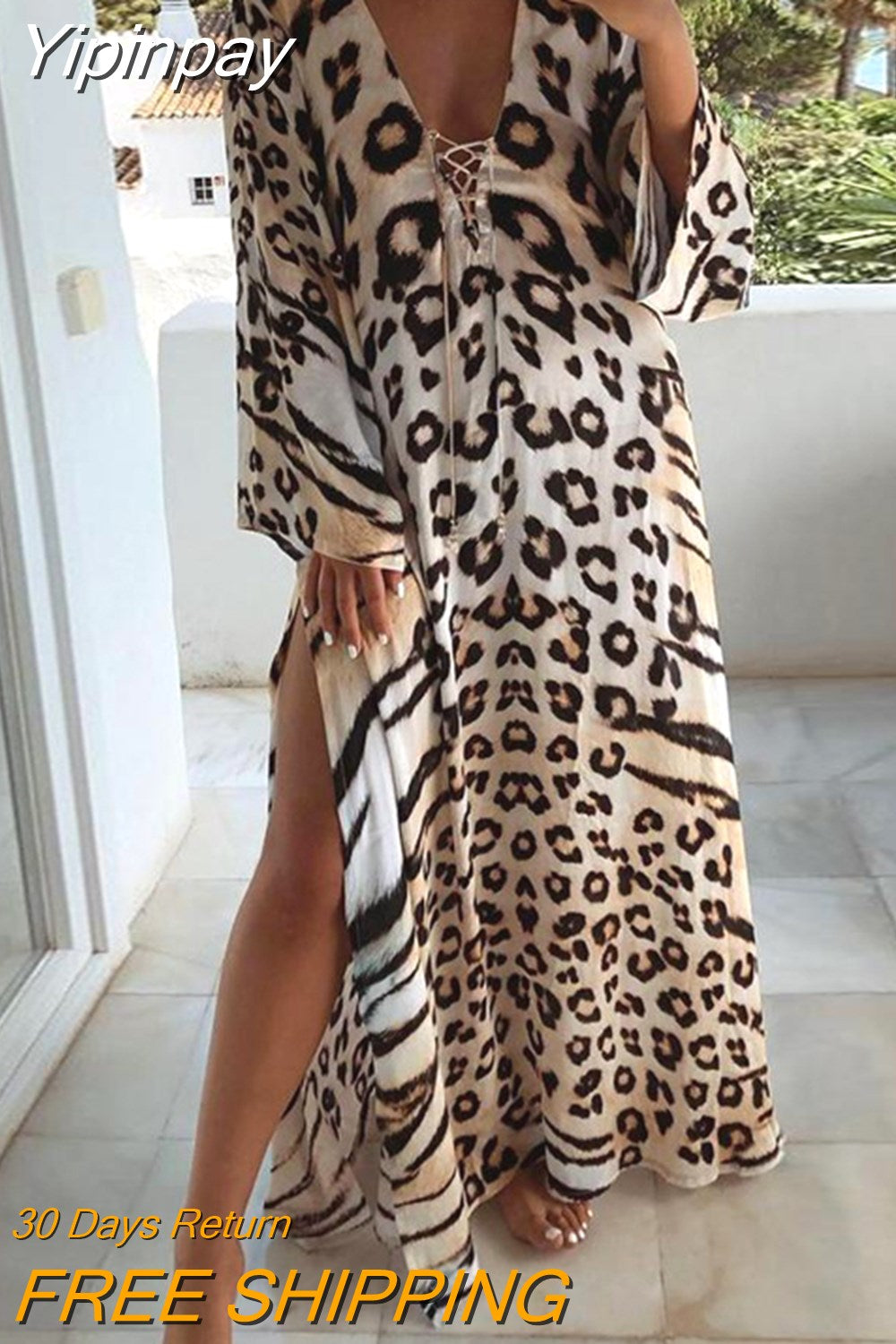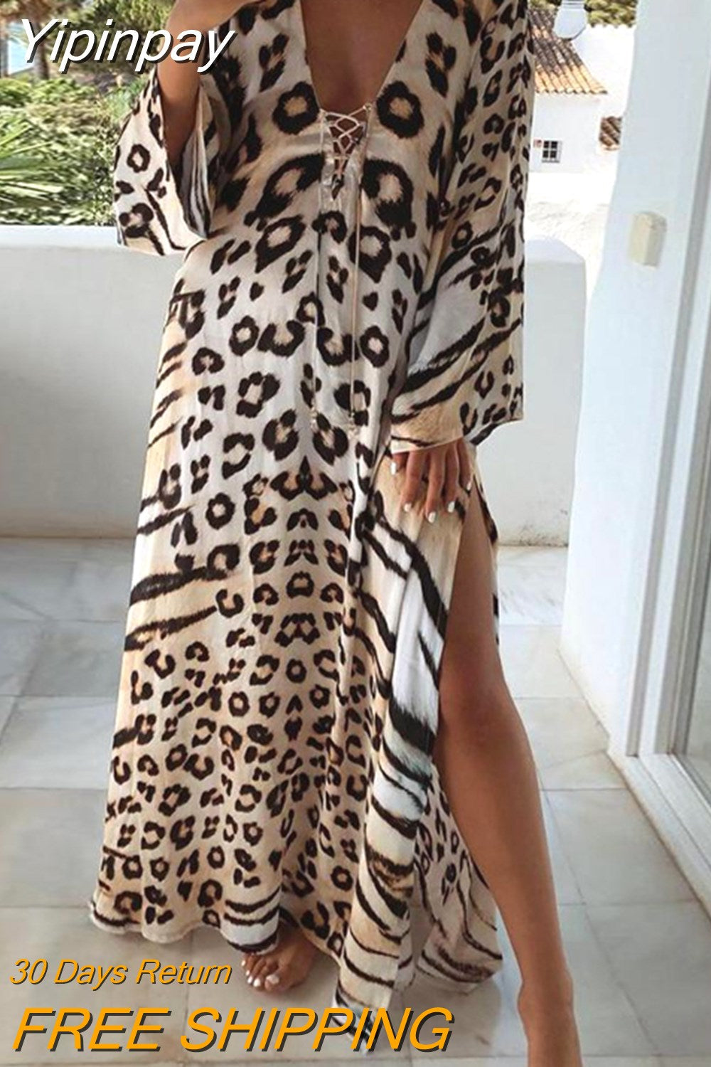 Yipinpay Women Dress Cheetah Print Lace-up High Slit Maxi Dress Maxi Dress for Women