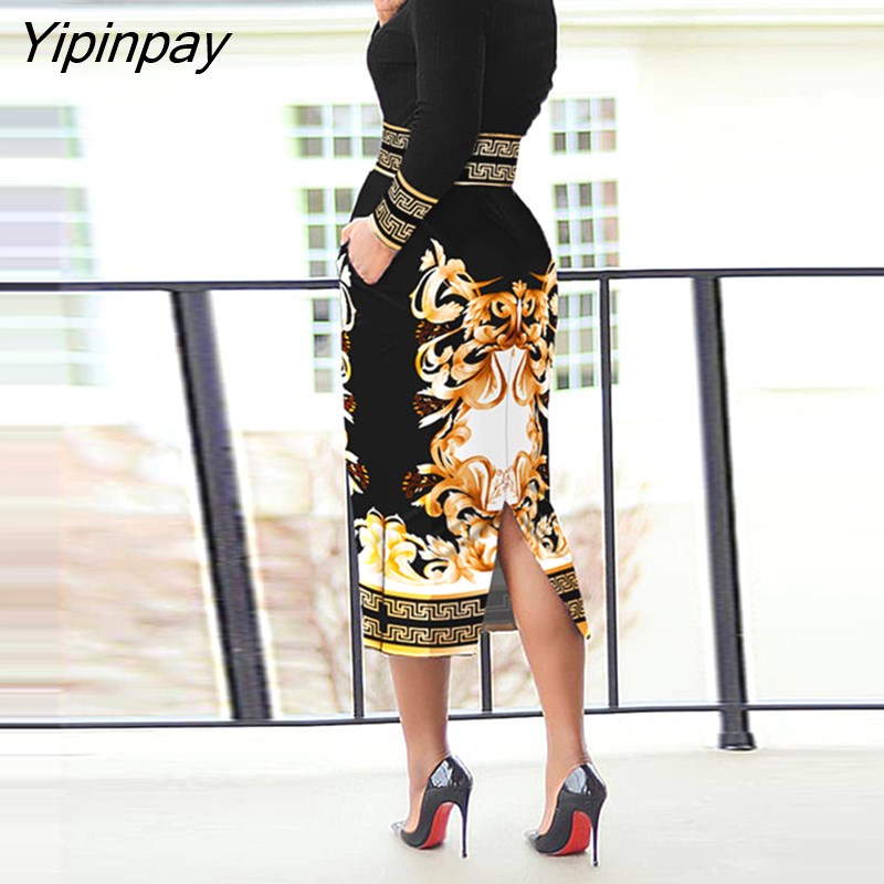 Yipinpay Women Elegant Allover Print Palace Totem Round Neck Small Silt Pocket Bodycon Midi Working Dress