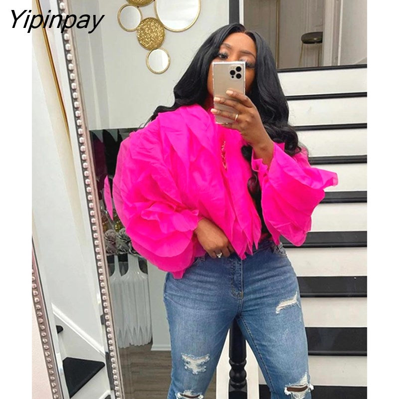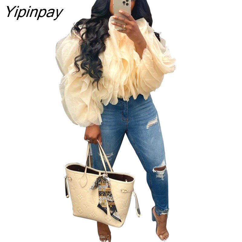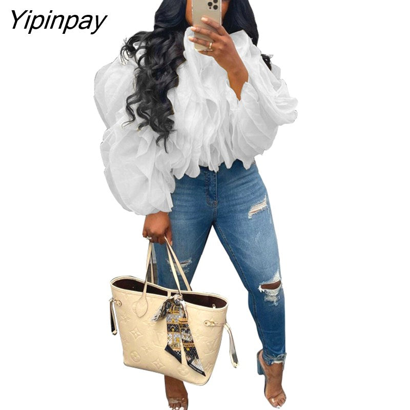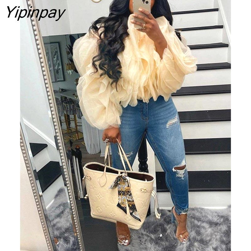 Yipinpay Women Elegant Ruffled Layered Puff Sleeve Top 2023 Summer Female Solid Petal Chiffon Long Sleeve Cropped Blouse Streetwear