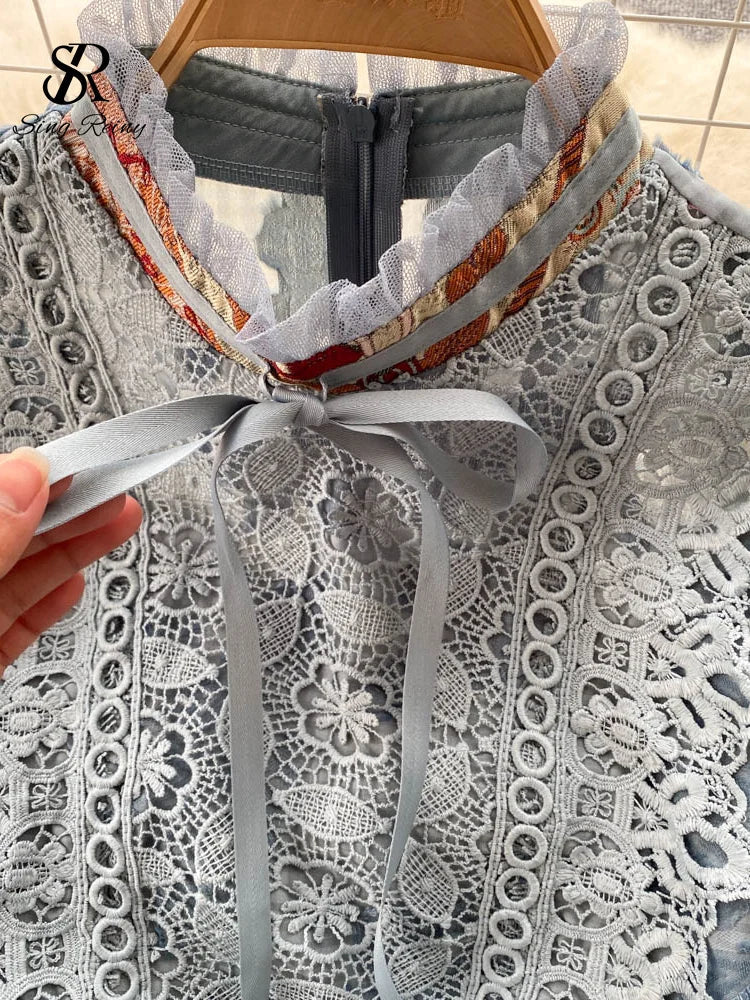 Yipinpay Women Embroidery French Style Dress Summer 2024 Lace Splice Elegant Bow Neck Long Sleeves Ladies A Line Midi Dresses