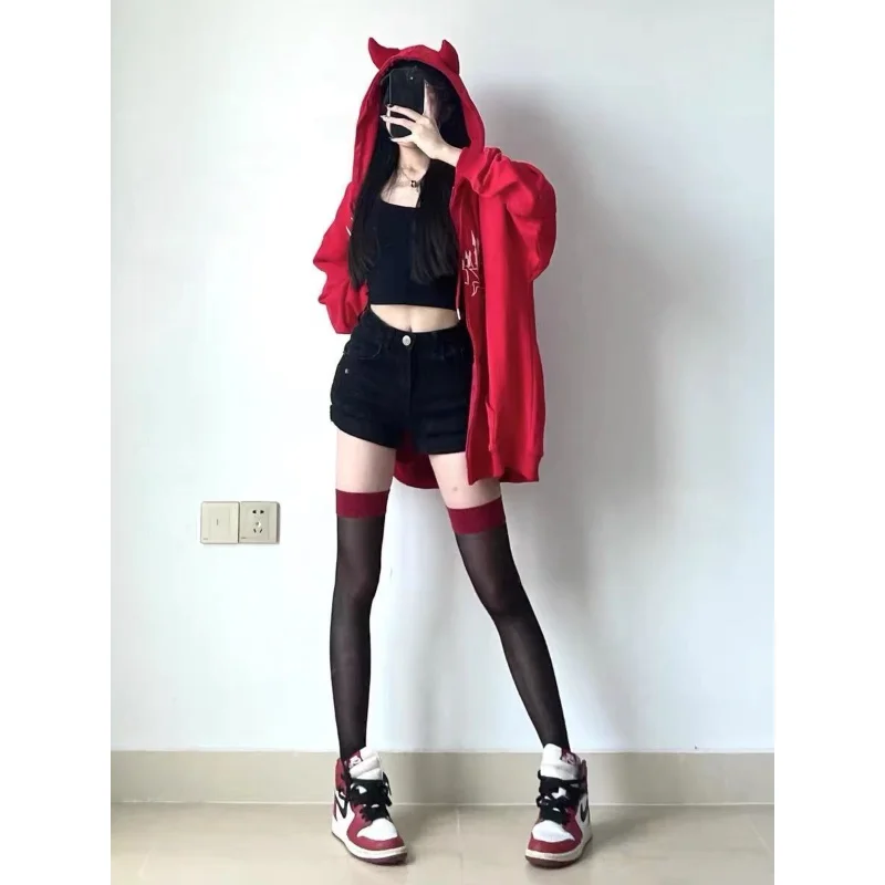 Yipinpay Women Hoodie Cartoon Devil Cowhorn American Retro Pullover 2024 New Couple Fashion Punk Coat Japanese Hip Hop Streetwear