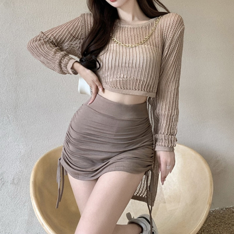 Yipinpay Women Knit Hollow T-shirts Solid Color Loose Irregular Hem Long Sleeve Sexy Mesh Tops Streetwear Transparent Shirt for Women