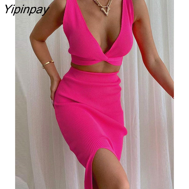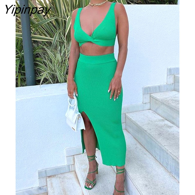 Yipinpay Women Knit Vest And Skirt Suits Female High Waist Side Split Skinny Skirts Set 2023 Summer Solid Sexy Backless Camis Outfits