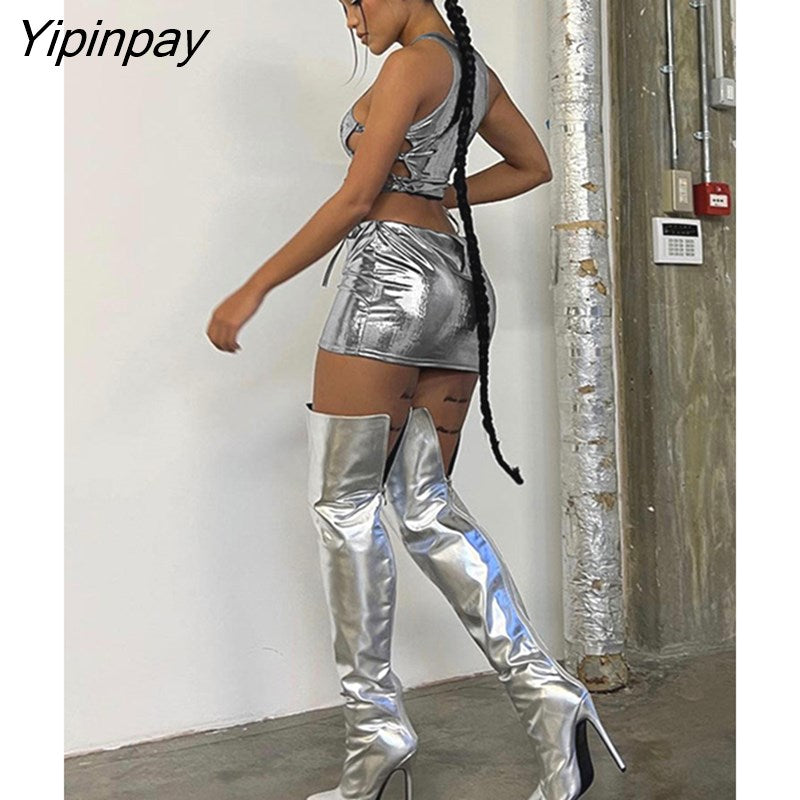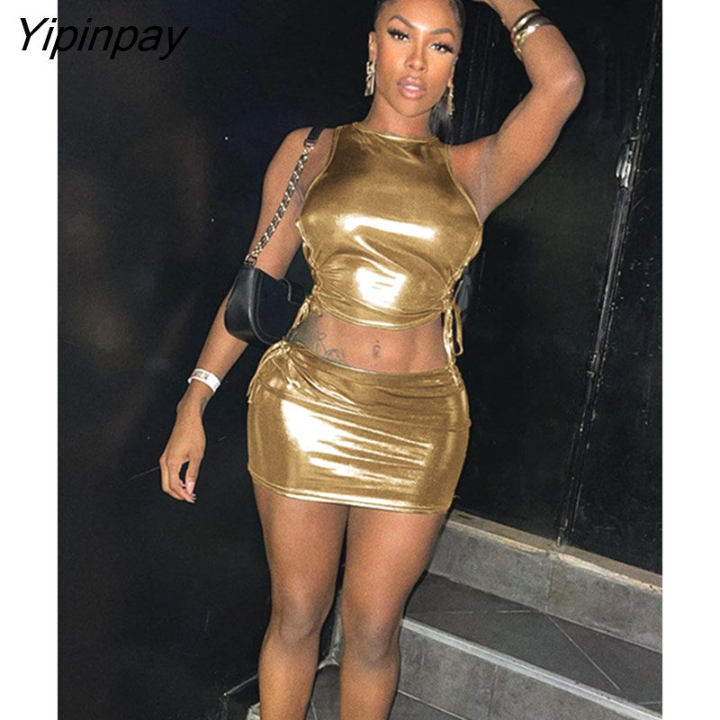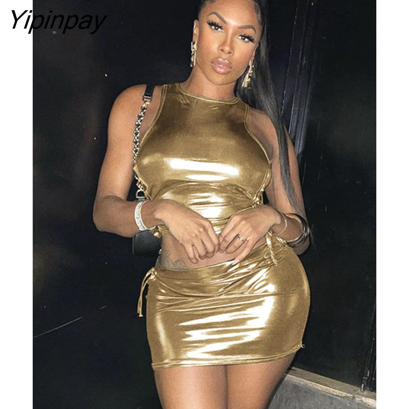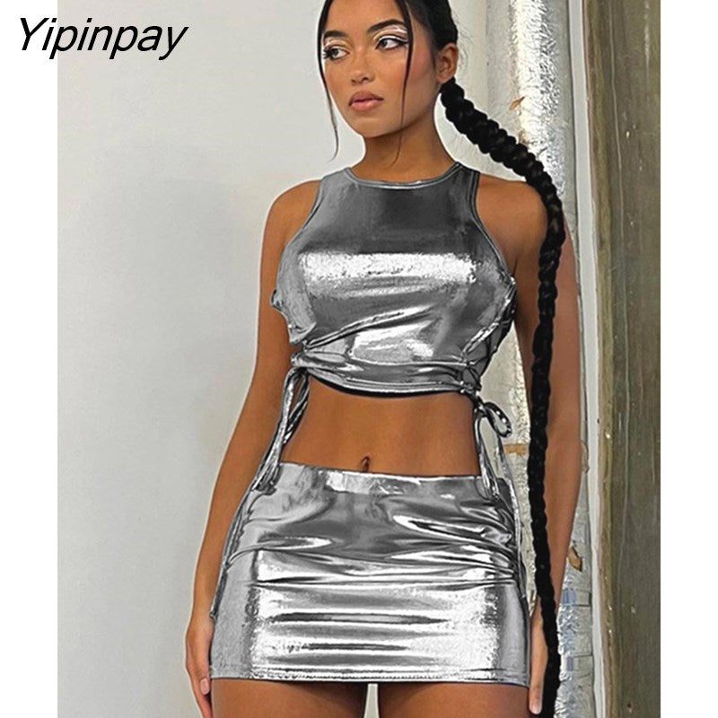 Yipinpay Women Lace Up Metallic Reflection Two Piece Set Sexy Sleeveless Cropped Vest Top Mini Skirts Suits 2023 Party Clubwear Outfits