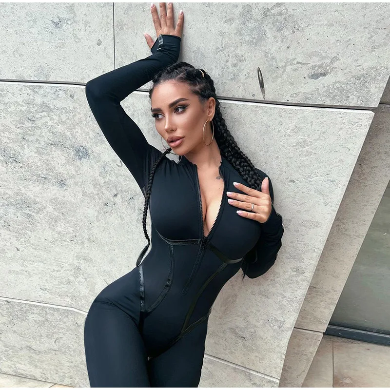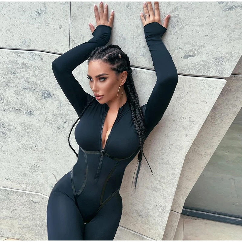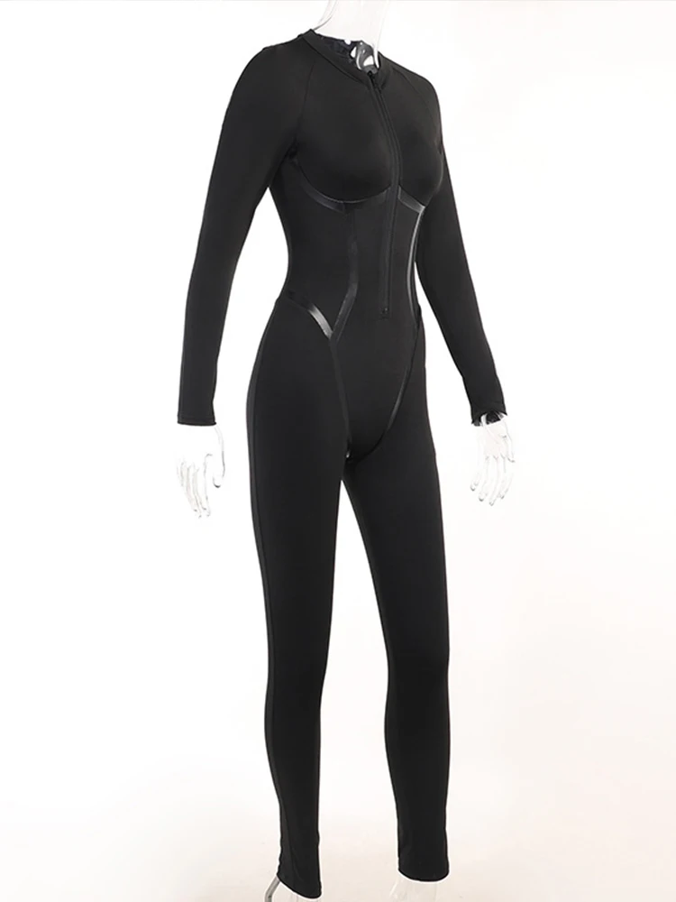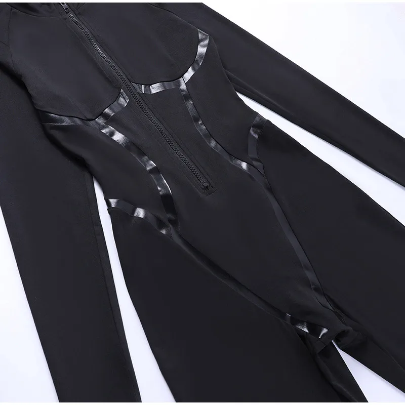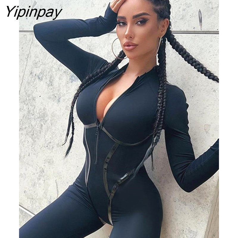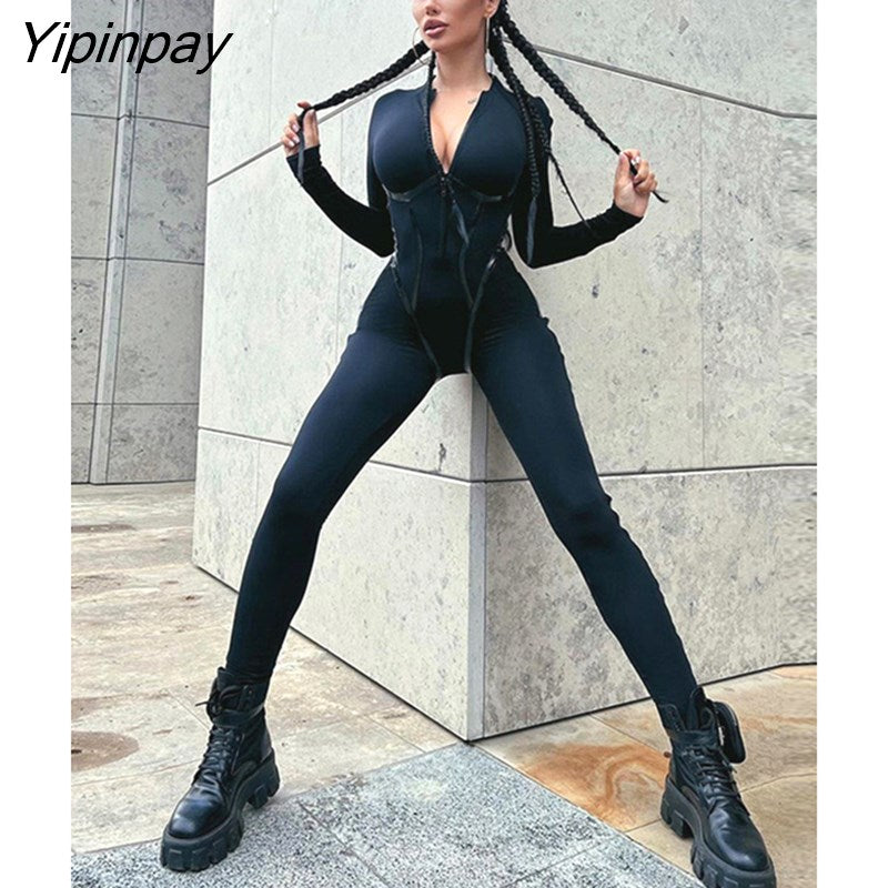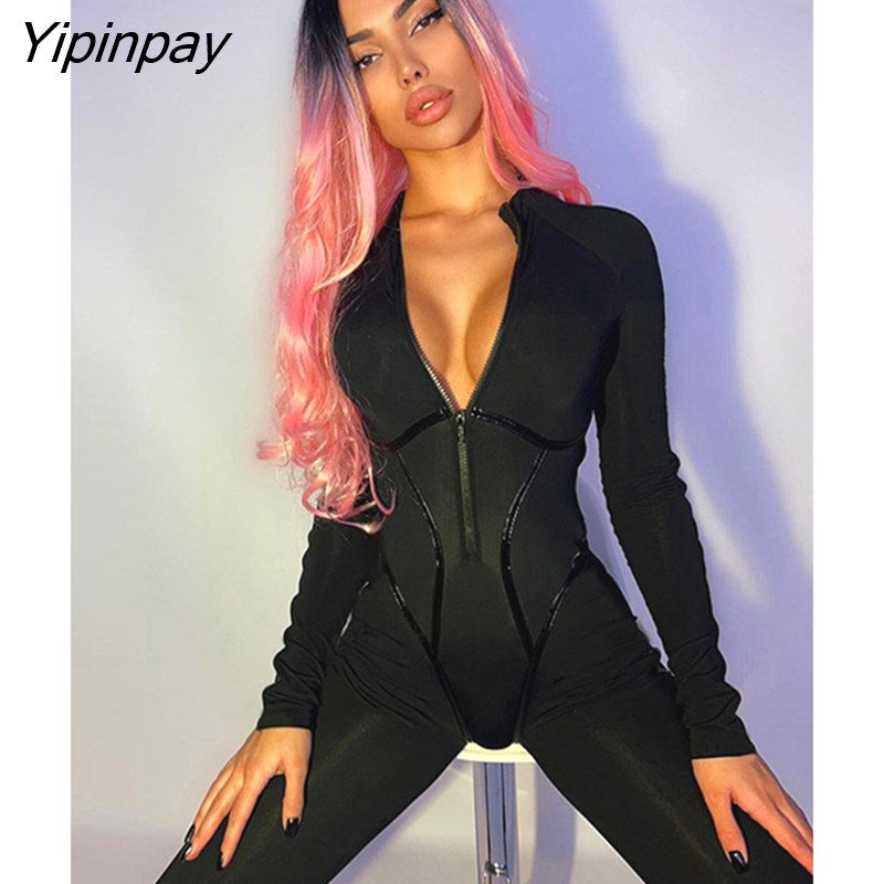Yipinpay Women Long Sleeve Bodycon Black Jumpsuit Sexy Patchwork Pu One Piece Legging 2023 Female Zipper Rompers Outfit Y2K Streetwear