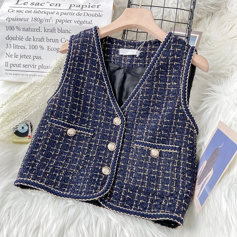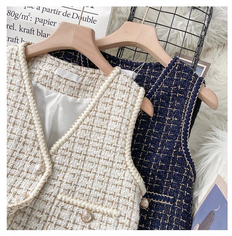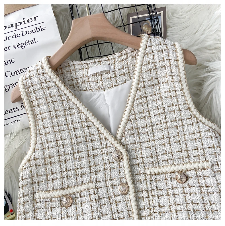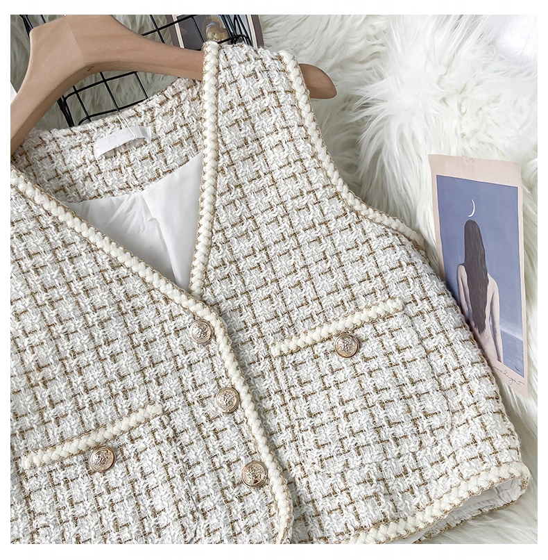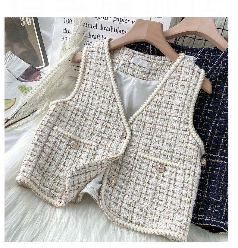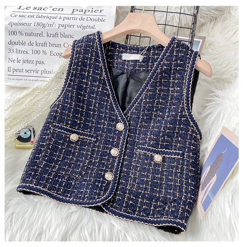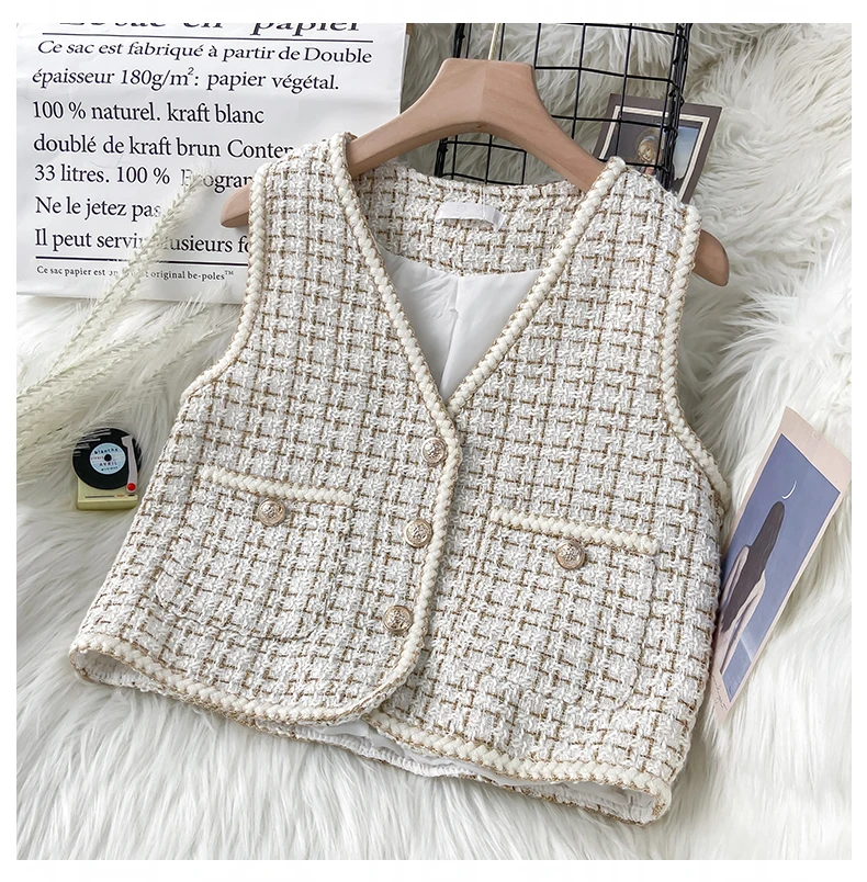 Yipinpay Women New Autumn Tweed Elegant Vintag Vest V-neck Sleeveless Slim Pockets Waistcoat Ladies Fashion Womens Short Small Vest