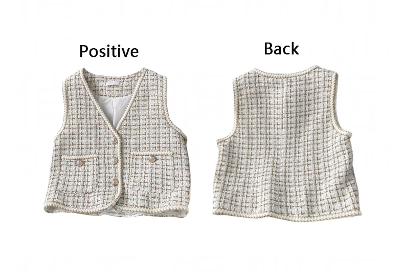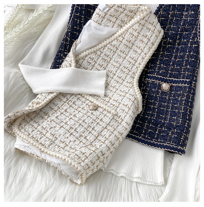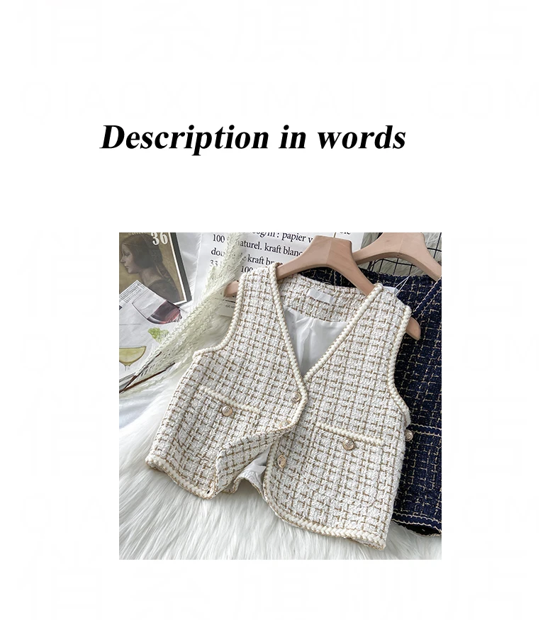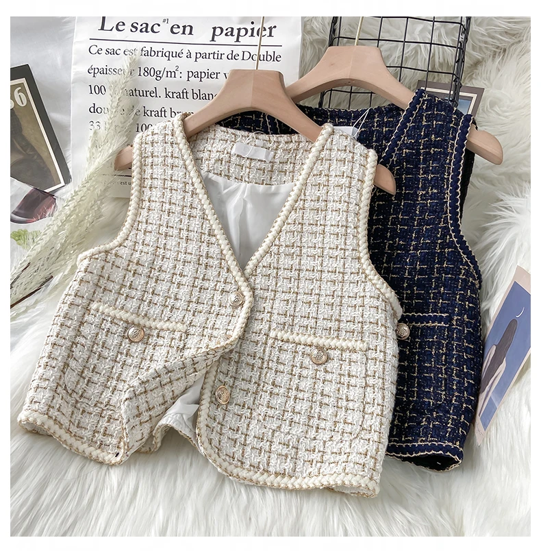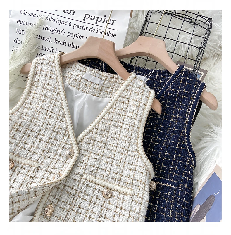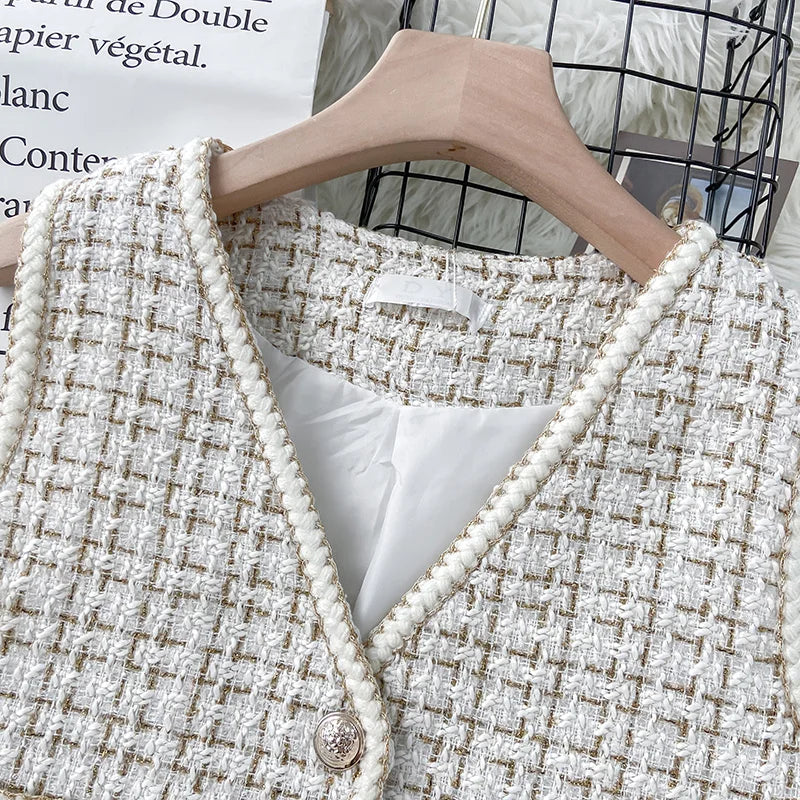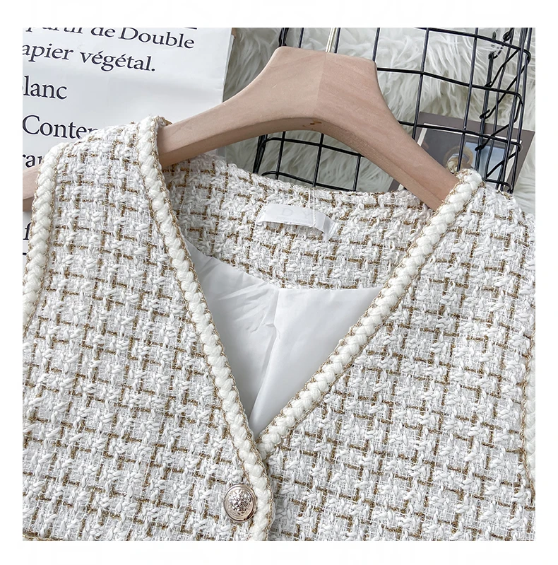 Yipinpay Women New Autumn Tweed Elegant Vintag Vest V-neck Sleeveless Slim Pockets Waistcoat Ladies Fashion Womens Short Small Vest