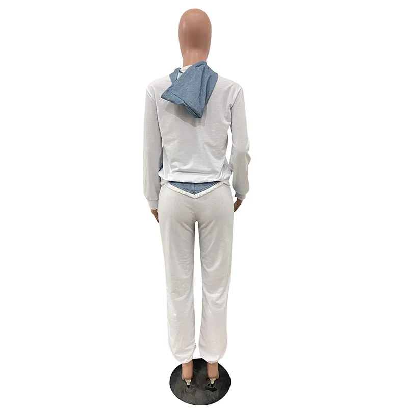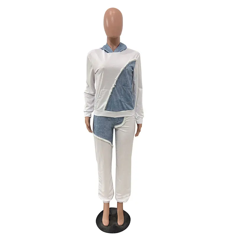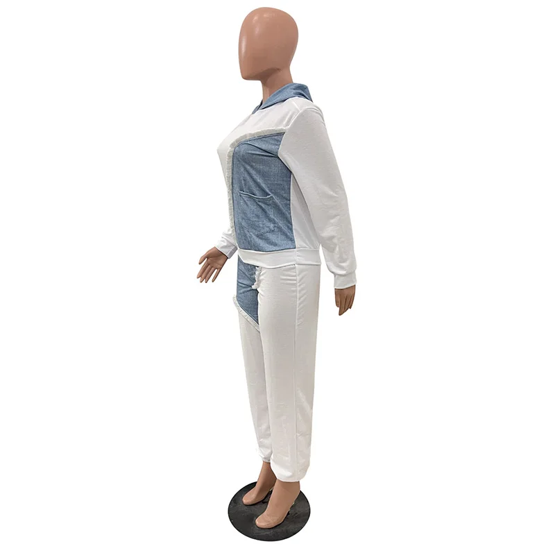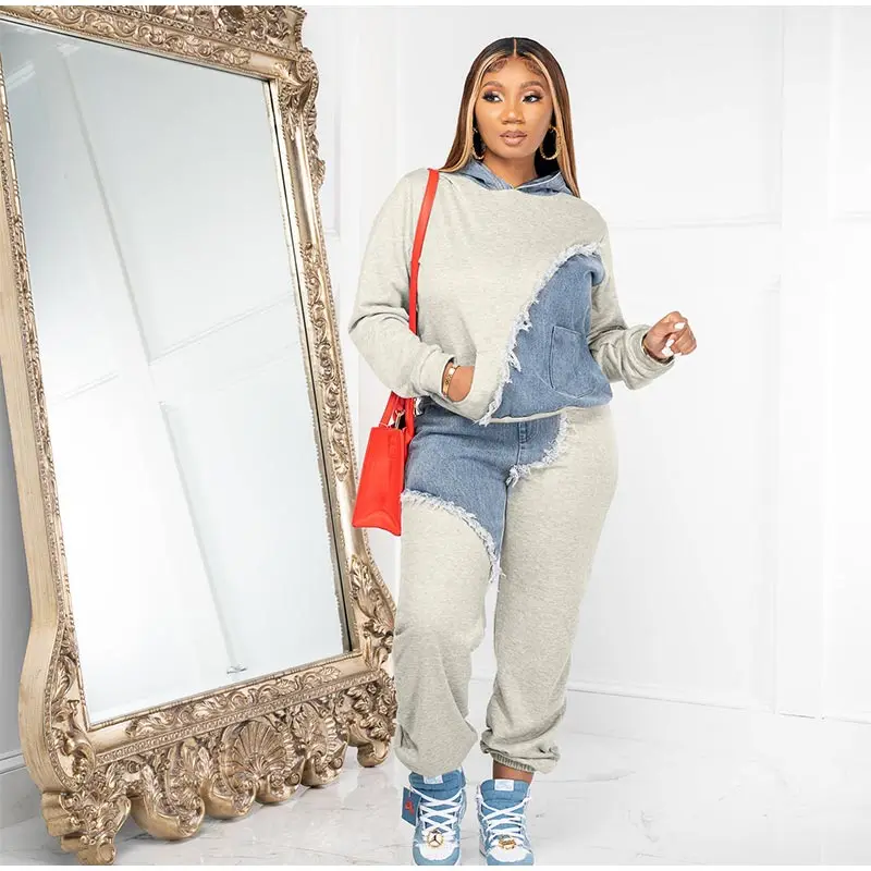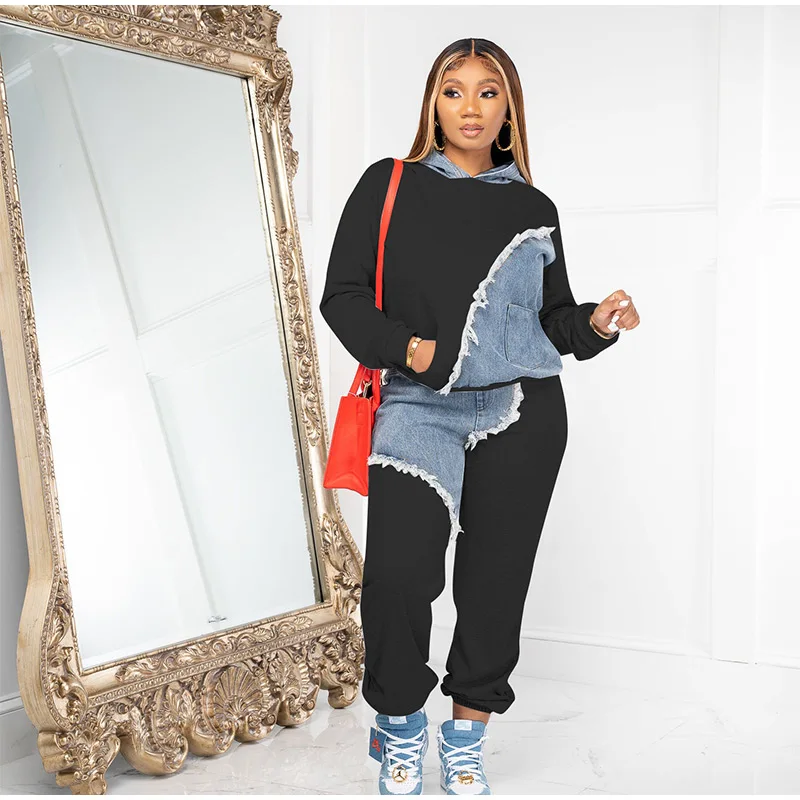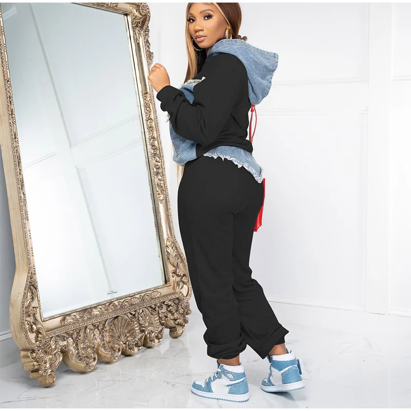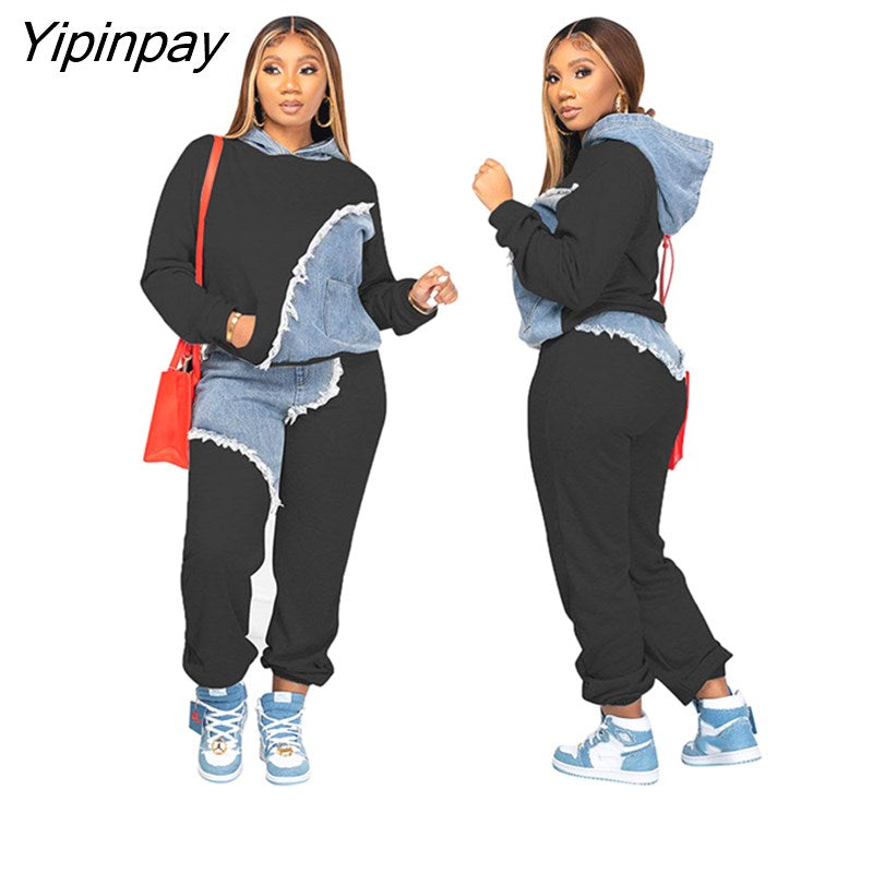 Yipinpay Women Patchwork Denim Panel Tracksuit Set Long Sleeve Hooded Sweatshirt Running Pants Suit 2023 Autumn Fashion Casual Sportswear