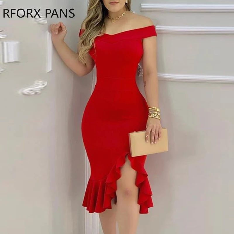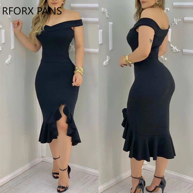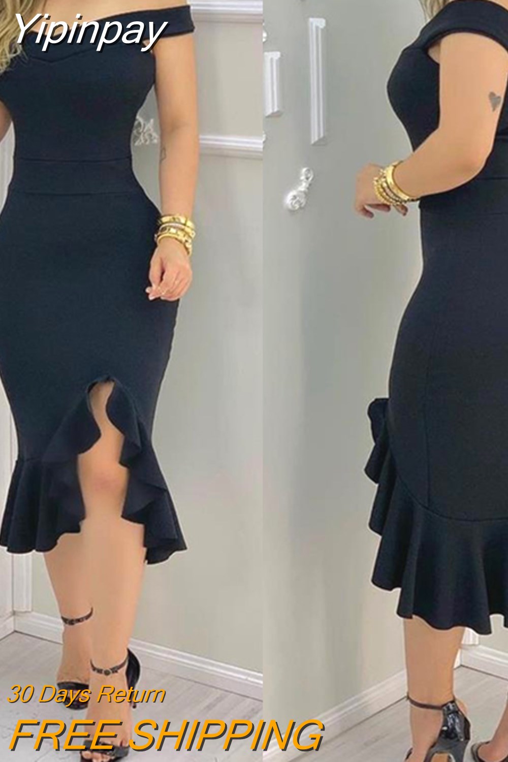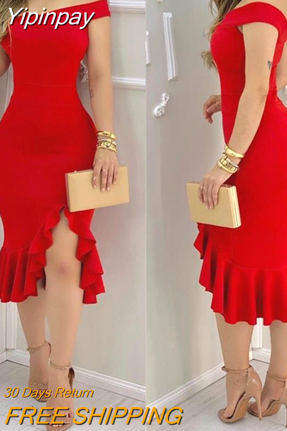 Yipinpay Women Plain Off Shoulder Ruffle Hem Slit Dress Maxi Dress Bodycon Dress Sexy Dress for Women