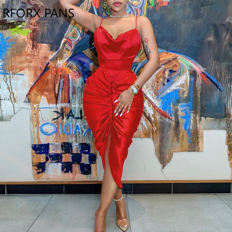 Yipinpay Women Plain Spaghetti Strap Slit Ruched Maxi Dress Bodycon Dress Sexy Dress for Women