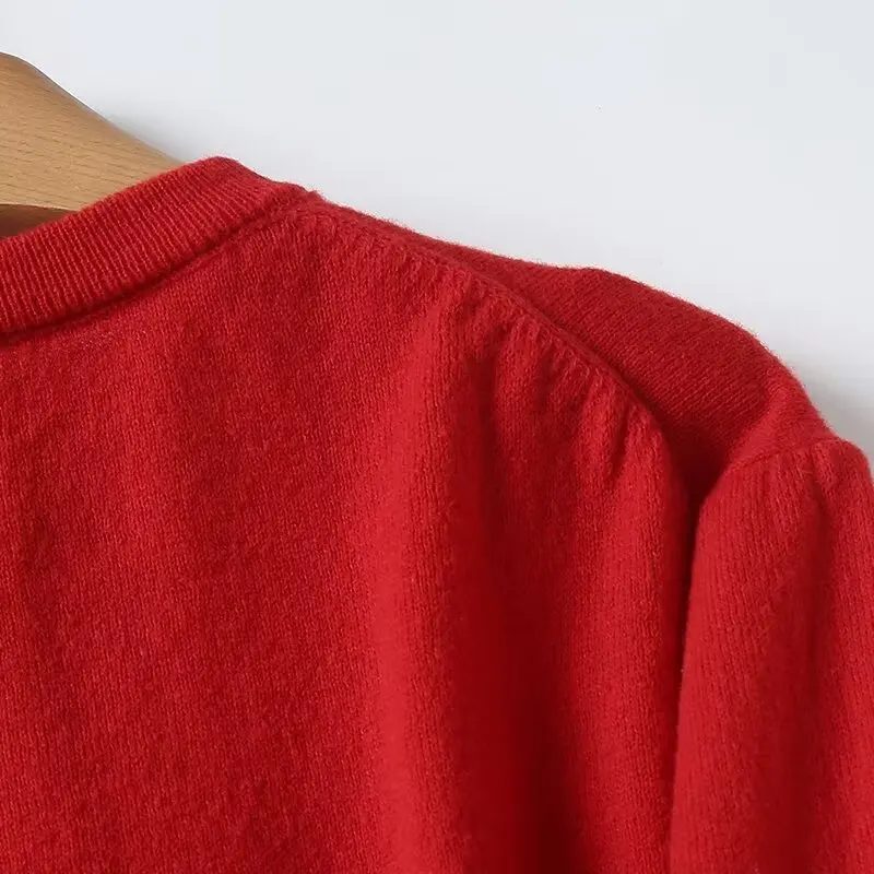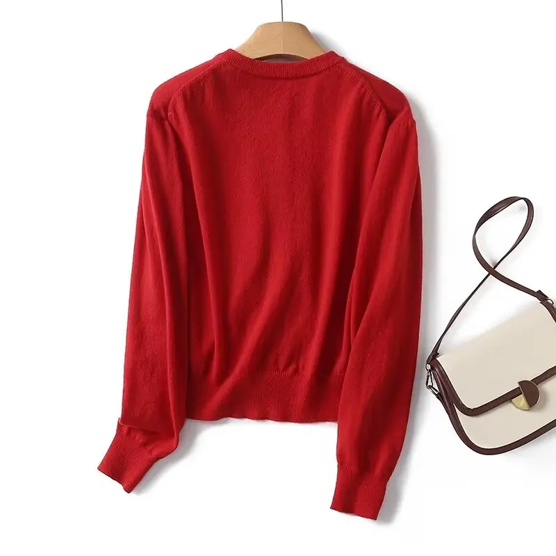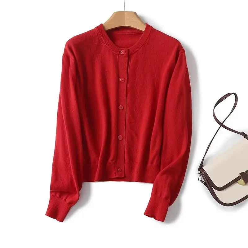 Yipinpay Women Red Knit Crop Cardigan Long Sleeve O Neck Single Breasted Female Sweater Coat
