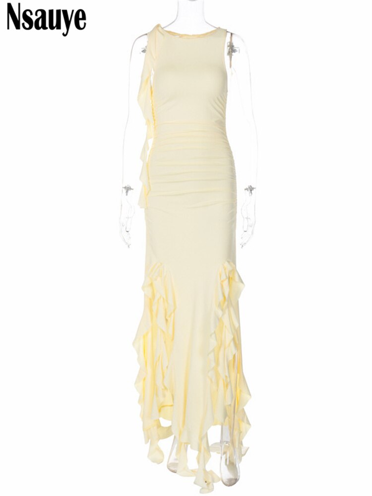 yipinpay Women Ruffles Sexy Long Y2K Dress Fashion Summer Beach Casual 2023 Sleeveless O Neck Party Club Maxi Dress Outfits