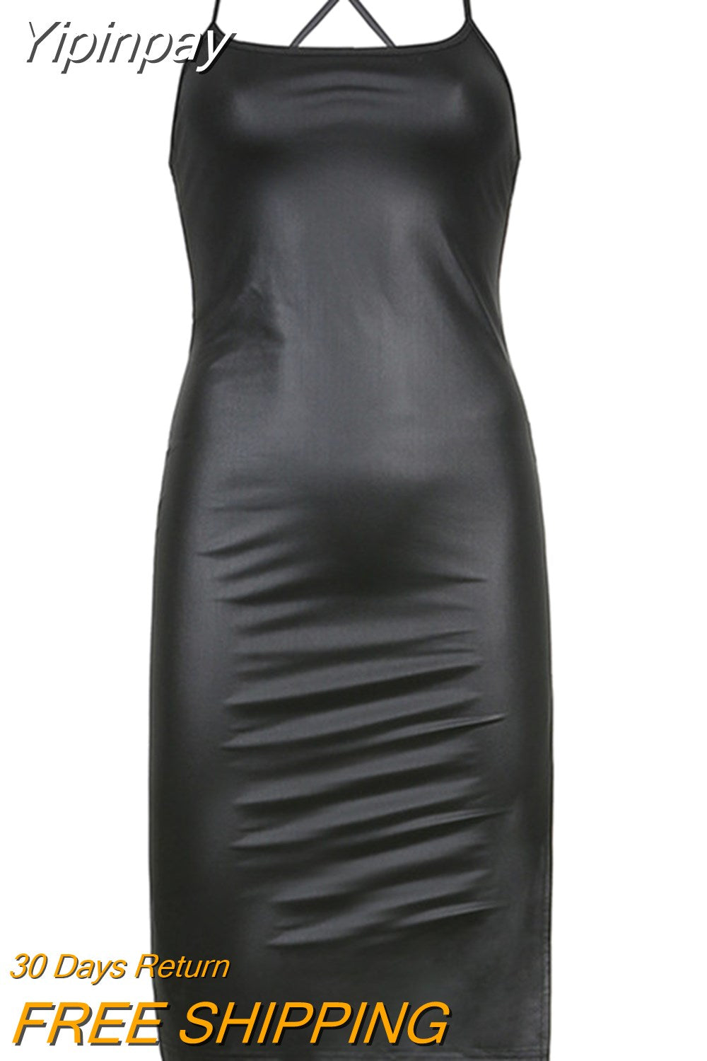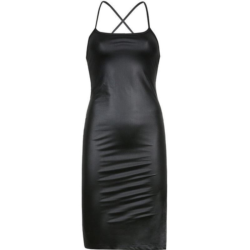 Yipinpay Women‣s Sexy Suspender Mid-length Dress PU Fashion Solid Color Leather Bandage Backless Skinny Split Bodycon Dress Summer